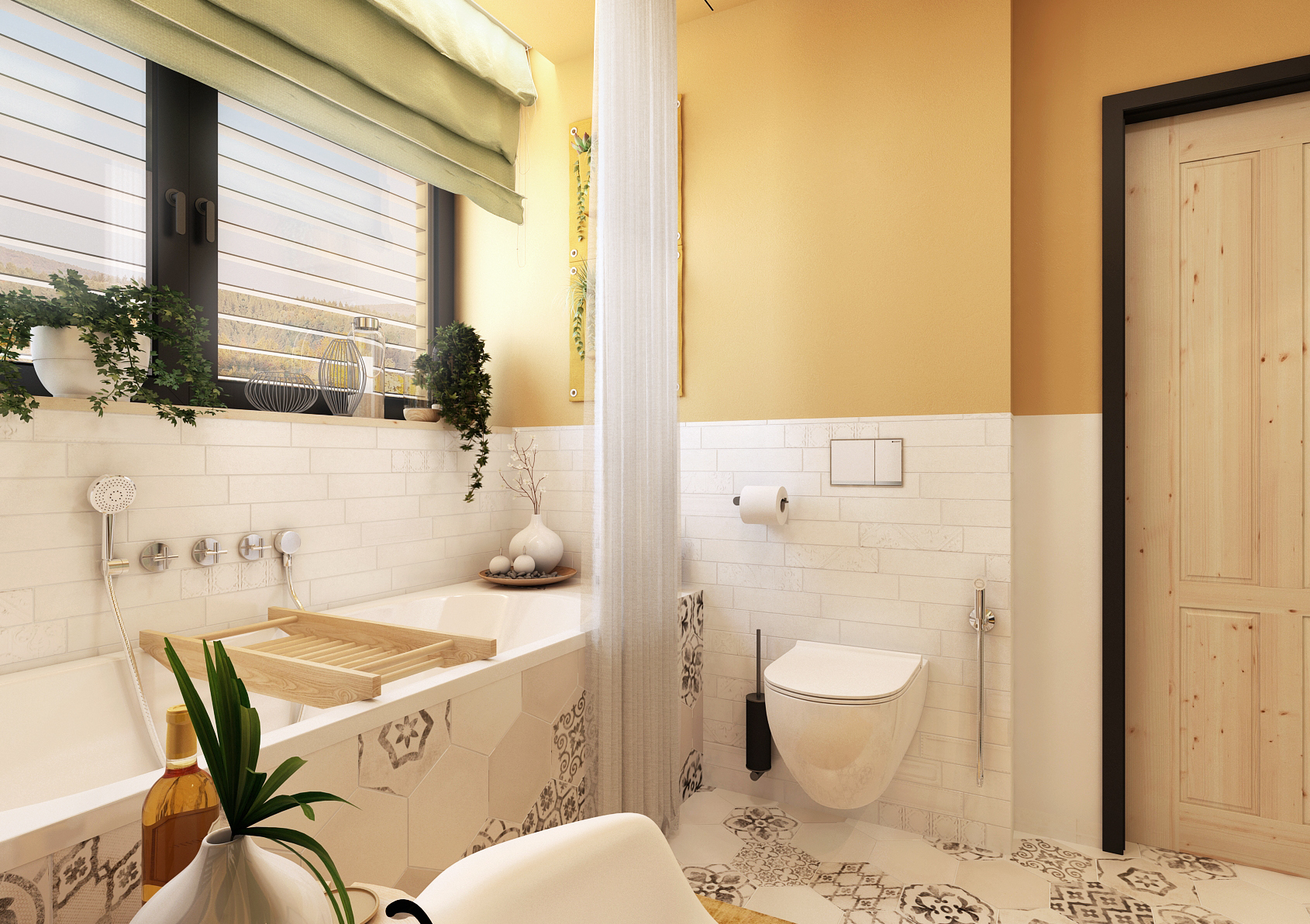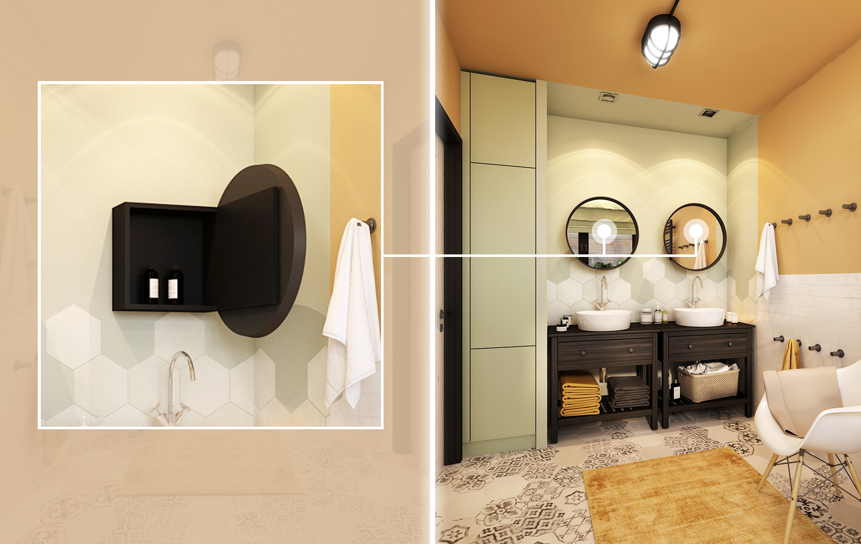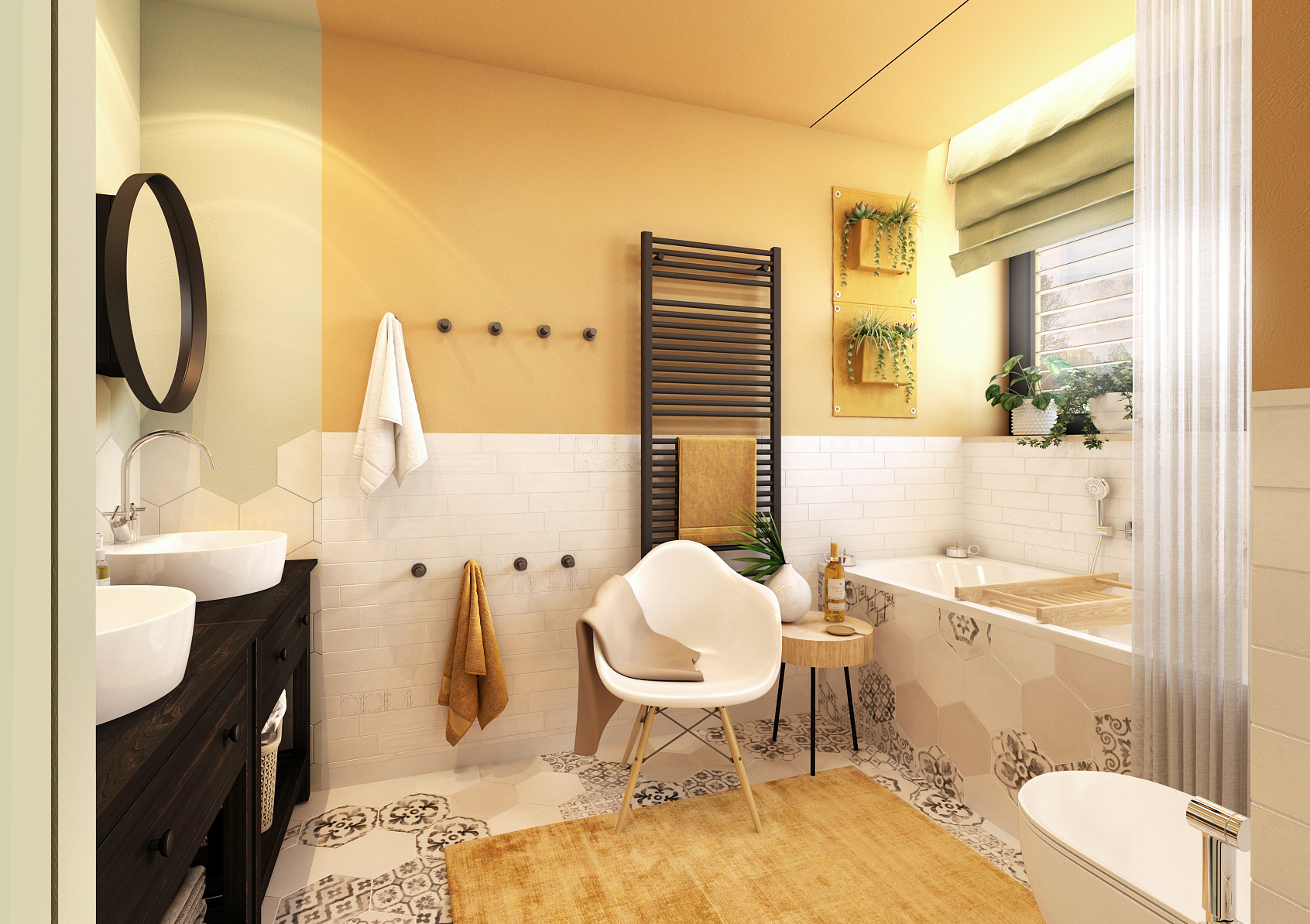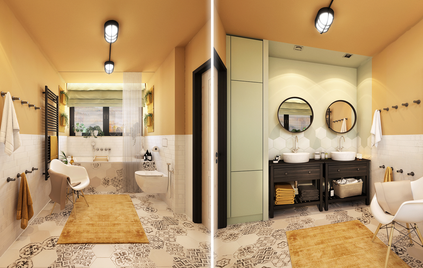 Žlutá varianta se může pyšnit hlavně vzorovanou mozaikou na hexagonové dlažbě, která pokračuje do obkladu kolem vany. Se zářivě žlutou zde kontrastují černé doplňky. Bezúchytová vysoká skříňka u zrcadla slouží jako dostatečný úložný prostor pro potřebné věci. Pokud by ho však přece jen bylo málo a nestačily ani šuplíky a police pod umyvadly, za zrcadly se nachází ještě skryté skříňky, které se objeví po jejich otevření.