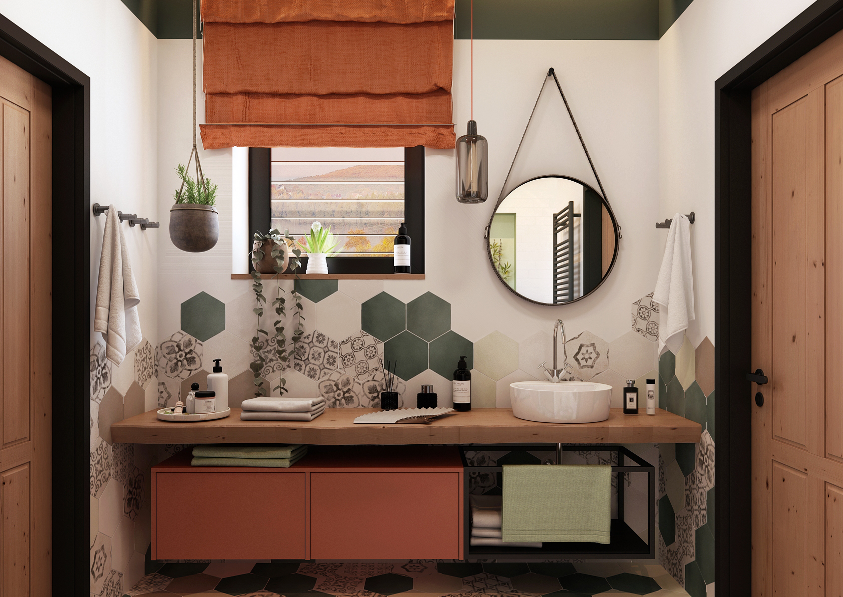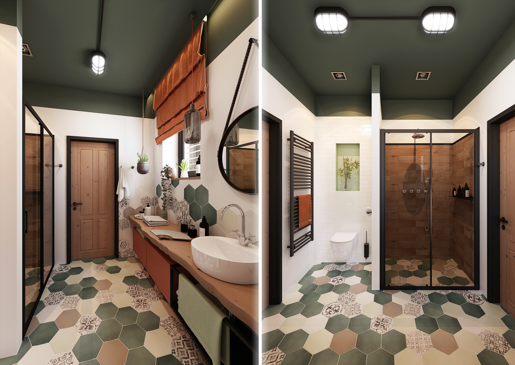Červené variantě opět dominují černé prvky, je zde však kombinace s tmavě zelenou, která se nachází i na výmalbě stropu. Ani zde není výjimkou hexagonová dlažba přecházející do obkladu za umyvadly spolu s květinovými vzory.