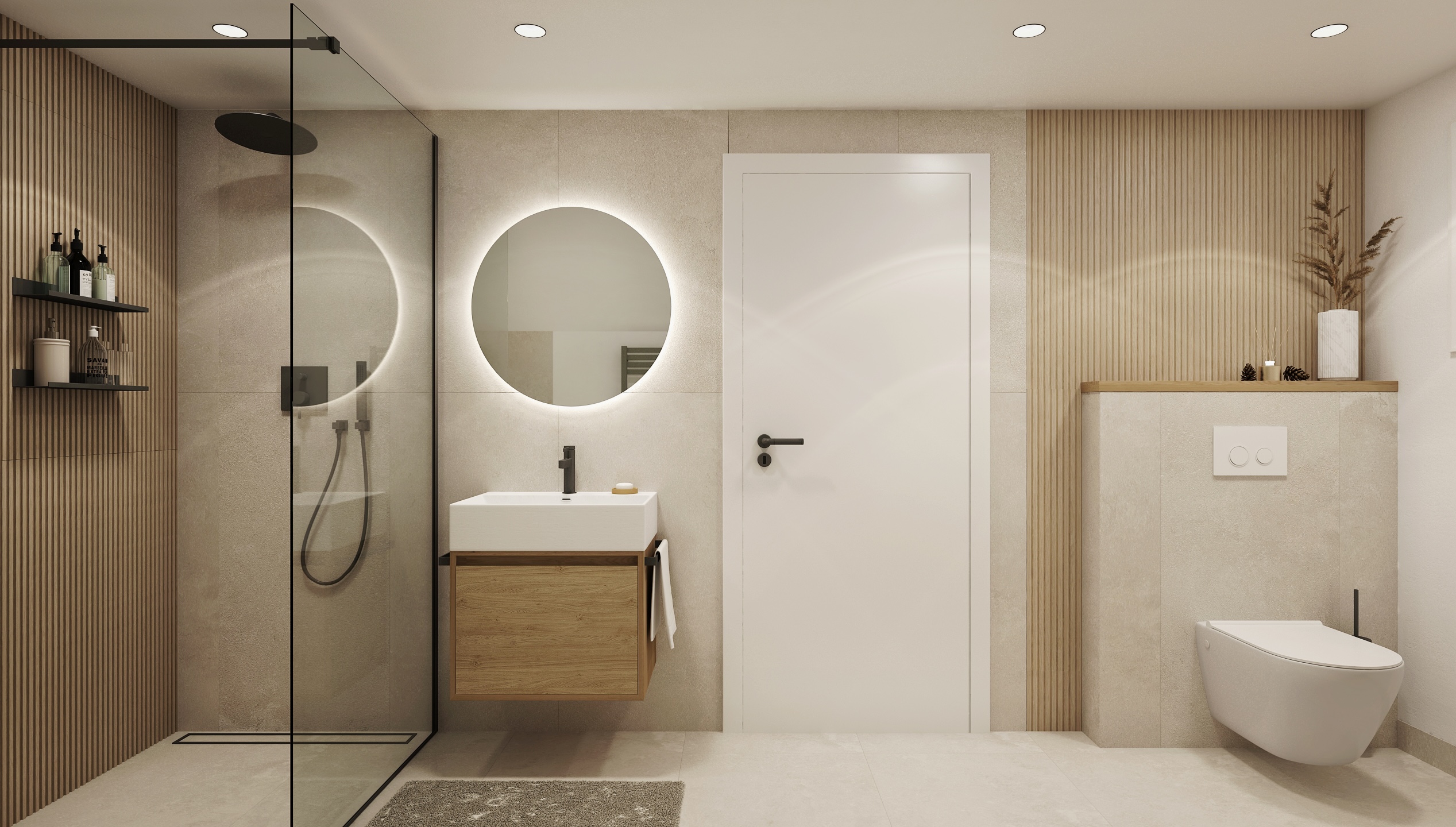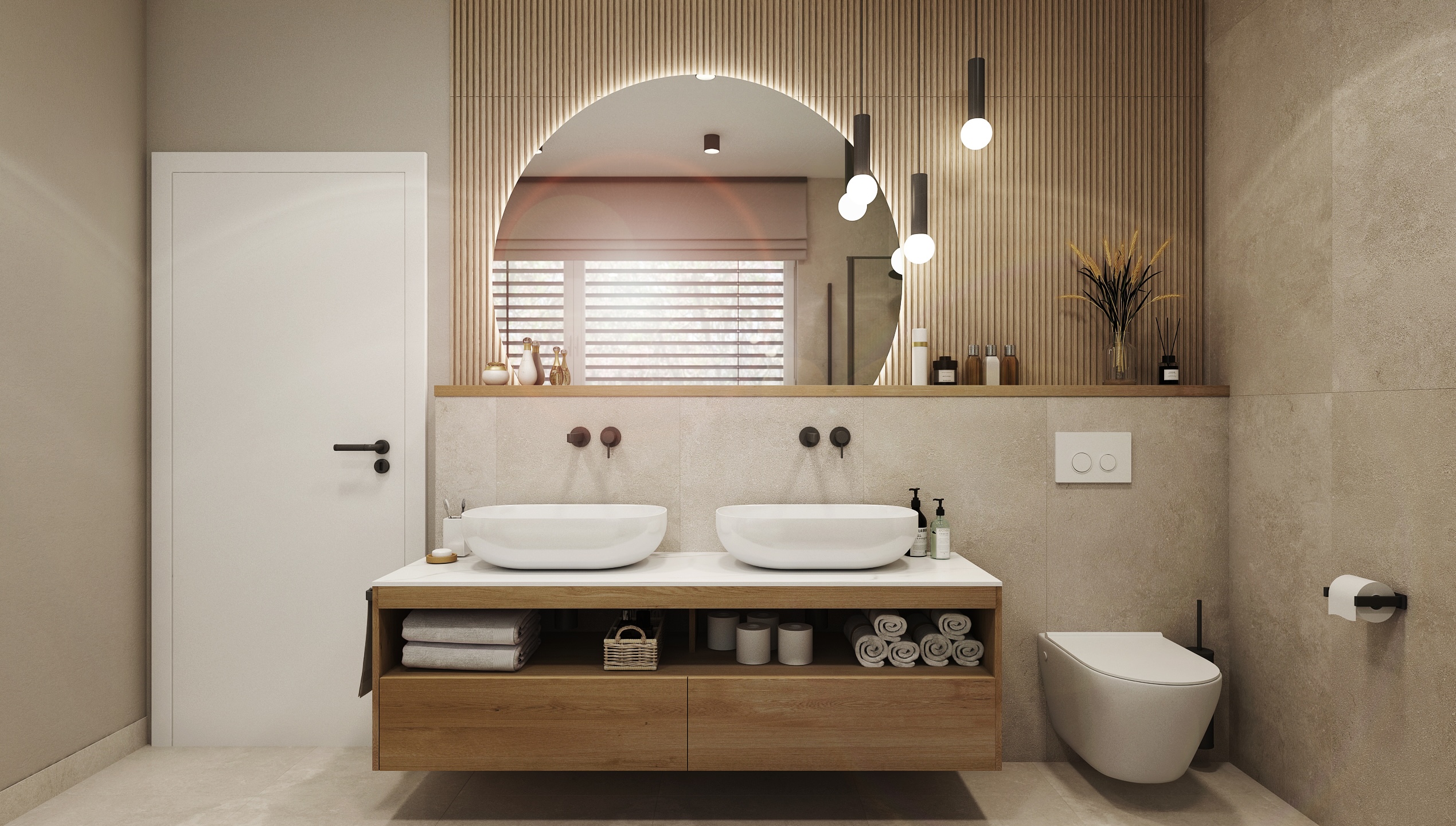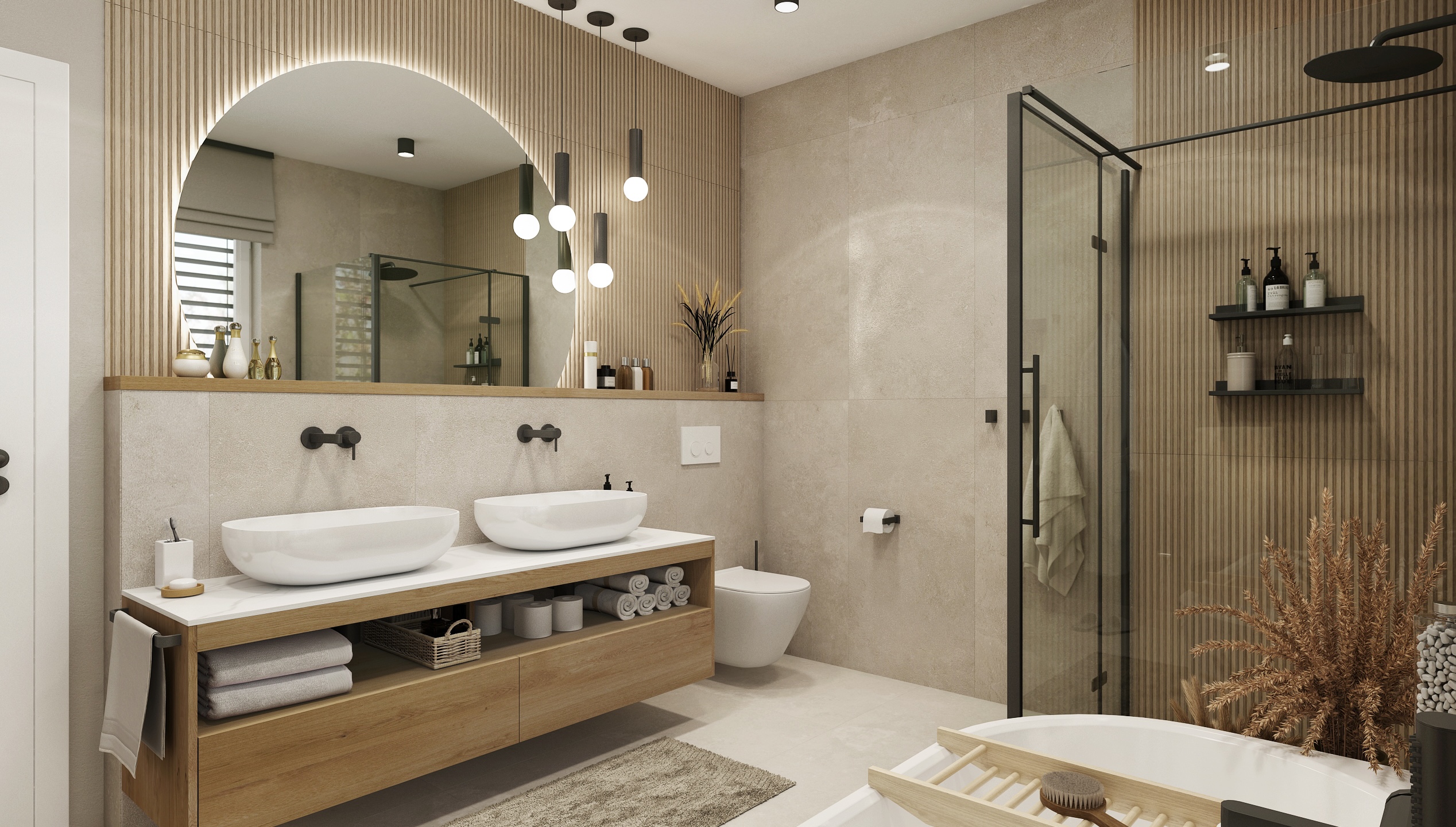 Kombinace keramických obkladů a dřevěných prvků působí teple a přirozeně, čímž prostor připomíná domácí wellness. Dominantou místnosti je velké půlkruhové zrcadlo s podsvícením, doplněné o dvojici elegantních umyvadel. Minimalistické černé baterie a závěsné osvětlení dodávají prostoru moderní kontrast a jemný luxusní nádech.