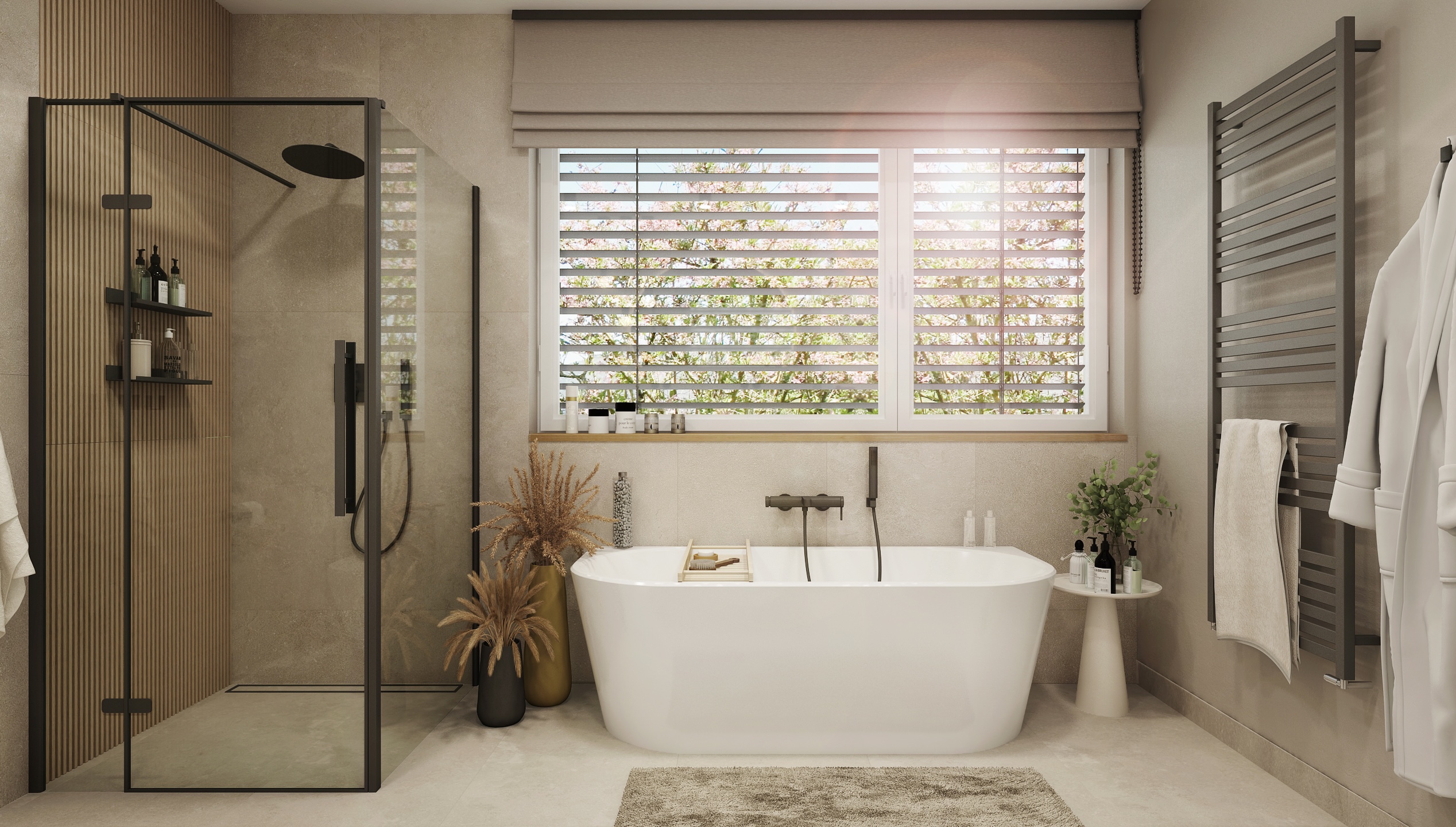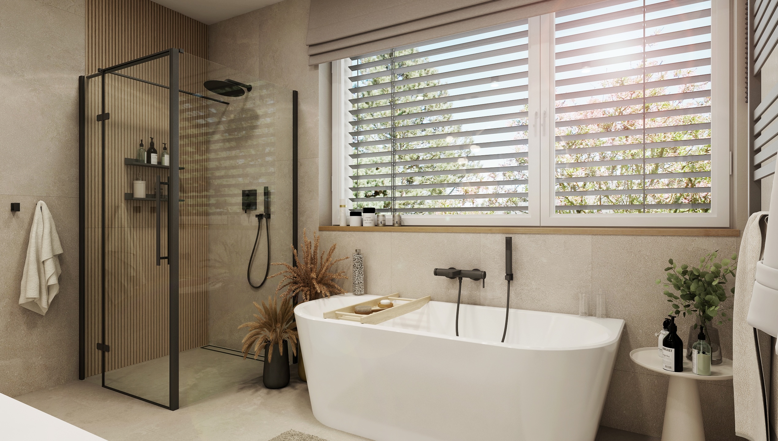 Součástí koupelny je prostorná vana umístěná pod oknem, která láká k odpočinku po náročném dni. Praktický sprchový kout s prosklením a černými rámy doplňuje funkčnost celého prostoru, zatímco dekorace z přírodních materiálů umocňují jeho útulnost.