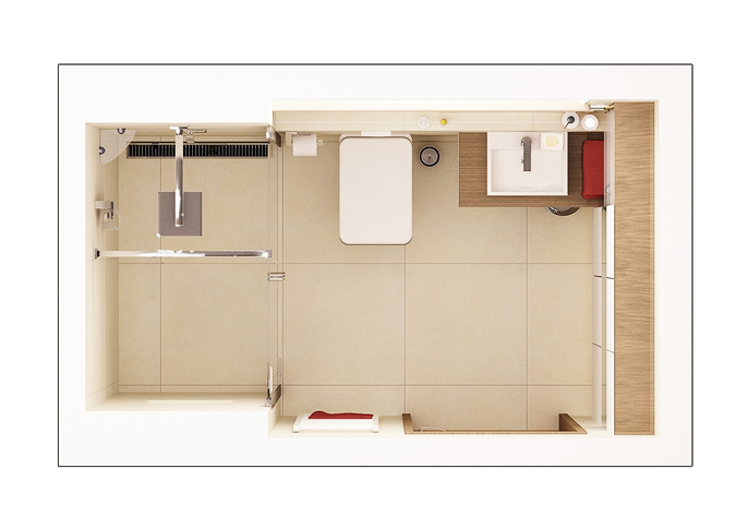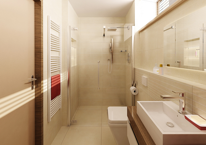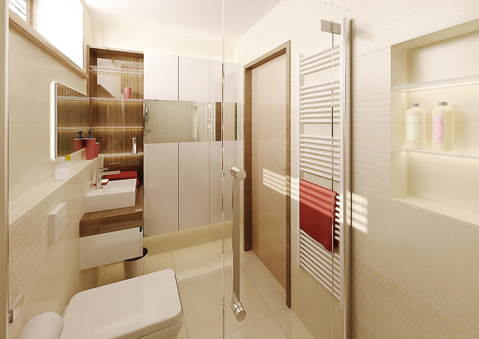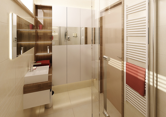 Malá koupelna zařízená obklady View od Atlas Concorde. Pult s umyvadlem i zrcadlo se elegantně prolíná s kompaktním úložným prostorem za dveřmi. Nábytek je řešen v bílém laku a laminu wenge. Prosklený sprchový kout opticky zvětšuje prostor.