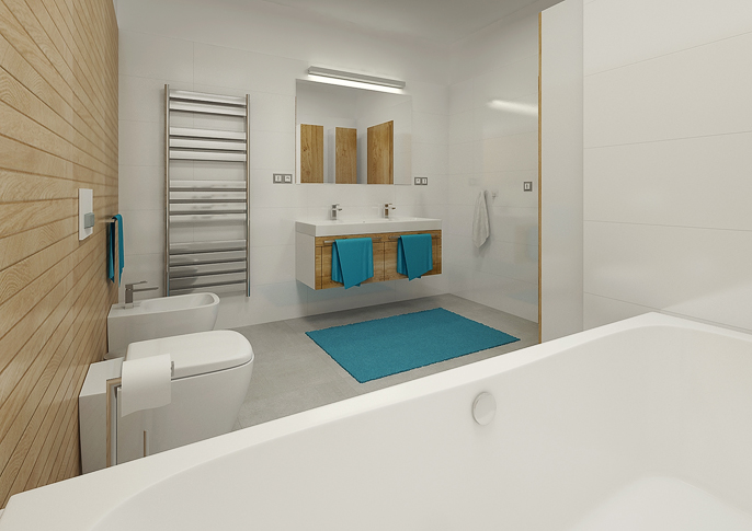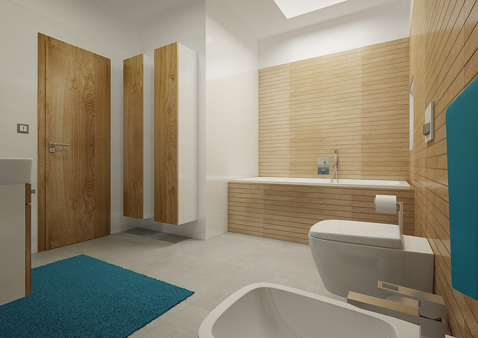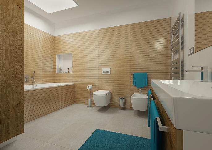 Rodinná koupelna v čistém designu s obkladem imitující dekor dřeva. O skvělou iluzi dřevěných latěk se postarají keramické obklady španělské firmy Porcelanosa. Propracovaný efekt dřeva je docílen použitím více textur v jedné sérii.
