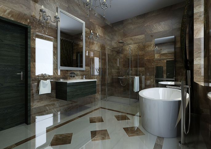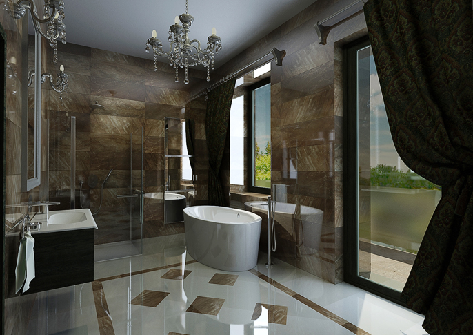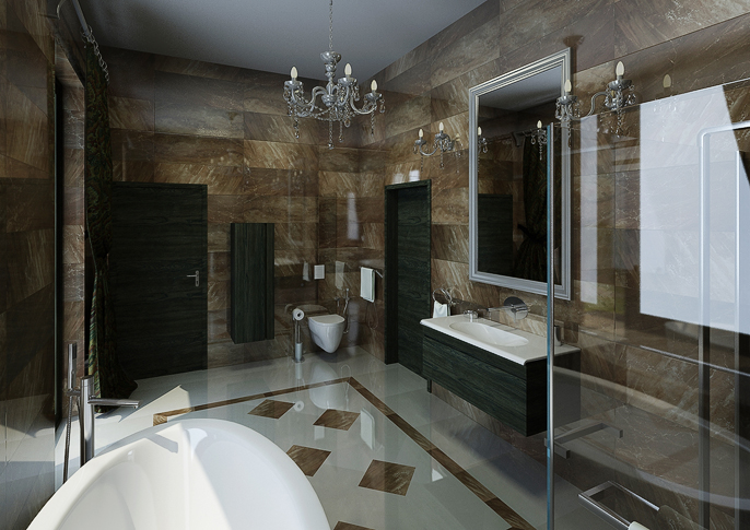 Moderní koupelna s historizujícimi doplňky je vybyvena luxusními leštěnými obklady na podlaze tvořící zajímavou skladbu. Vedle moderní sanity od firmy Design Bath je interiér koupelny doplněn o křišťálová světla a historizující velké zrcadlo.