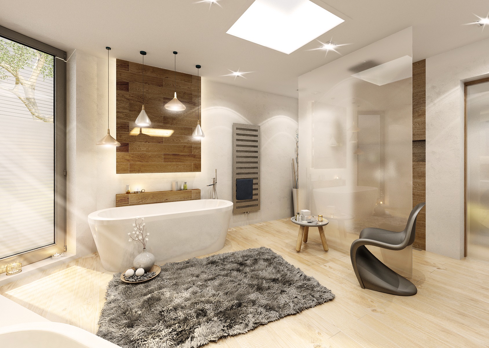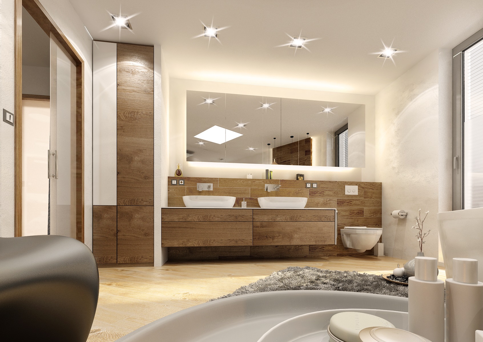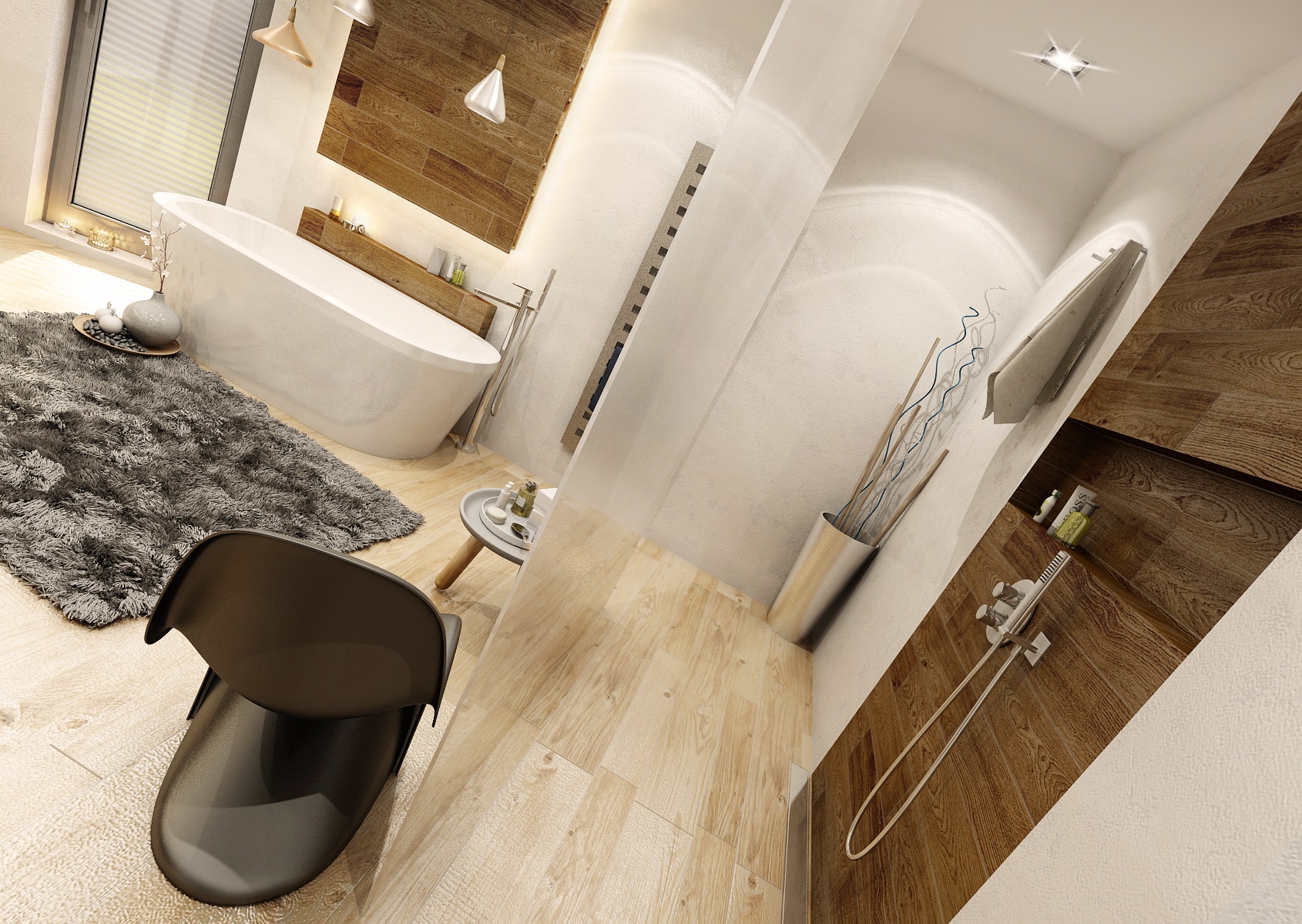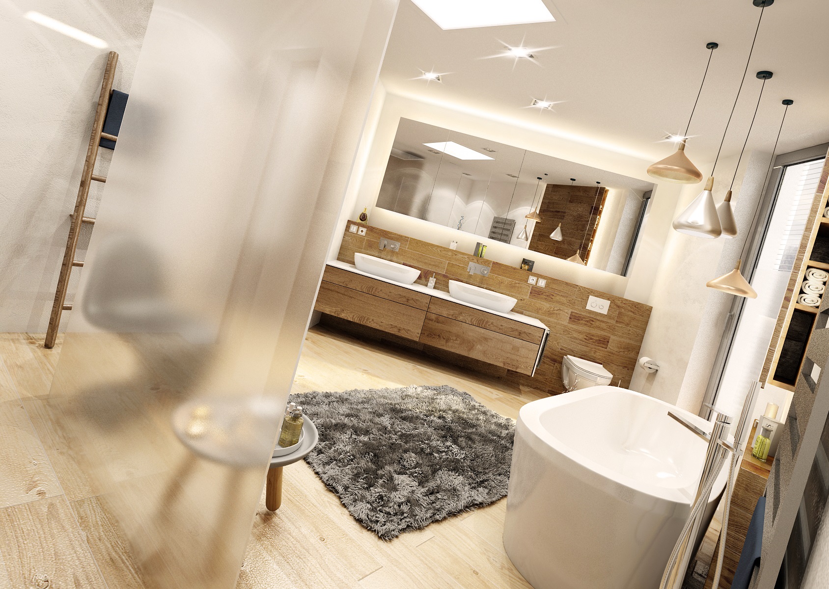 Luxusně prostorná koupelna s volně stojící oválnou vanou a walk-in sprchovým koutem se zástěnou z pískovaného skla. Keramické obklady a dlažba je zastoupena pouze v podobě dřevodekoru na podlaze a pásek u vany, sprchy a umyvadel. Jinak jsou stěny koupelny ošetřeny voděodolnou bílošedou stěrkou.