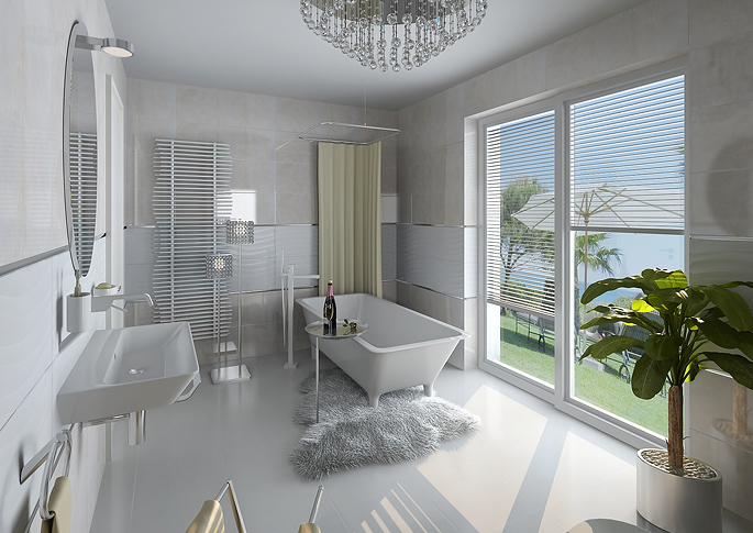 Luxusní koupelna s velkými francouzskými okny, které místnost dostatečně prosvětlují a umožňují výhled na zahradu. Interiér je sladěný do světlých odstínů v kombinaci se zlatými dekoracemi. Prostor působí moderně a jednoduše. Zajímam prvkem v této místnosti je honosný lustr.