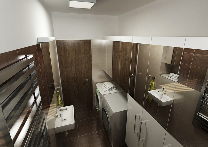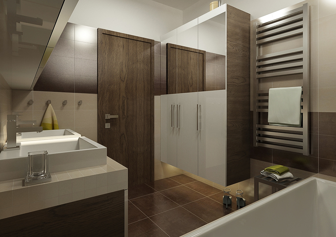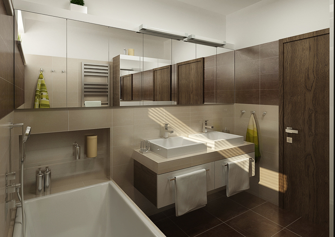 Návrh prostorné koupelny se dvěma umyvadly užívá matné dlažby zemitých barev, korespondující s dřevěnou dýhou dveří, a zavěšeného nábytku pro snadnější údržbu podlahy. Interiér v kombinaci s dekorem dřeva působí moderně. Čistý design zajišťují hranaté prvky vybavení v bílé barvě. Široké zrcadlo prostor opticky zvětšuje.