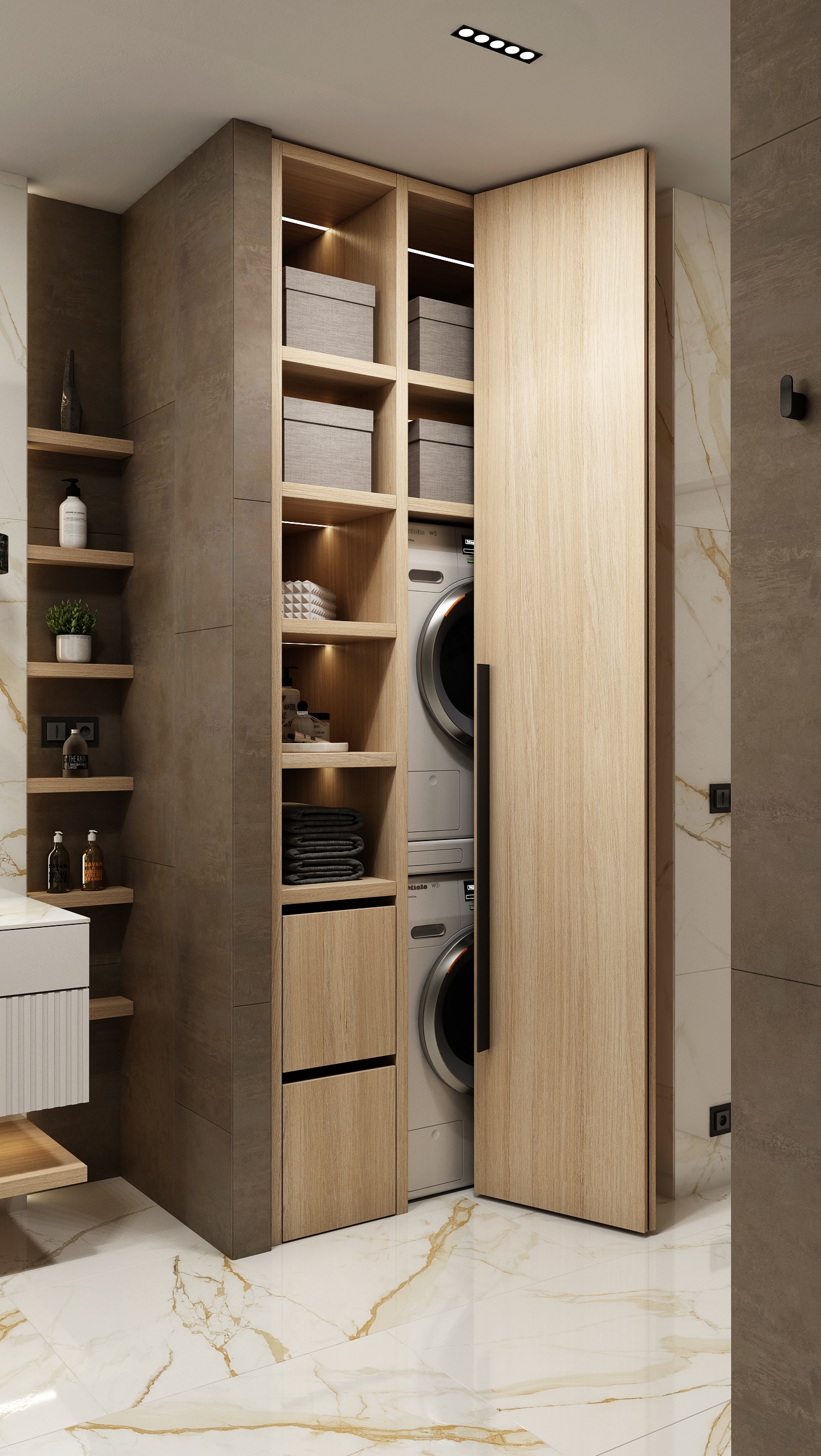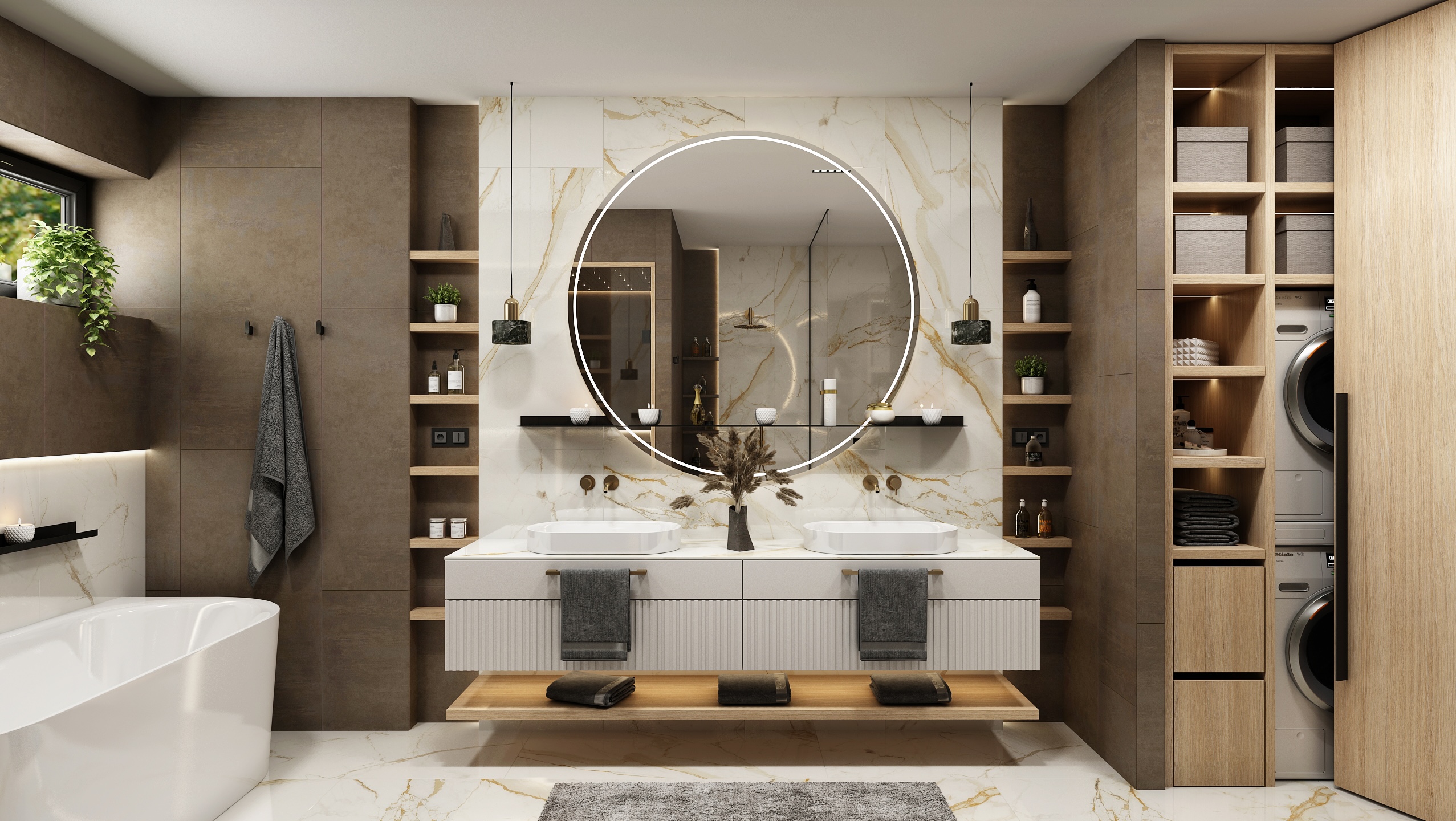 Umyvadlová část se dvěma umyvadly na zavěšené skříňce nabízí dostatek úložného prostoru i odkládací plochy. Nad umyvadly je kruhové zrcadlo s integrovaným podsvícením, které zajišťuje příjemné světlo pro každodenní péči. Dřevěné detaily v policích a rukojetích dodávají koupelně přírodní šmrnc a pocit útulnosti.