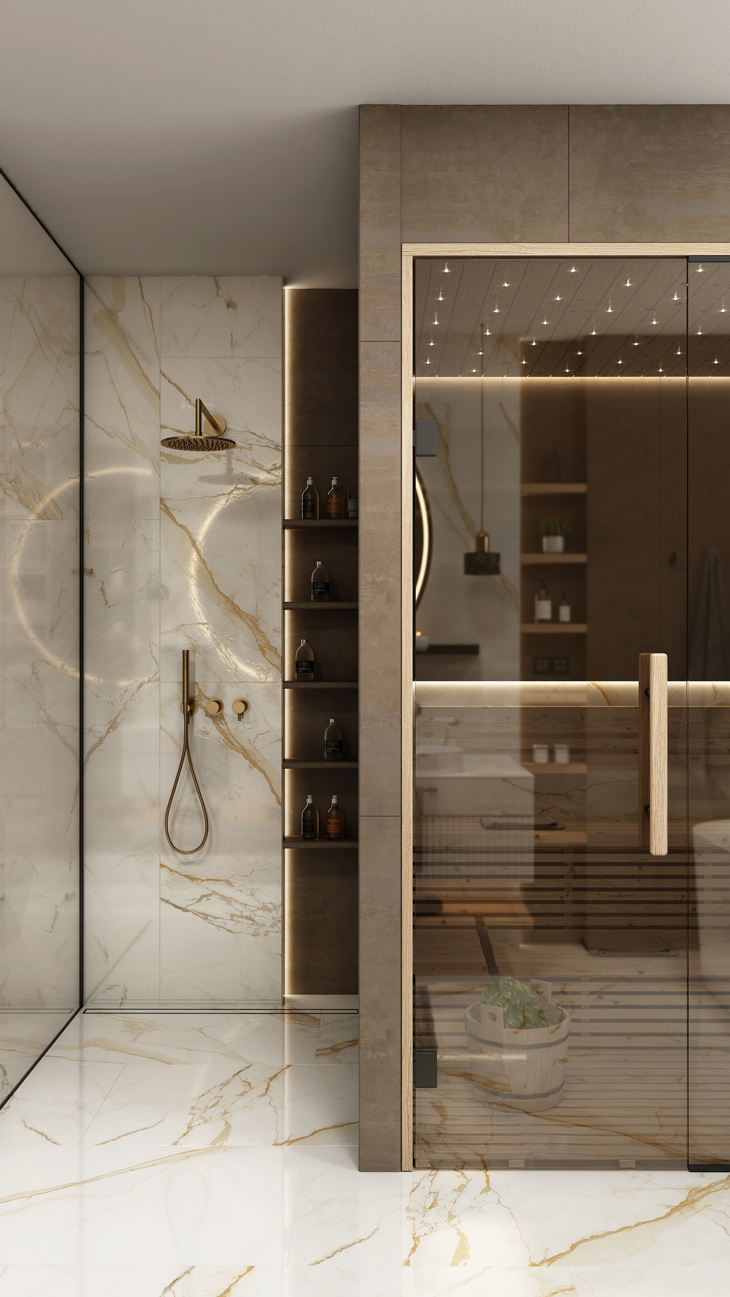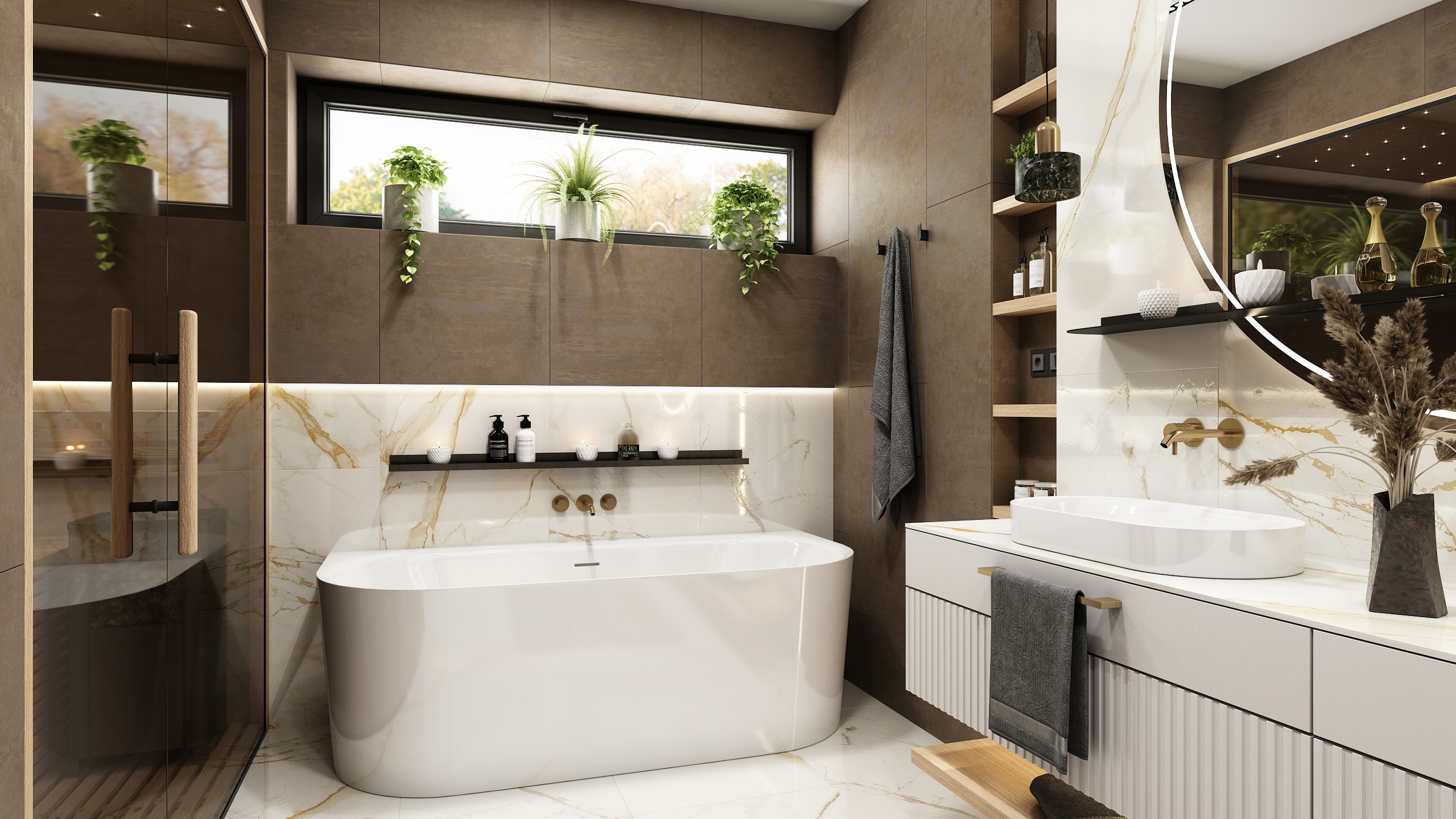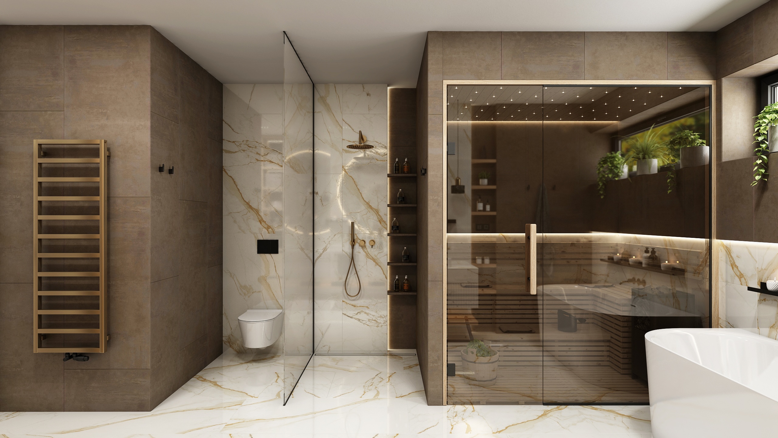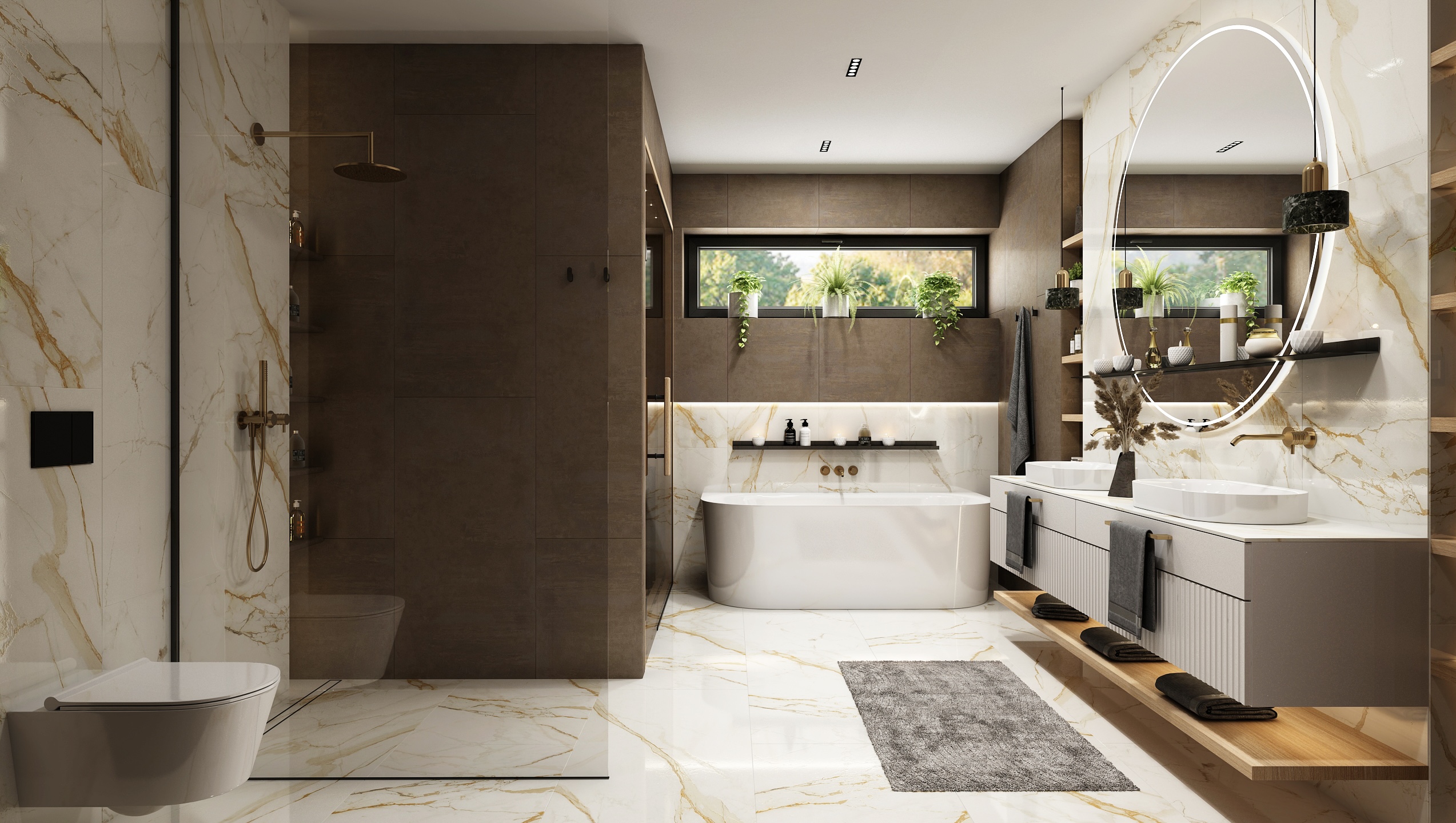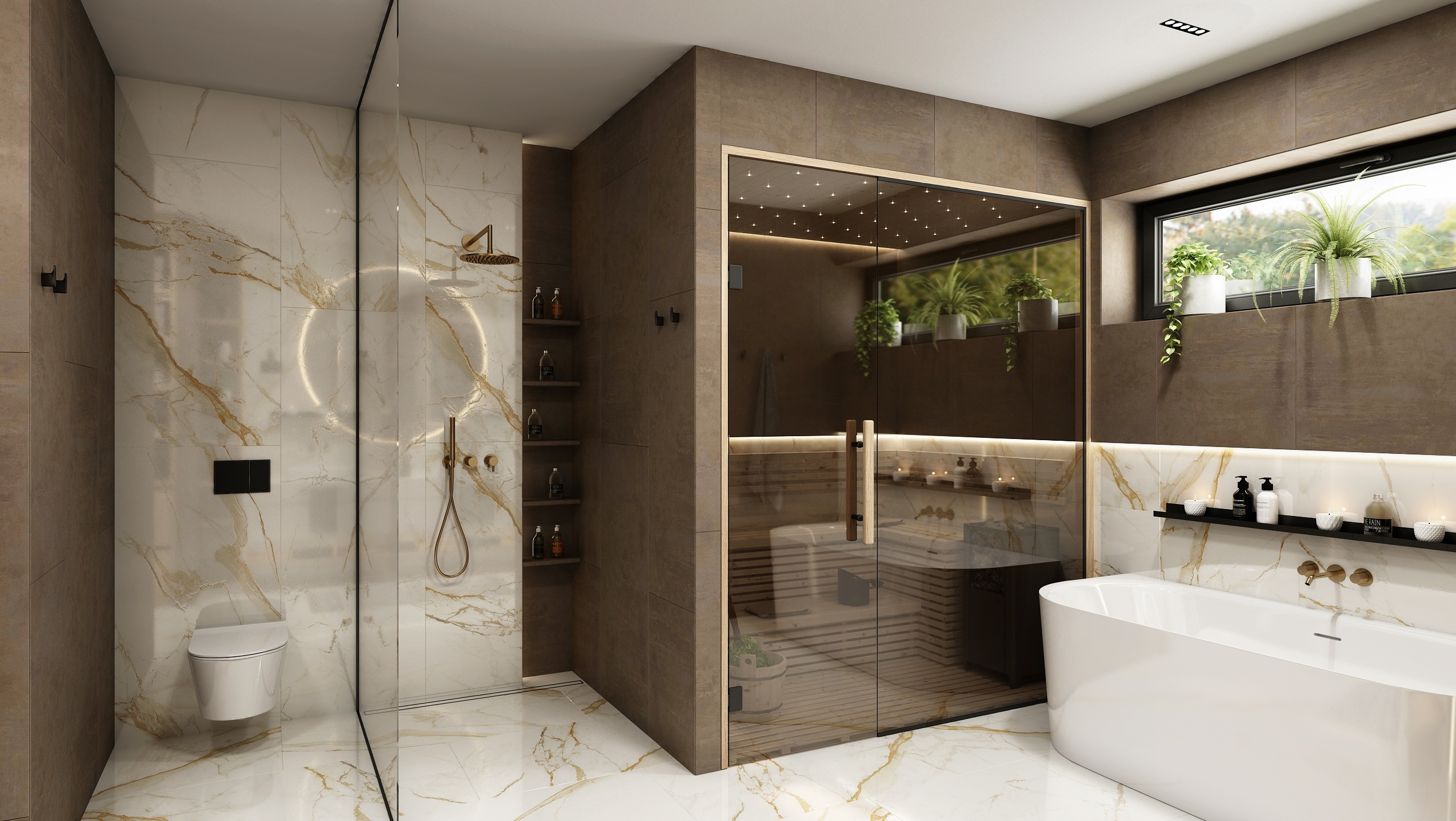 Interiér koupelny je tvořen elegantní kombinací světlého mramoru se zlatými žilkami a tmavších keramických obkladů.