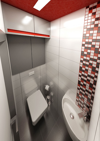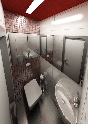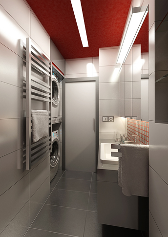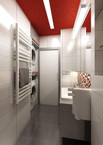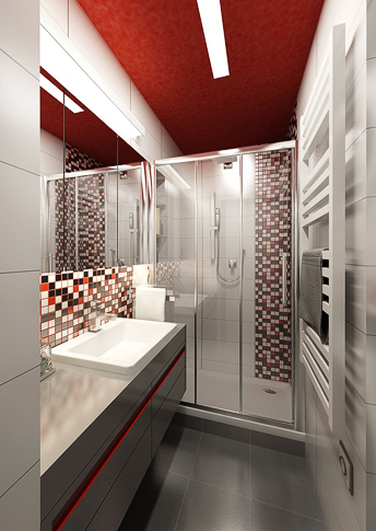 Koupelna, která se nachází v panelovém bytě, využívá daného minimálního prostoru. Místnost dekoruje červeno-bílý keramický obklad, malého formátu. Zavěšený nábytek usnadňuje údržbu a místnost tak působí o něco prostornější. Prosklený sprchový kout opticky zvětšuje místnost.