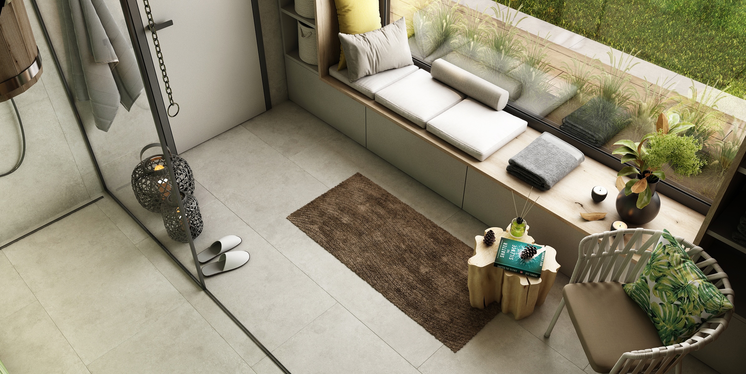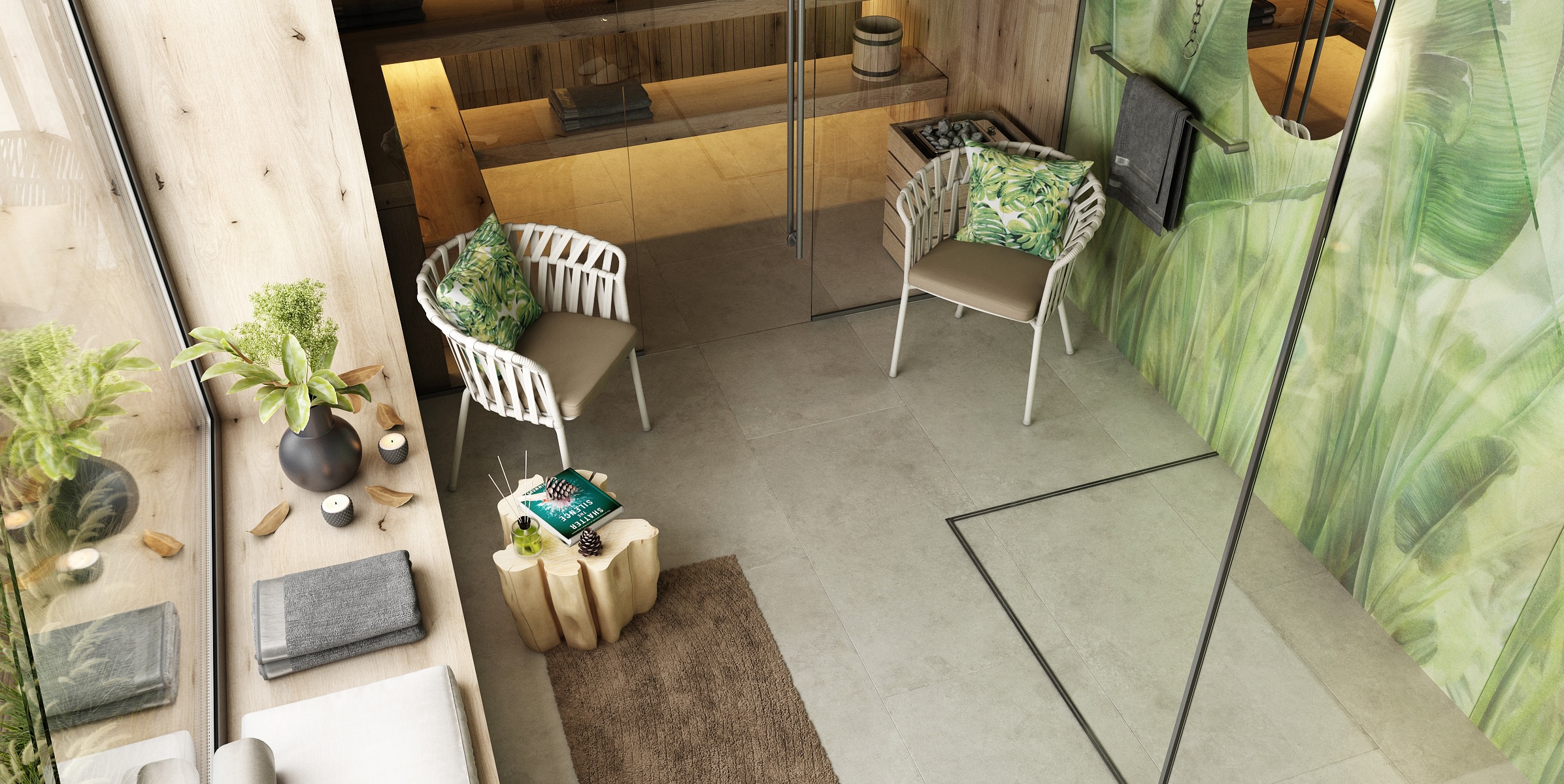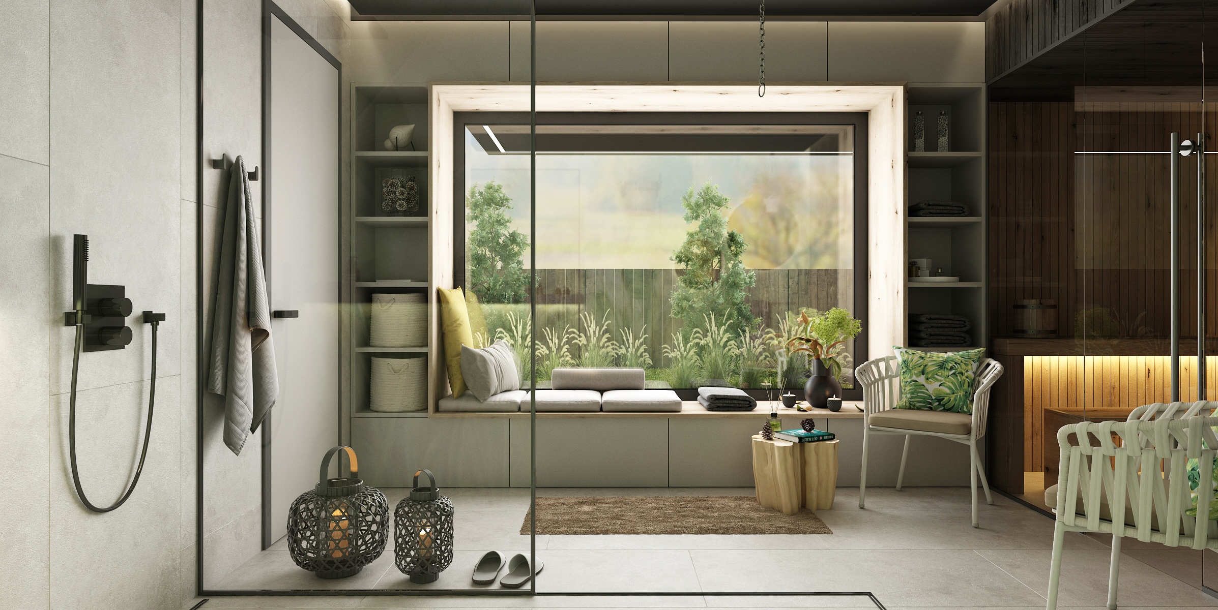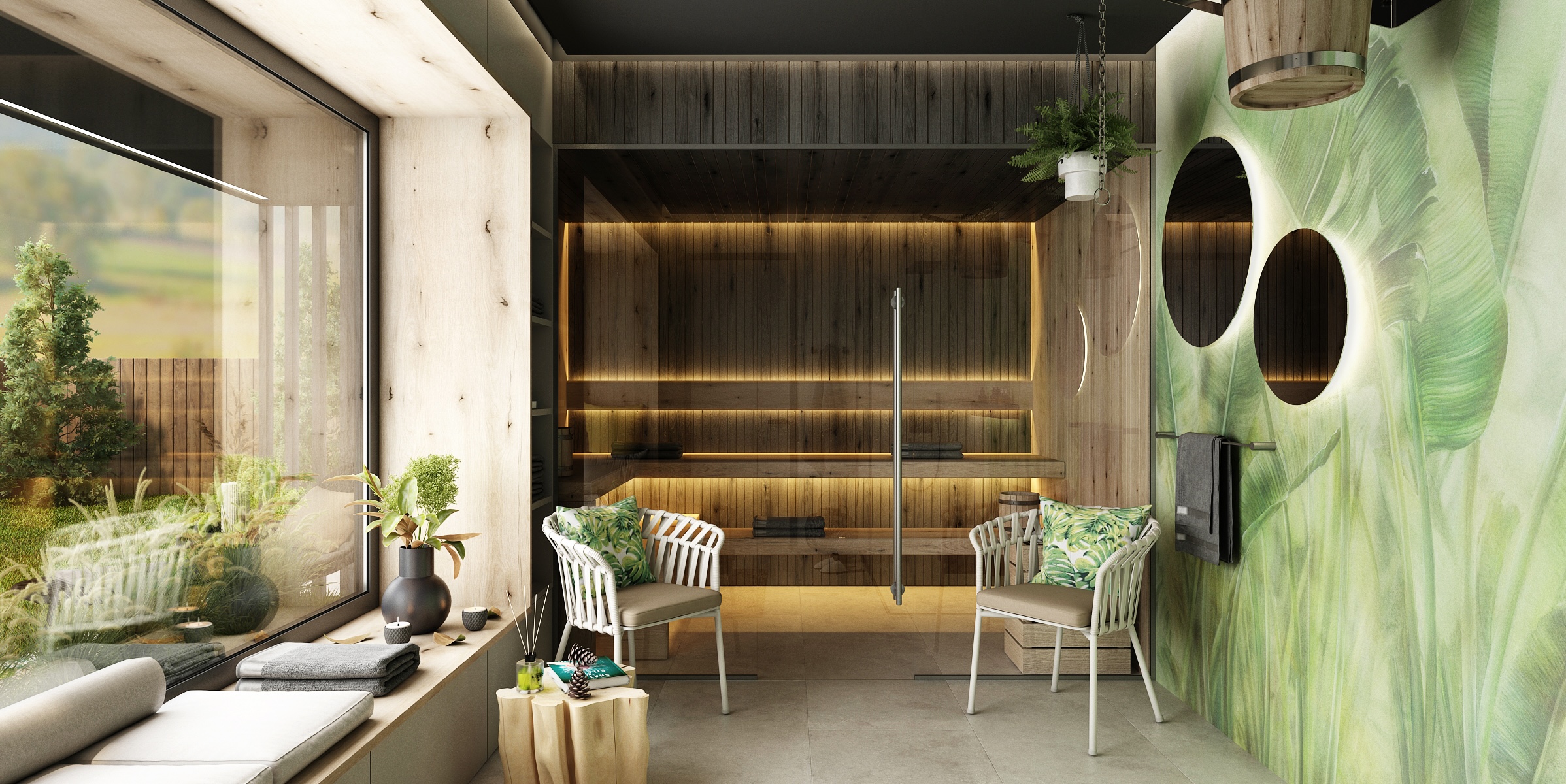 Interiér domácího wellness je laděn v přírodních tónech a materiálech – dominuje zde teplé dřevo, světlé stěny a akcenty zeleně.