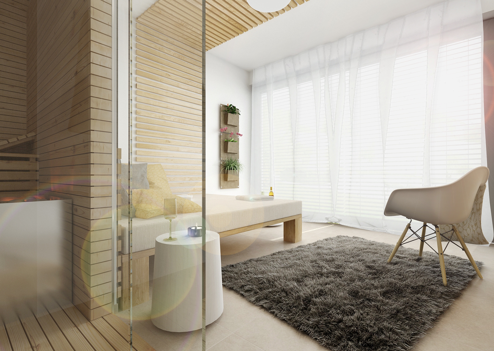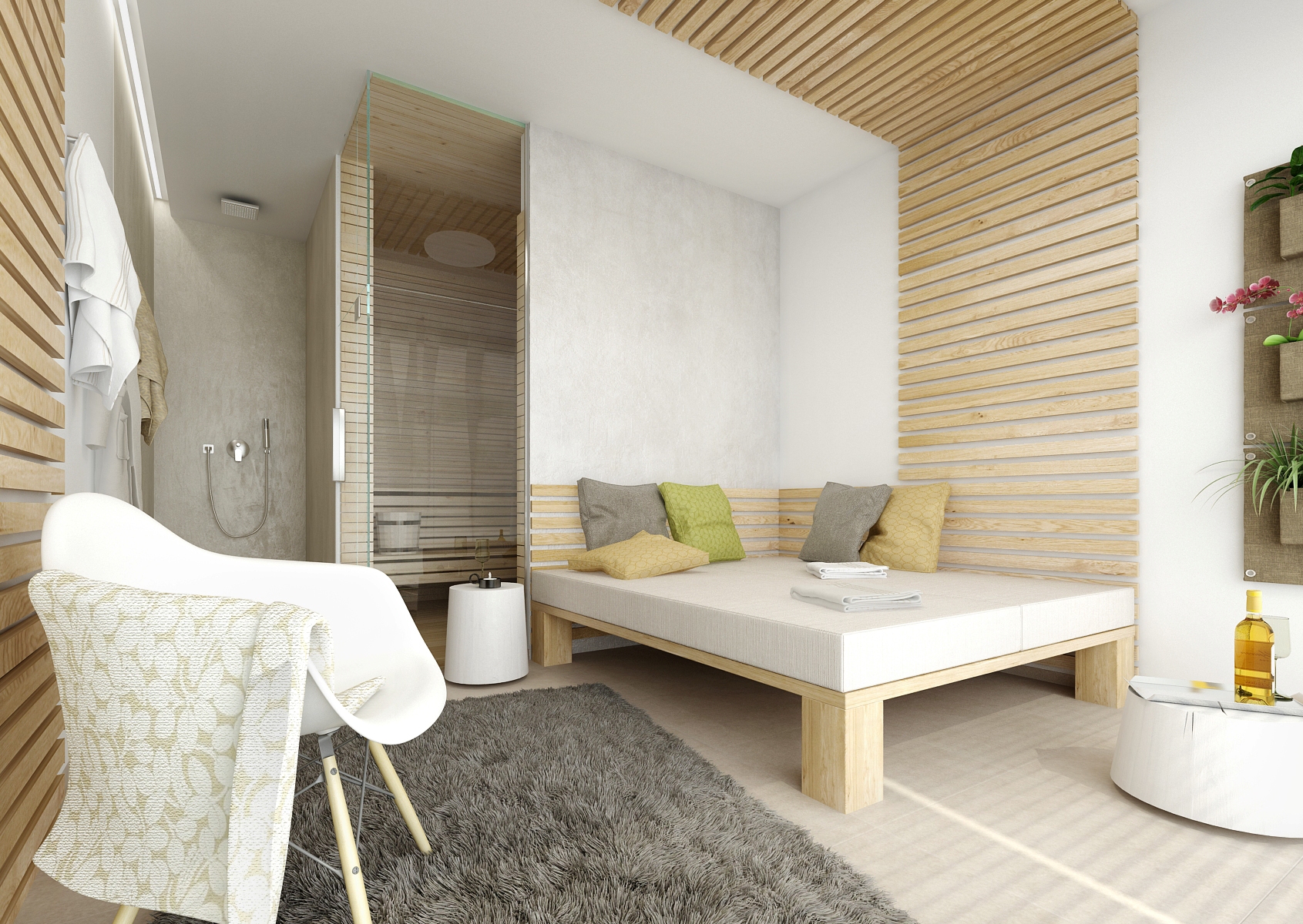 Obklady s minimem spár? I toto je možné s extra tenkými (3 mm) velkoformátovými obklady 100x300 cm Laminam-Oxide od Archtiles. V béžovém odstínu, spolu se zrcadly byly použity do kombinace s přírodním dubem na nábytku a dlažbě a s bílou kompaktní deskou pod umyvadly. Wellness byl vybaven suchou saunou, sprchou a relax lehátkem. V sauně použité smrkové hranokly dekorují i prostor odpočívárny.