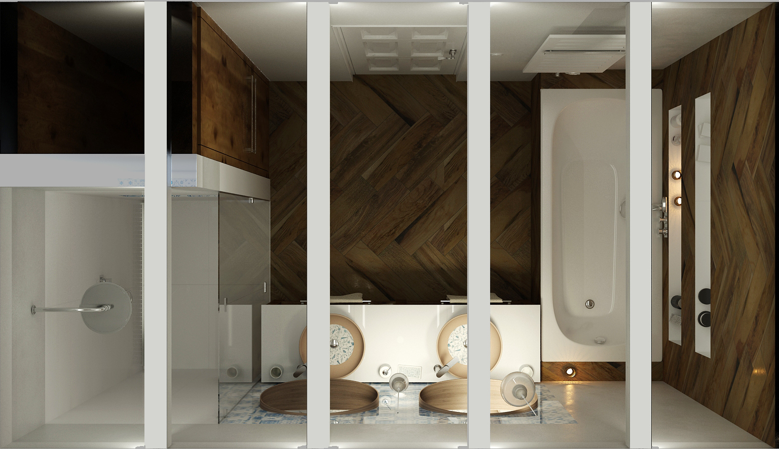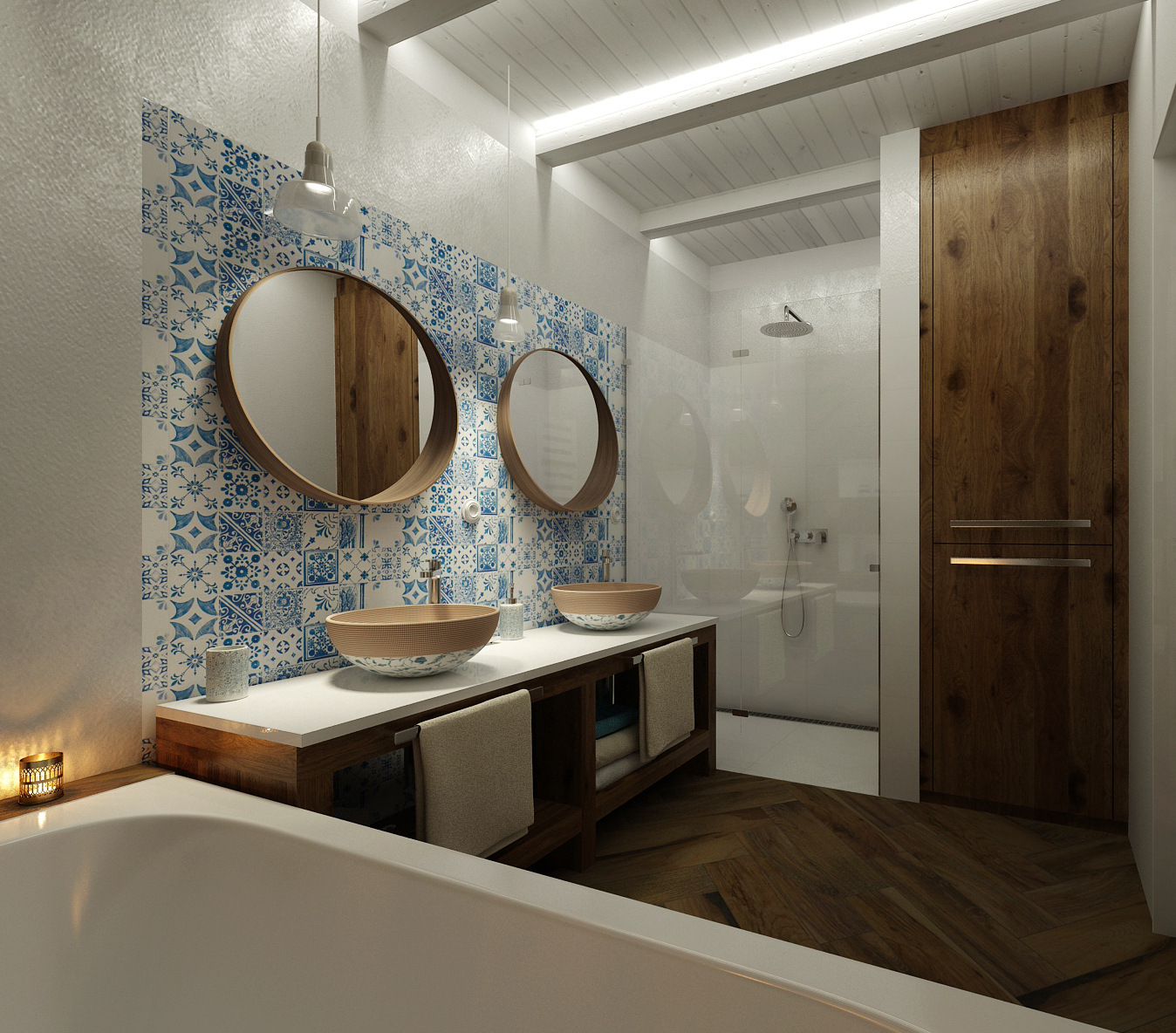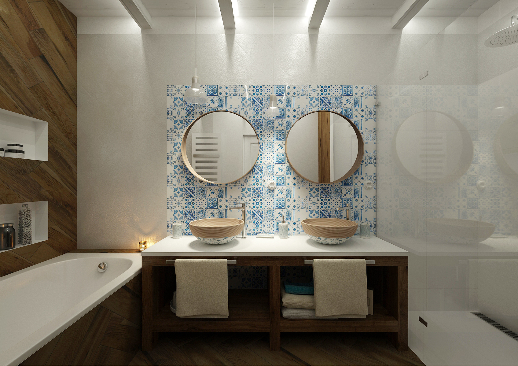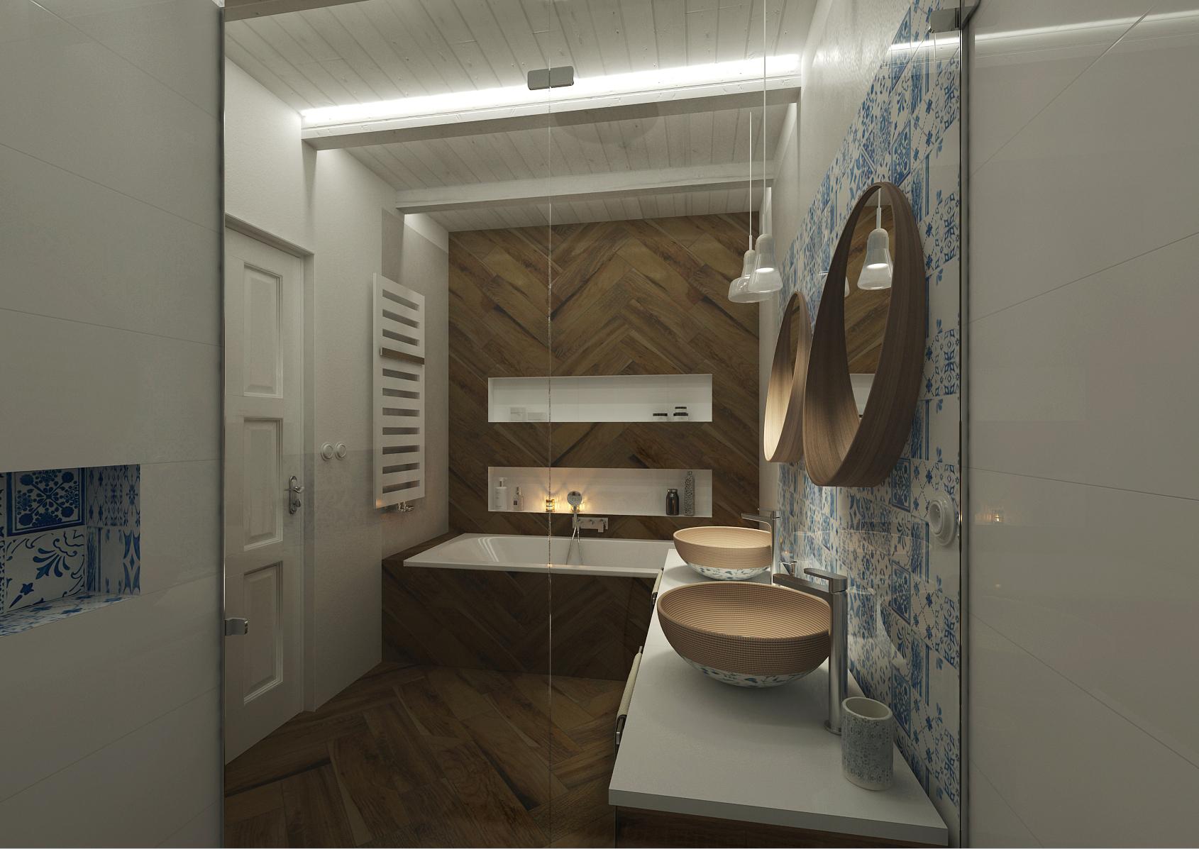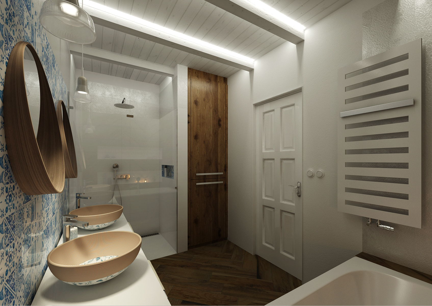 Venkovské stavení prošlo celkovou rekonstrukcí, samozřejmě i koupelna. Dřevěné stropy byly ponechány přiznané, natřené na bílo a do trámů bylo zafrézováno osvětlení. Parketová dlažba svým vzhledem imituje dřevo, je zalomena i do obkladu vany a celé stěny. Keramická umyvadla jsou ručně malovaná, spolu s kobaltově modro-bílou mozaikou Majolika jsou designerským prvkem, který se inspiroval právě venkovskou tradicí.