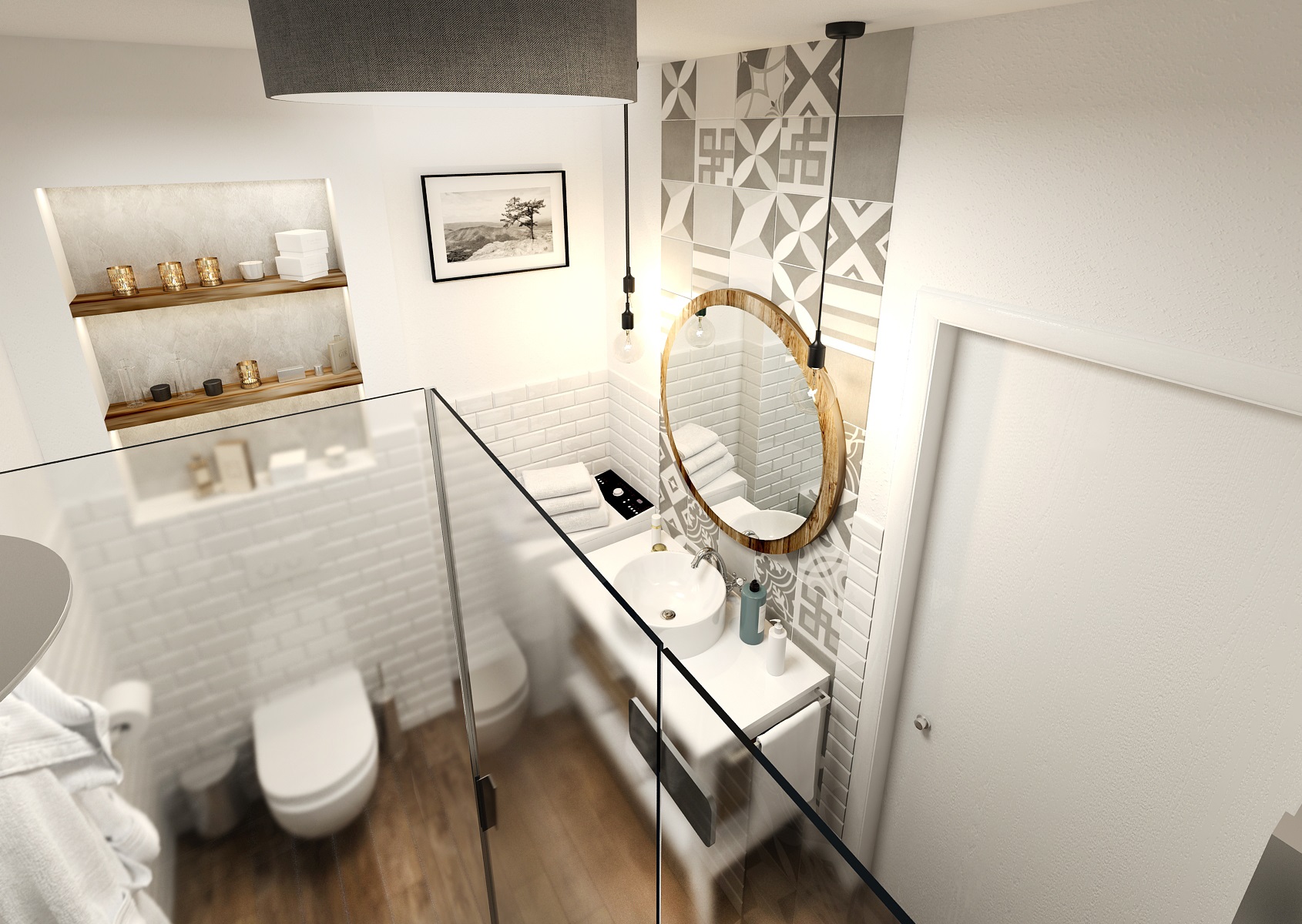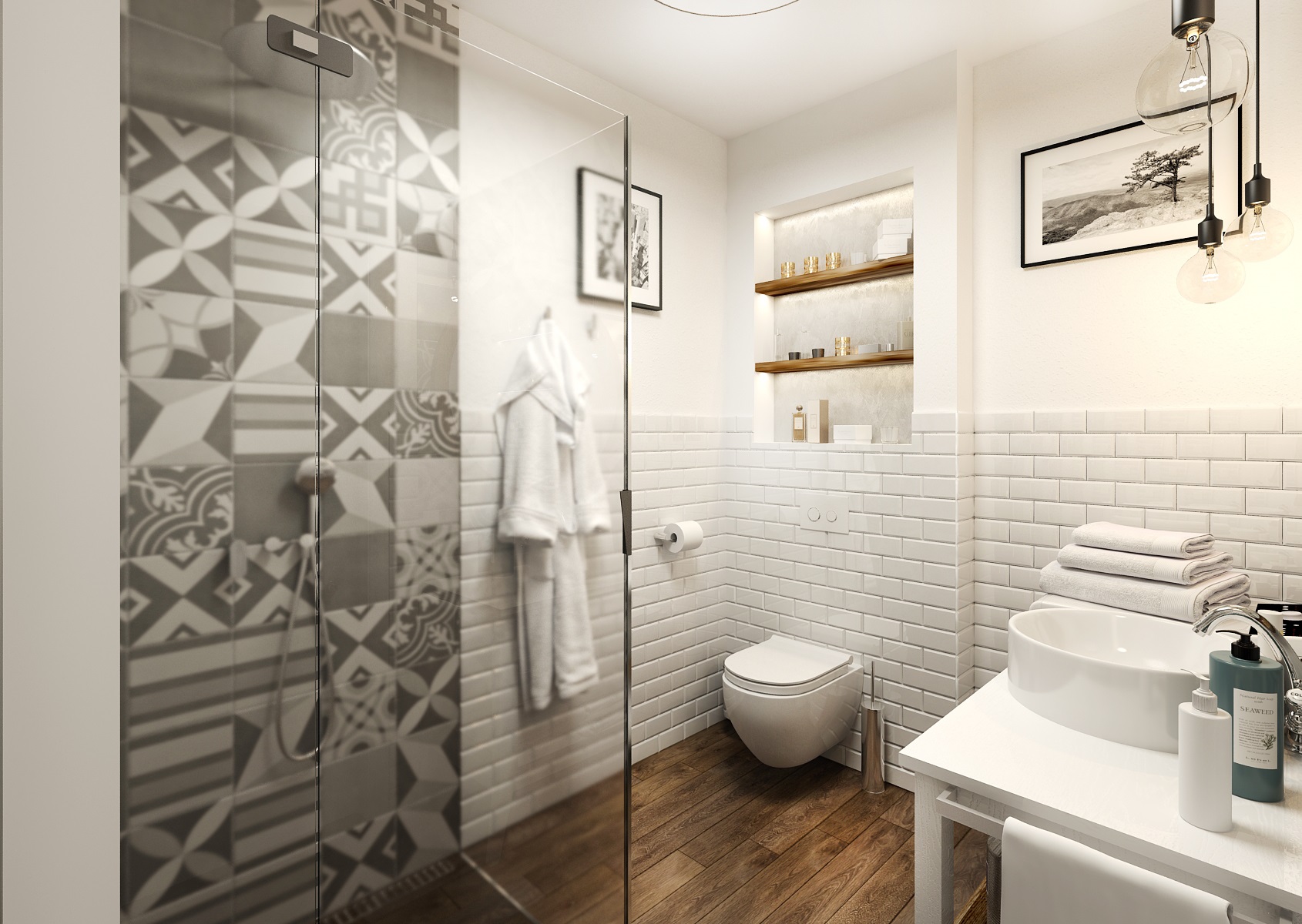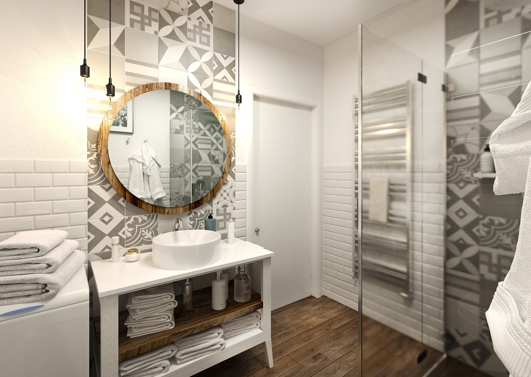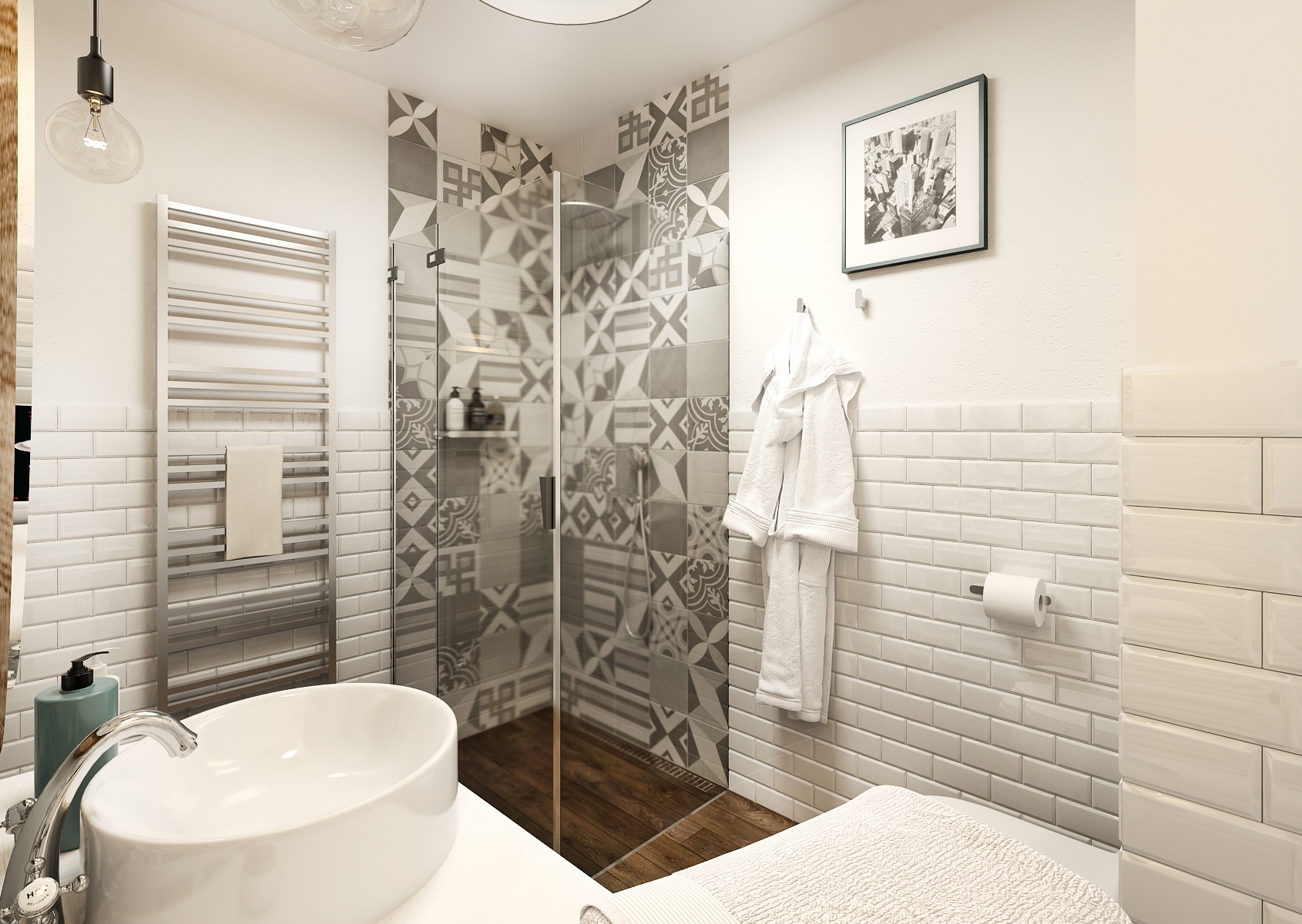 Nebojte se kombinovat vzorované obklady s obklady s fazetou a dlažbu s dřevodekorem