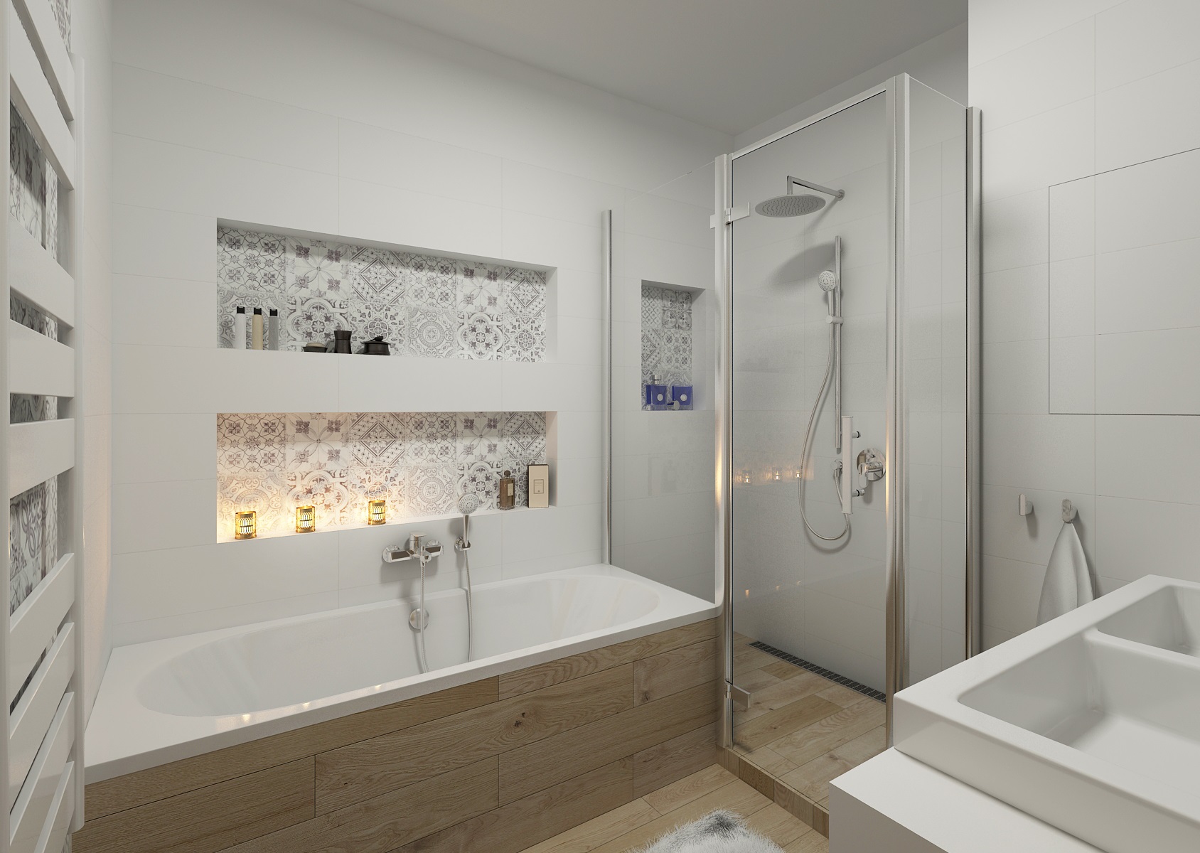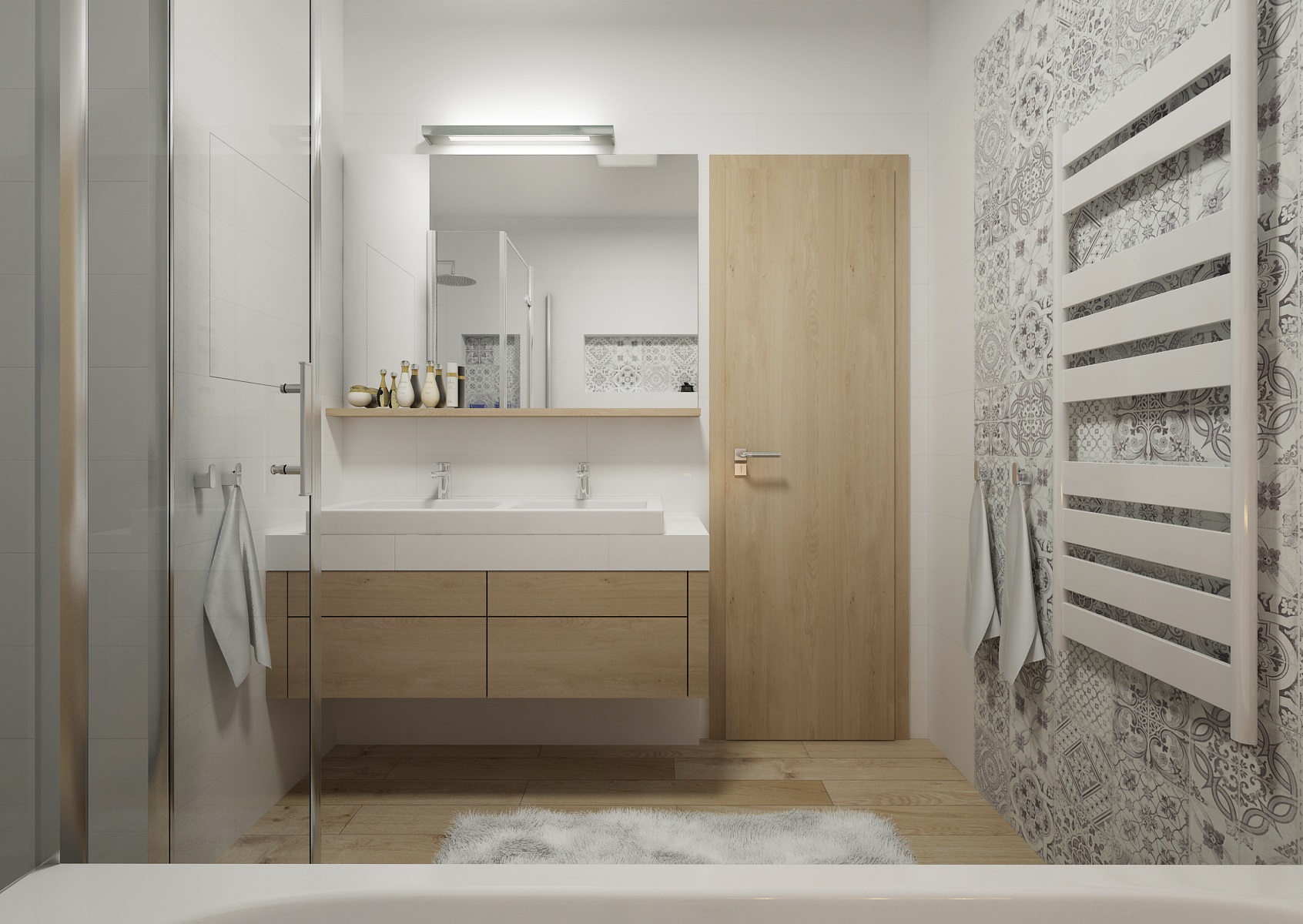 Koupelna s dlažbou v dubovém dřevodekoru a čistými bílými obklady, které jsou doplněny retro patchworkovými obklady Manises – Geotiles. Ze sanitárního vybavení je vybavena sprchovým koutem na míru, vanou a dvojumyvadlem.