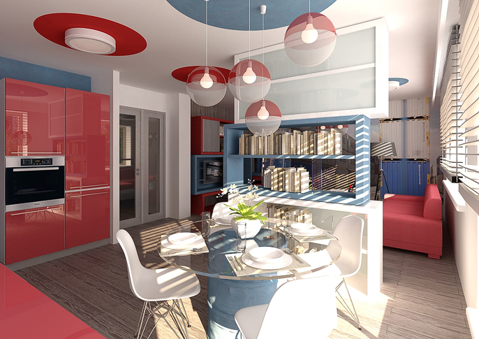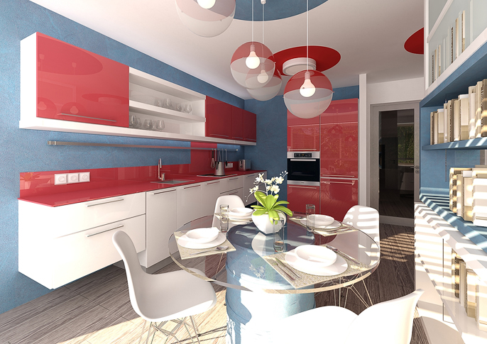 Design interiéru kuchyně v modré, bélé a červené kombinaci