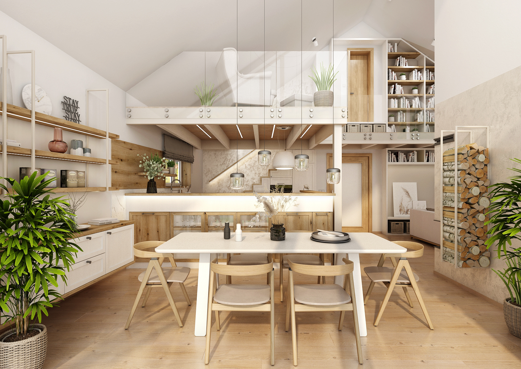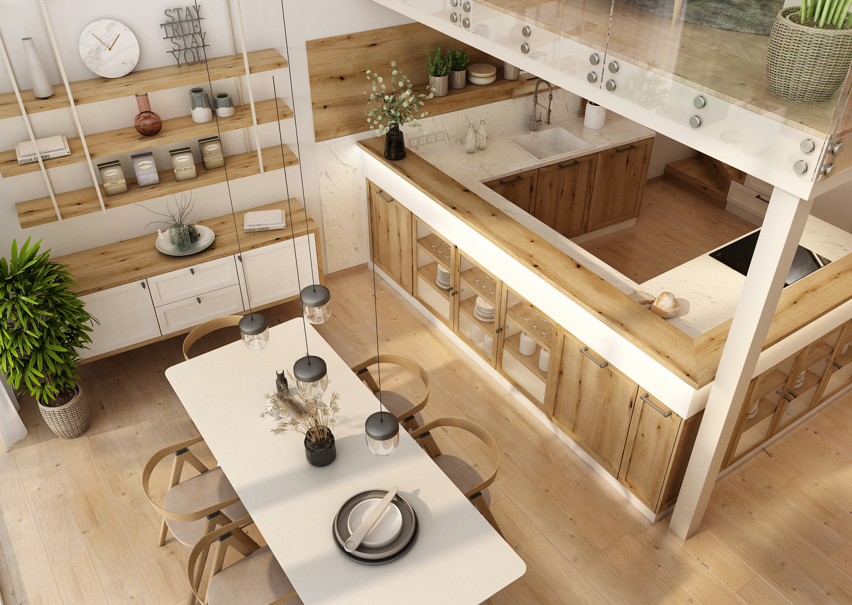 Venkovskou atmosféru kromě zvoleného stylu podtrhuje i množství užitých přírodních materiálů, přesněji dřeva. Dubové dřevo se nachází nejen v podobě masivní podlahy, ale i na nábytkových prvcích. Jídelní židličky skvěle doplňují bílý jídelní stůl, v této kombinaci je navržena i komoda s policemi.