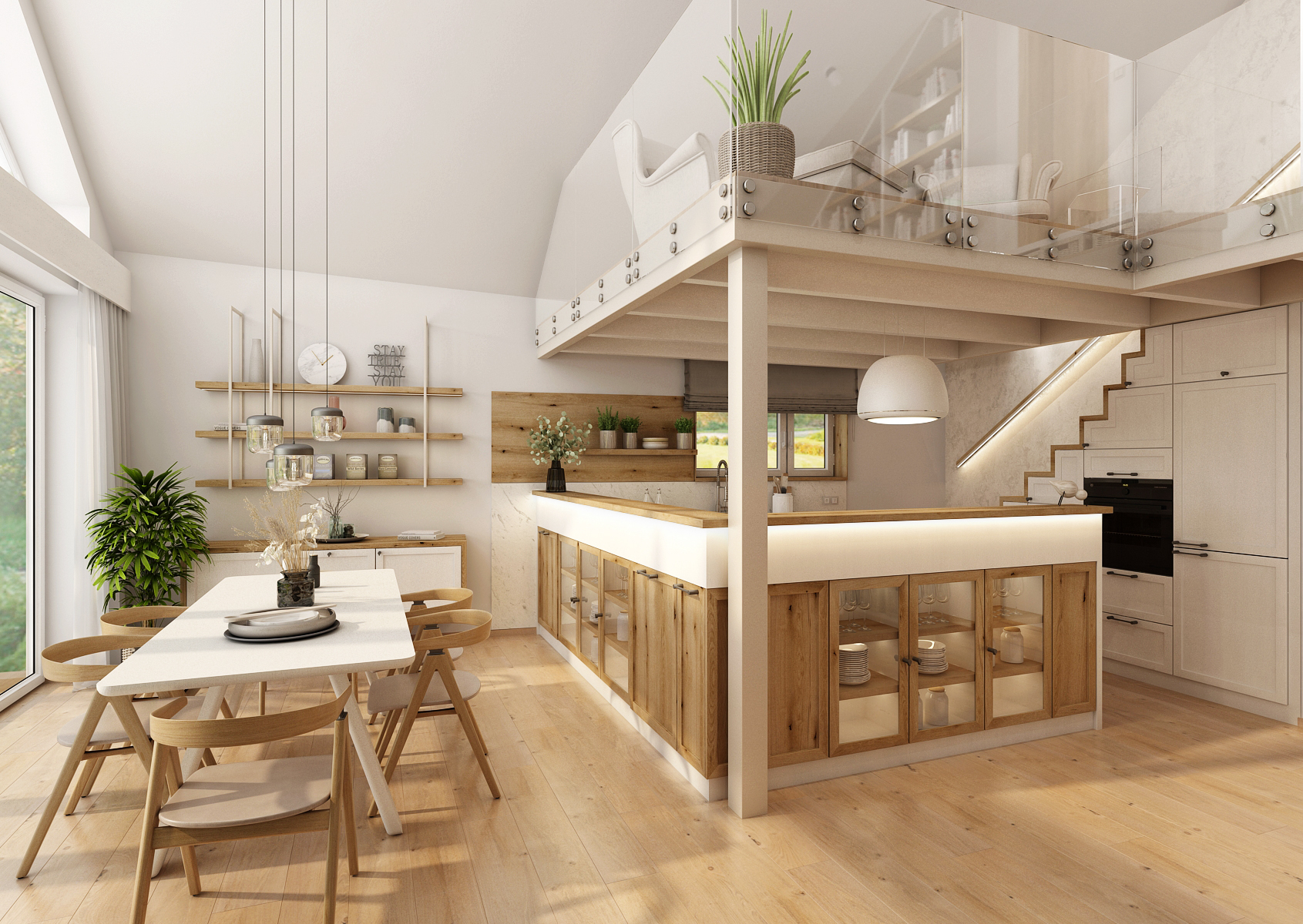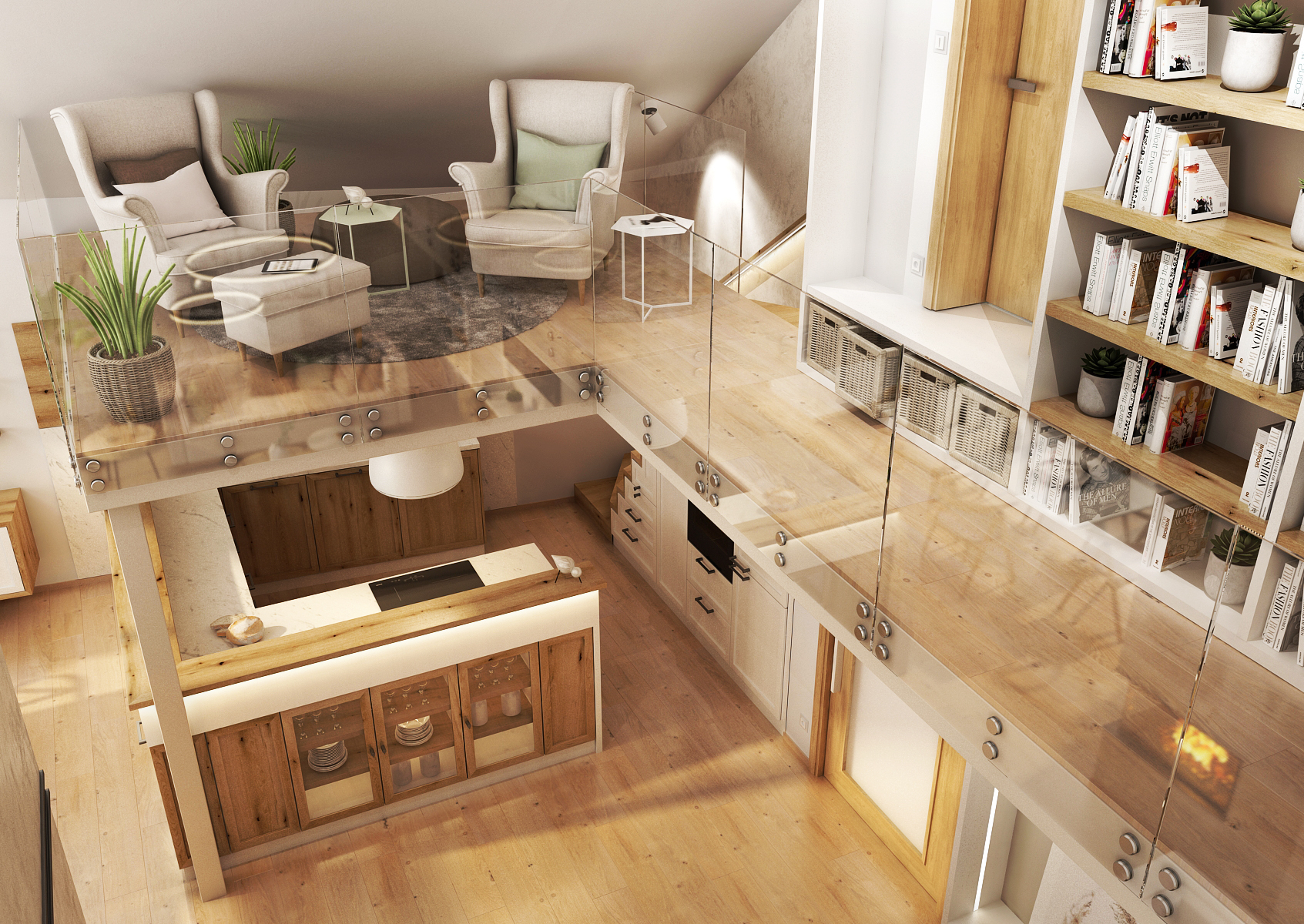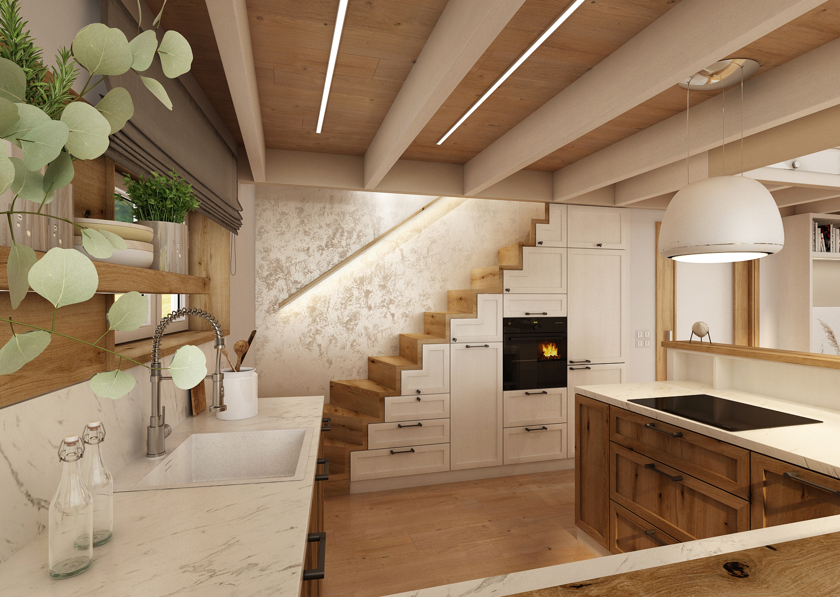 Zajímavě řešená je zde právě kuchyň, která je umístěná u schodů, pod částečným patrem, čímž je vizuálně oddělena od zbytku obytného prostoru. Chytře je využit jak prostor kuchyňské linky, kdy jsou skříňky řešeny i z venkovní strany kuchyně, ale i místo pod schody. Skříňky jsou zde uzpůsobeny tvaru schodů, místo je ale využito i pro vestavěné spotřebiče, jako je trouba či lednice.