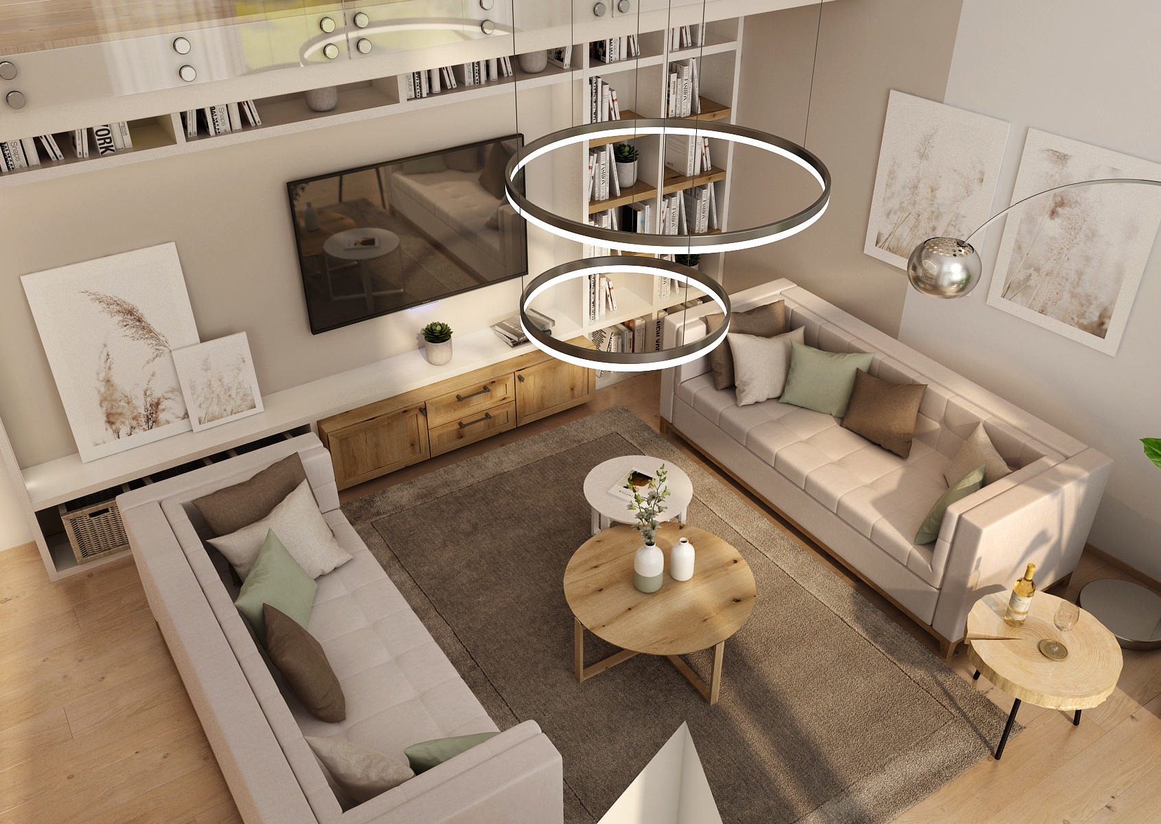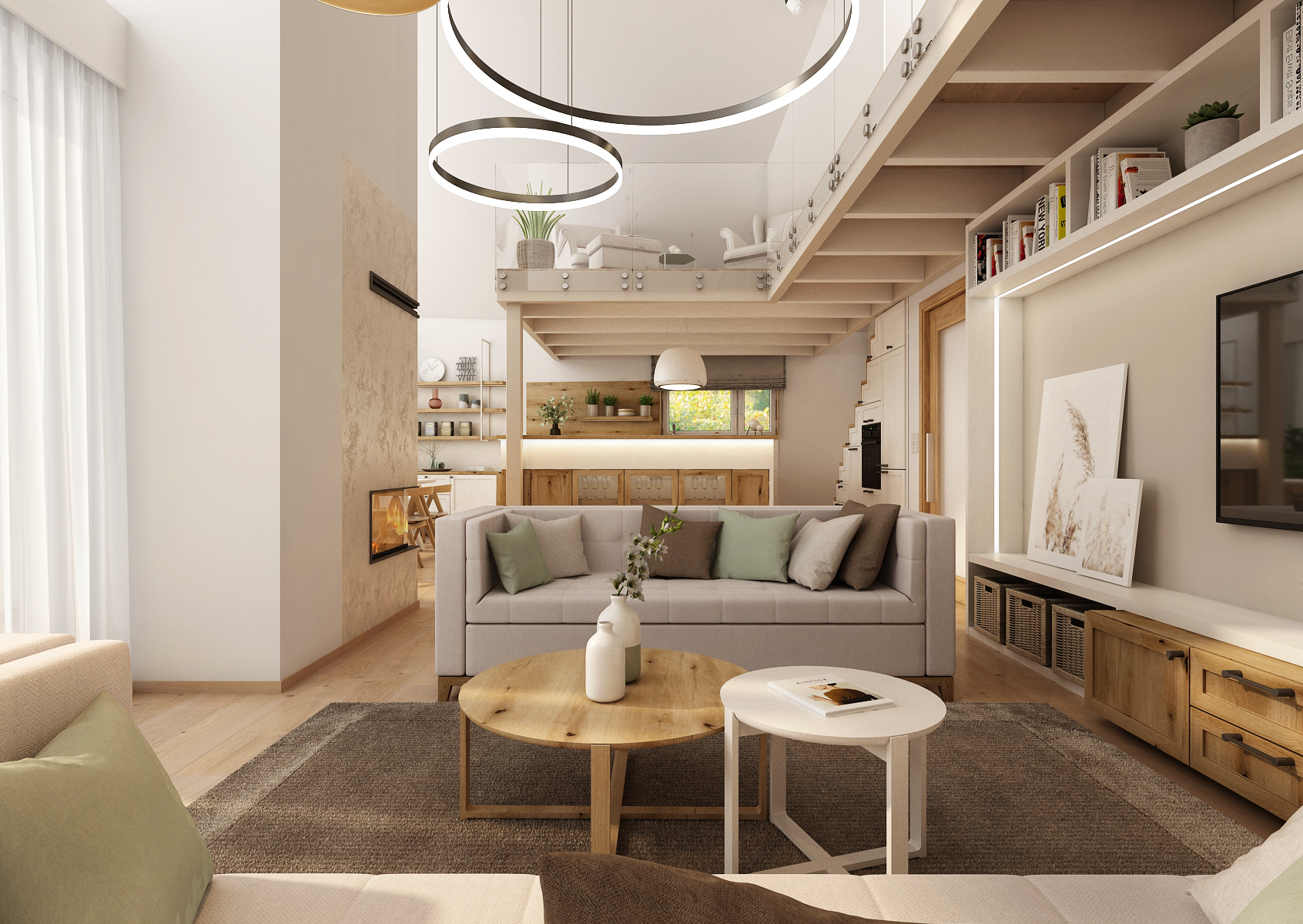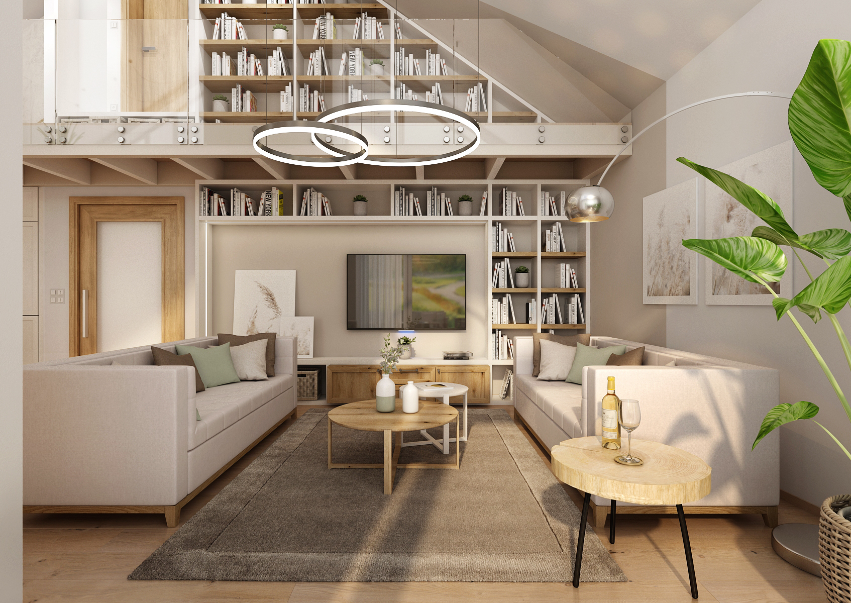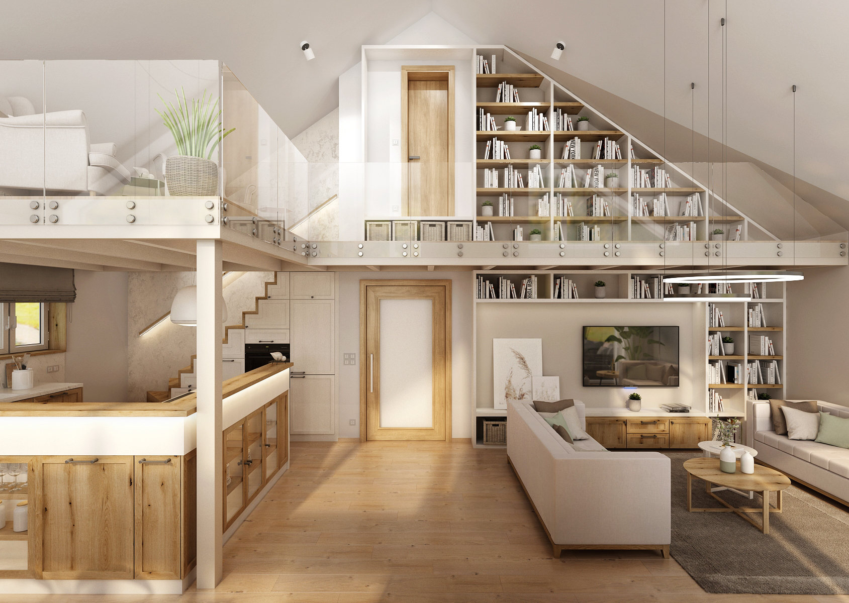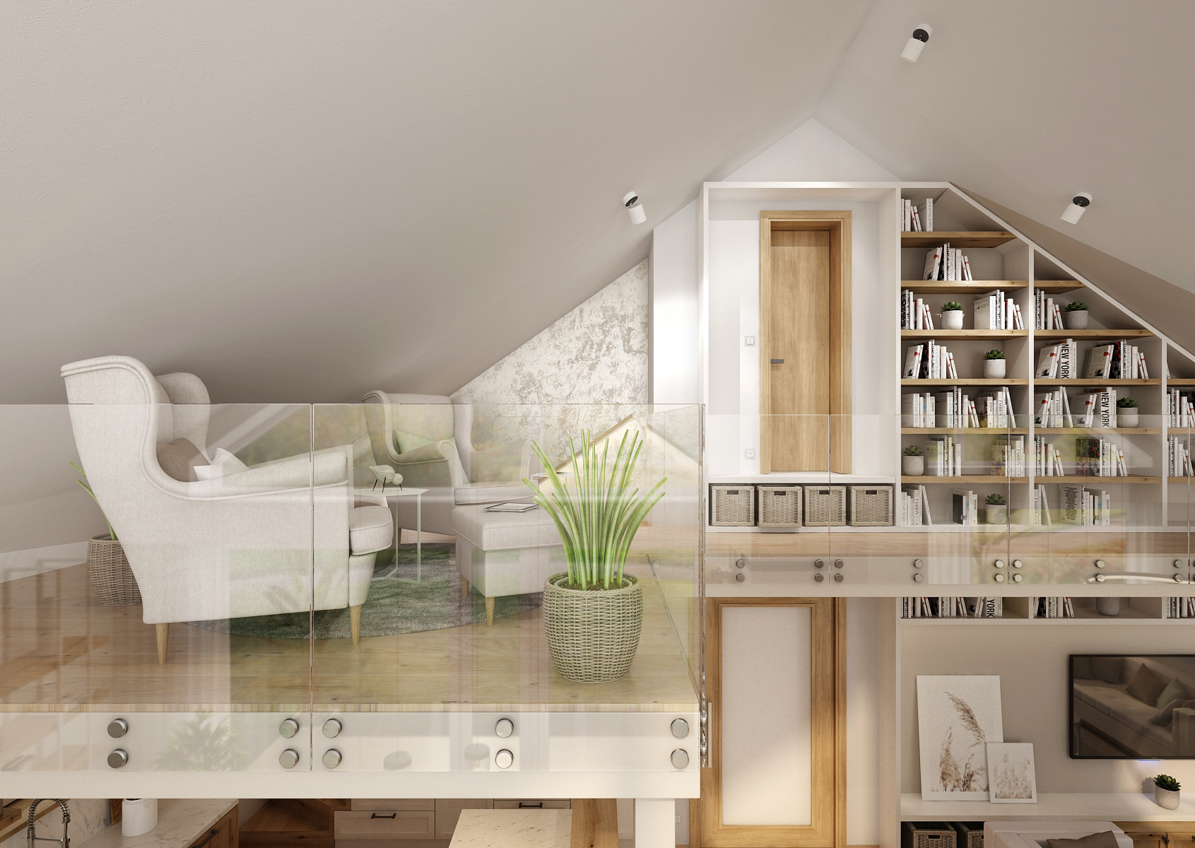 Horní částečné patro s koutkem k odpočinku disponuje knihovnou, která vizuálně přechází do obývacího pokoje v přízemí a kopíruje tvar stropní šikminy, stejně jako okna na protější stěně.