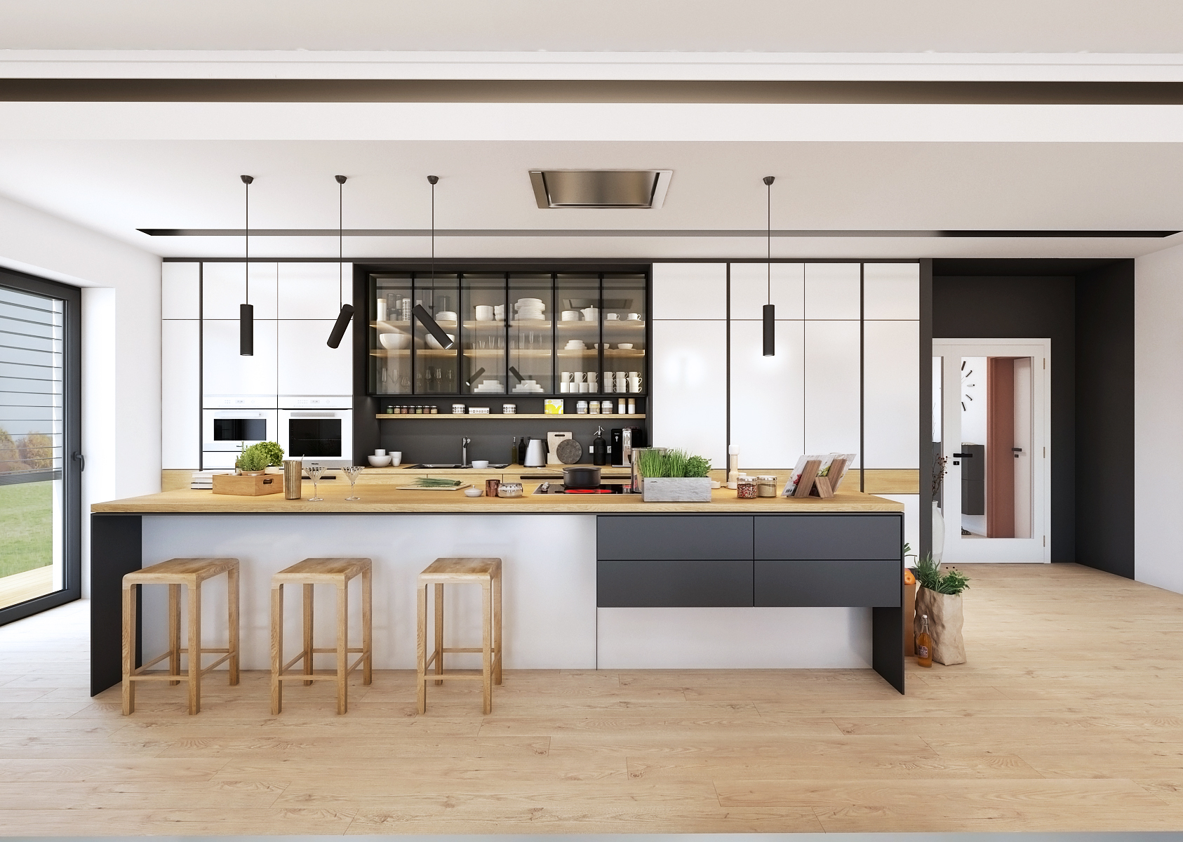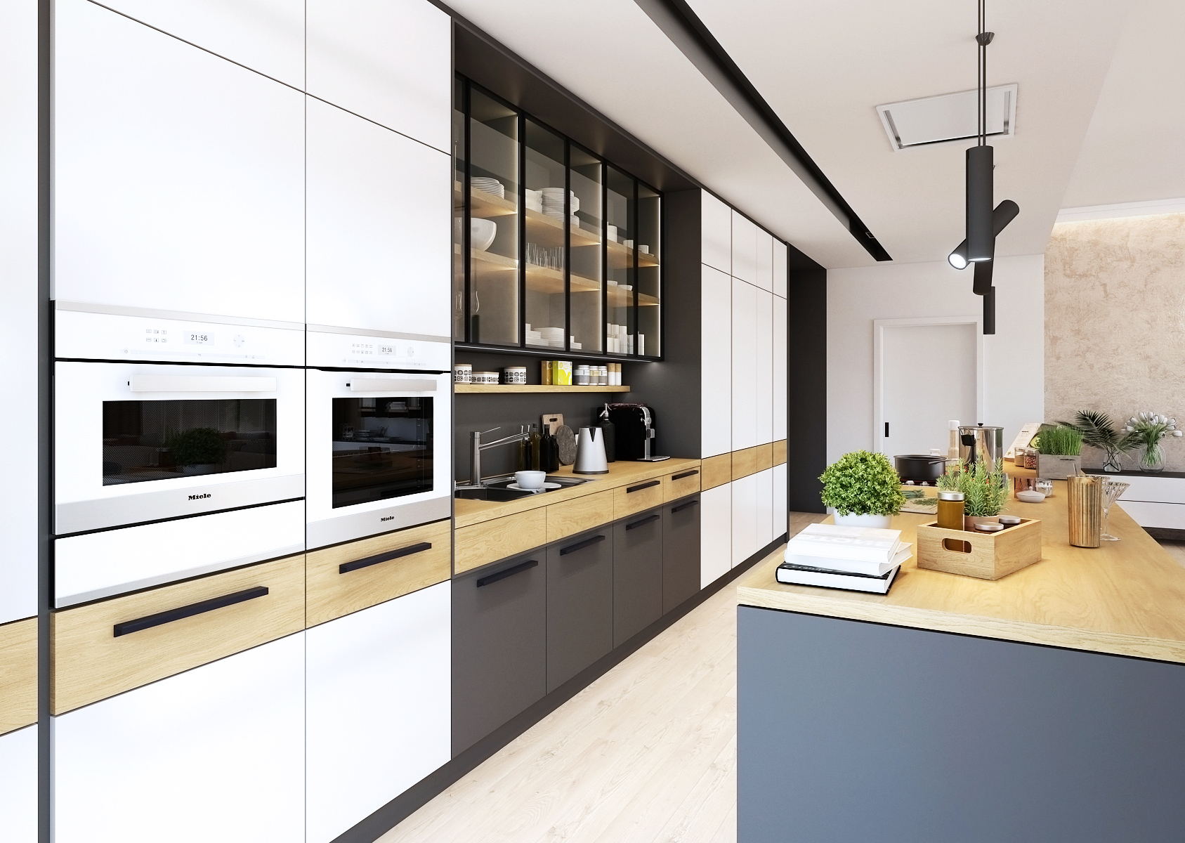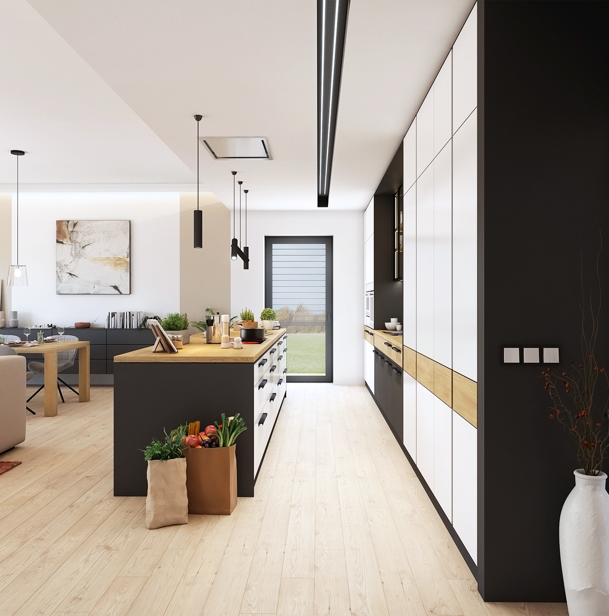 Využití černé a bílé společně s přírodními materiály působí na první dojem čistě a minimalisticky. Vysoké vestavěné skříně až ke stropu obklopují pracovní místo, naproti kterému se nachází kuchyňský ostrůvek se stropní digestoří. Ta je zabudovaná ve stropním podhledu, který vizuálně odděluje kuchyň od zbytku obytného prostoru.