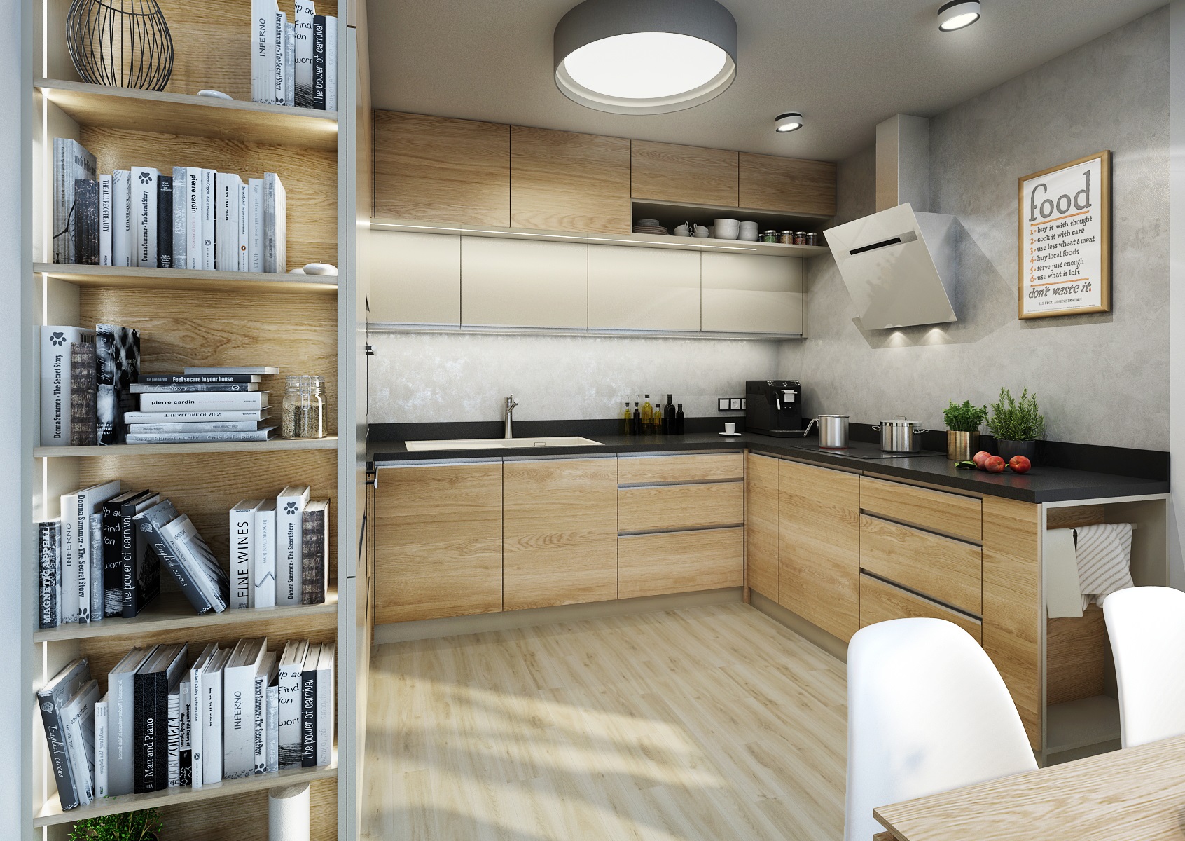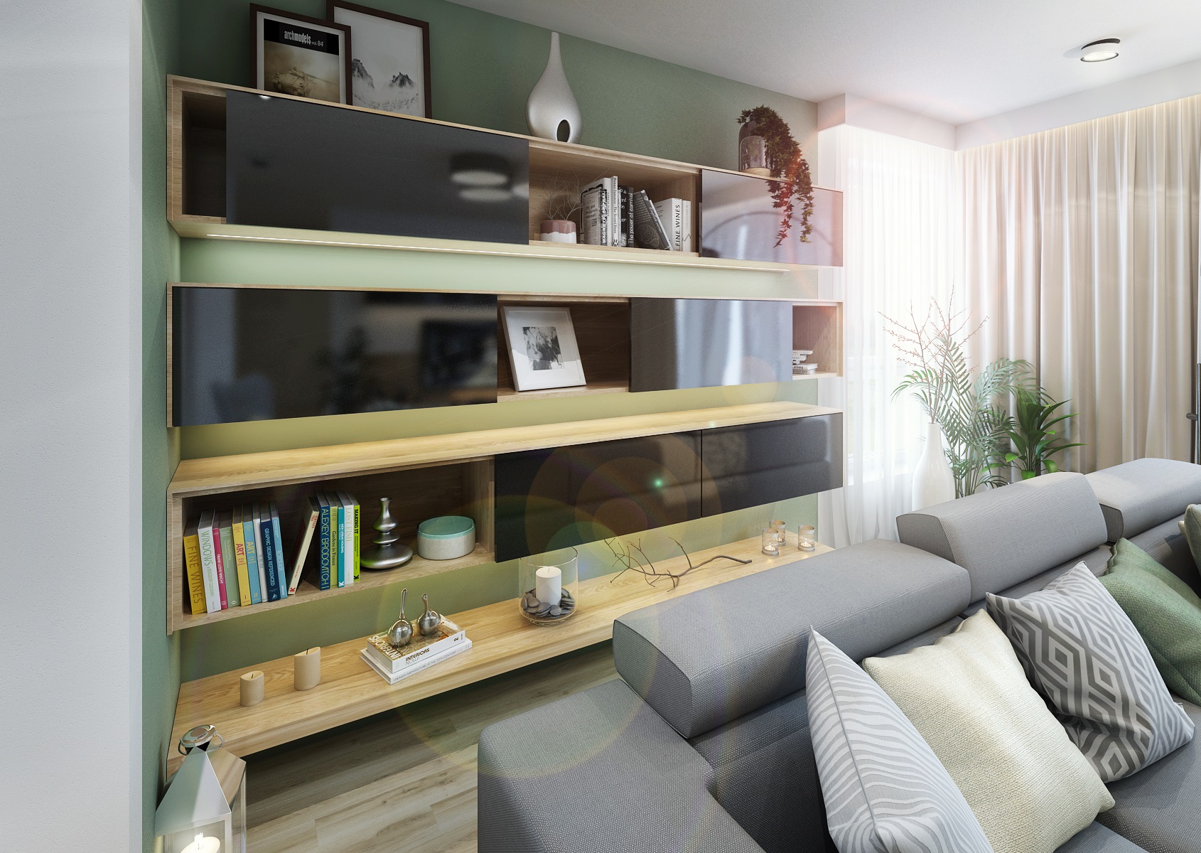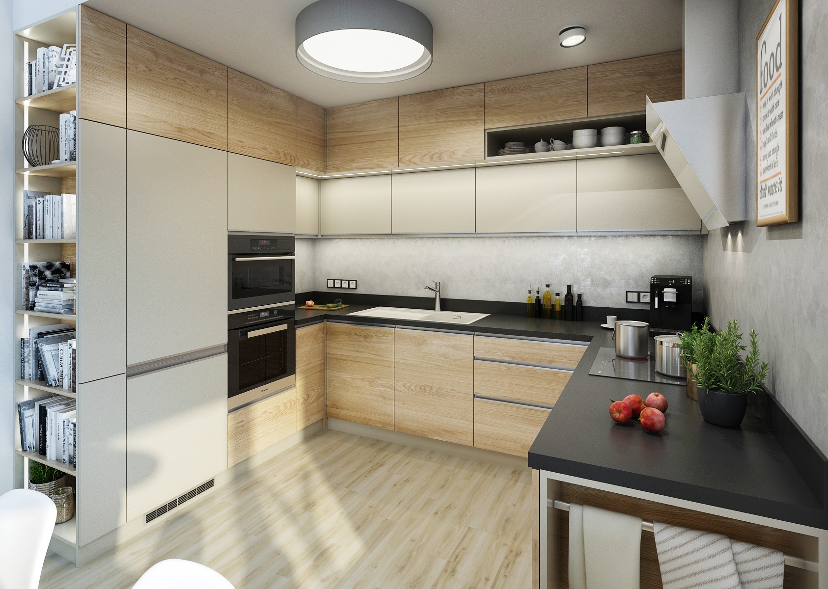 Návrh kuchyně do Zlína v béžové, šedé, černé a dubu, které v sousedním obývacím pokoji ještě doplňuje zelenošedá výmalba a textilní doplňky. Černá pracovní deska je z vysoce odolného materiálu Technistone. Stěna u pracovní desky je pak upravena dekorační šedou stěrkou Cadoro, která je navíc ošetřena kombinací dalších odolných nátěrů z nabídky San Marco, aby tak vyhovovala náročnému provozu v kuchyni.