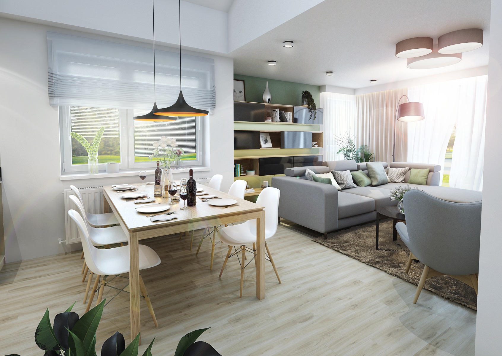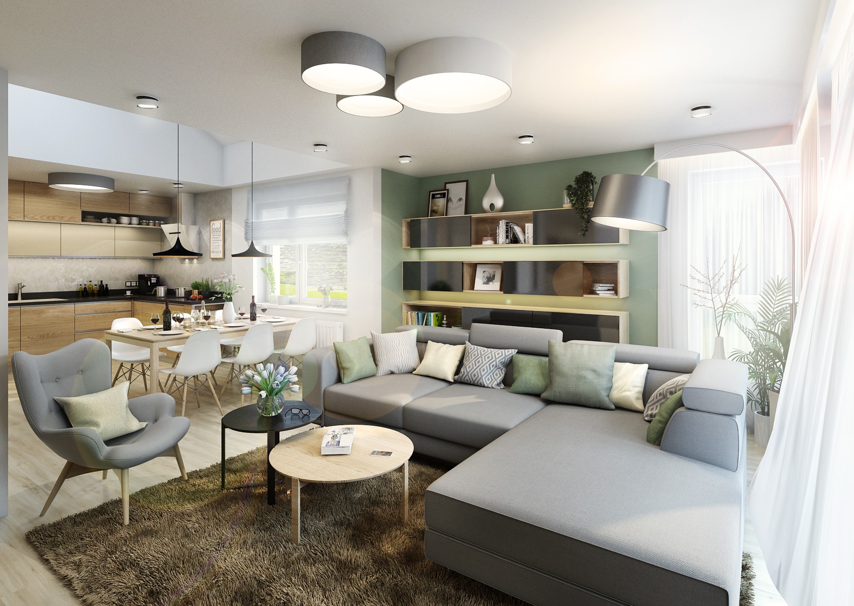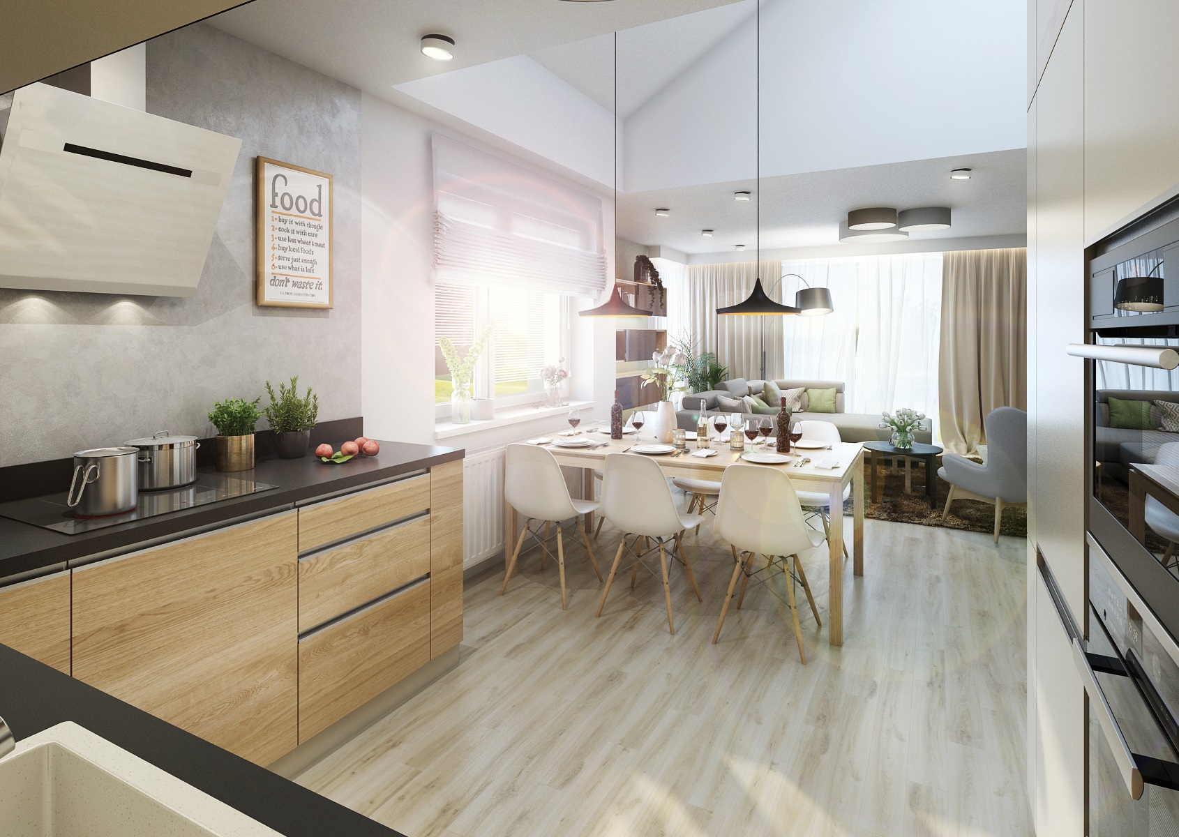 Návrh kuchyně do Zlína v béžové, šedé, černé a dubu, které v sousedním obývacím pokoji ještě doplňuje zelenošedá výmalba a textilní doplňky. Černá pracovní deska je z vysoce odolného materiálu Technistone. Stěna u pracovní desky je pak upravena dekorační šedou stěrkou Cadoro, která je navíc ošetřena kombinací dalších odolných nátěrů z nabídky San Marco, aby tak vyhovovala náročnému provozu v kuchyni.