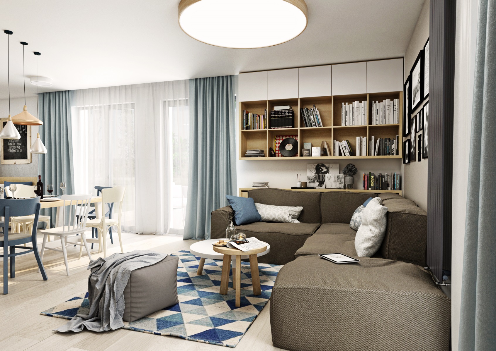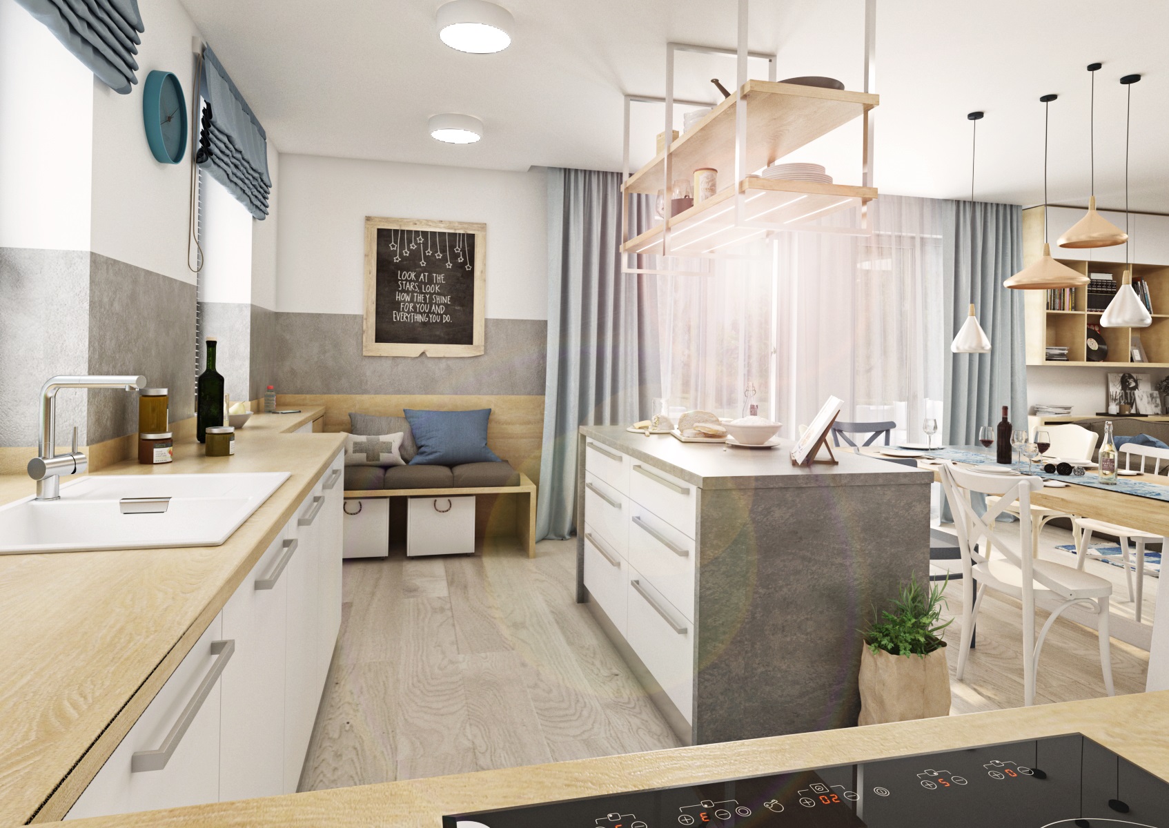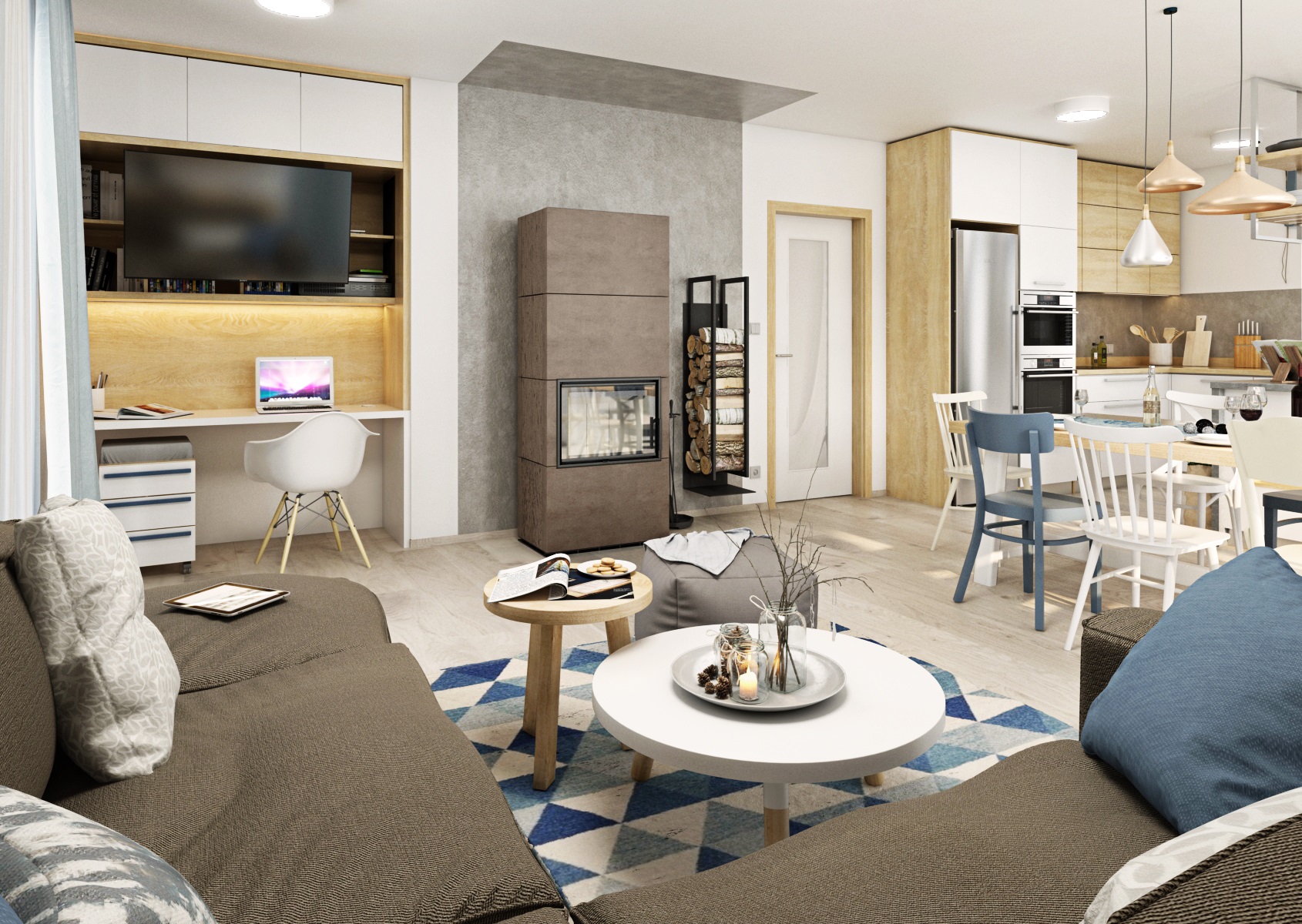 v bílém matu a v dekoru dřeva Kronospan Stone Oak, postformingová pracovní deska se vzorem betonu, omyvatelná nástěnná stěrka ve stejném tónu na pozadí kuchyně i krbu. Prostor elegantně dekorují doplňky v modré barvě.