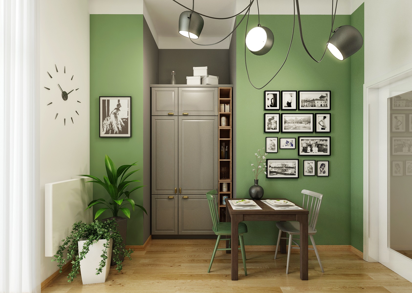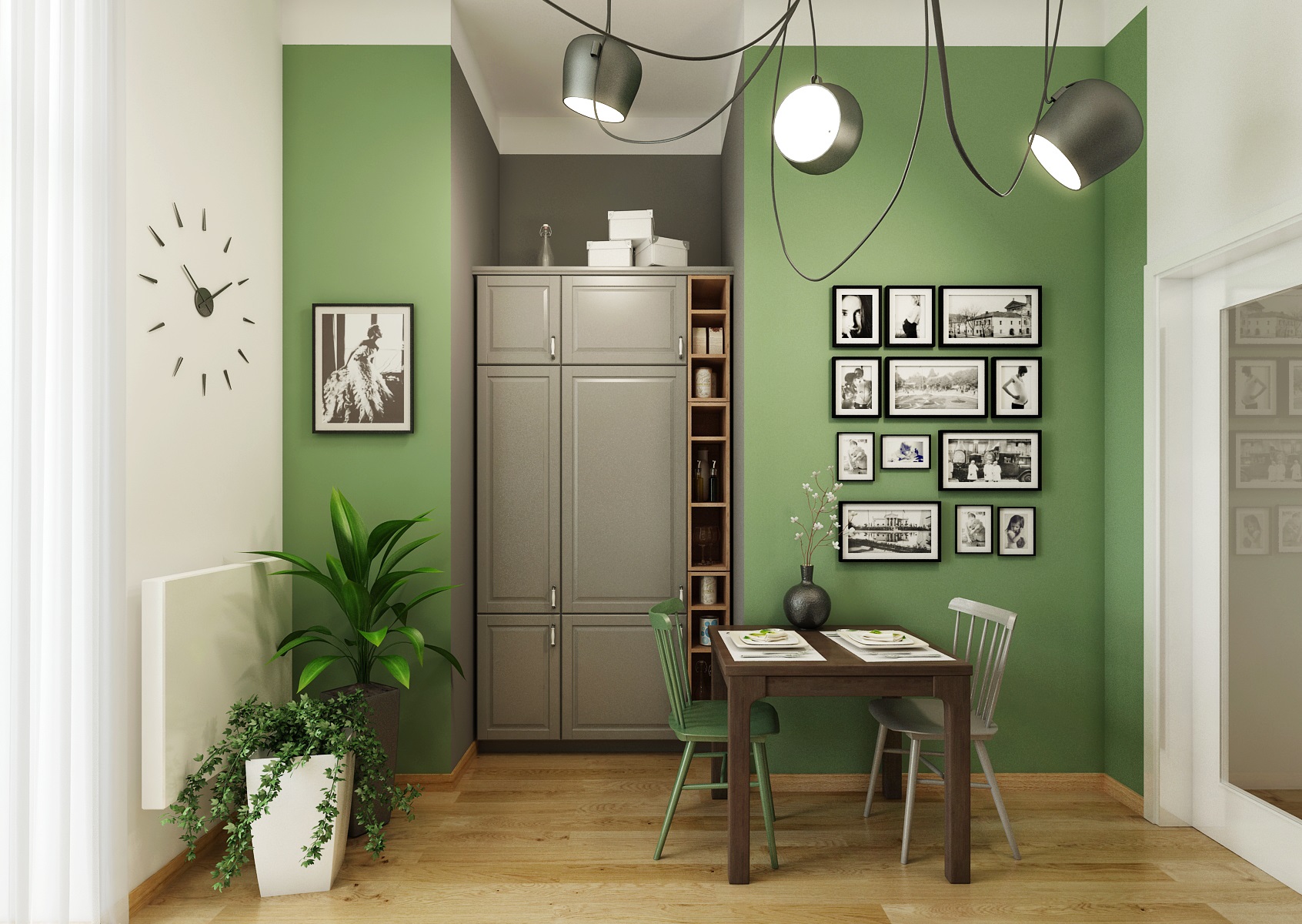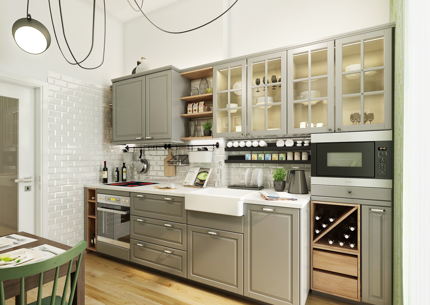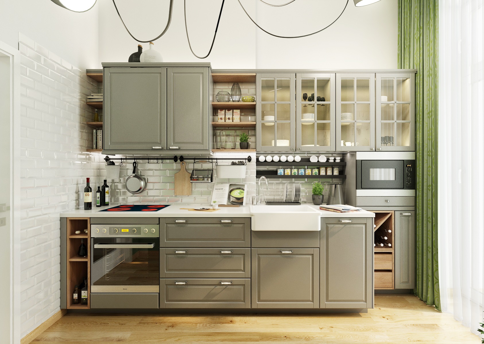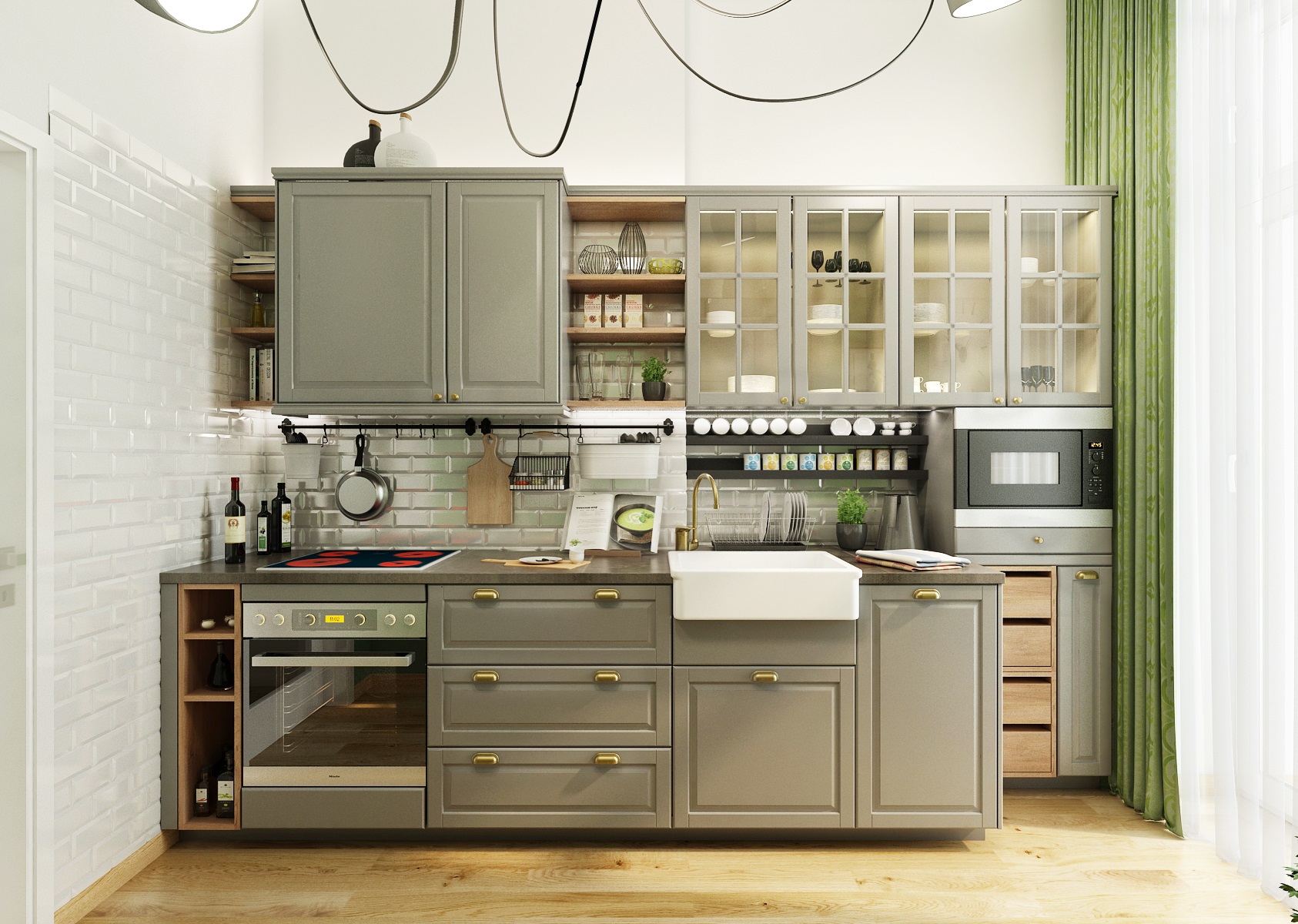 I v malém prostoru lze navrhnout kuchyni v anglickém stylu z typových prvků IKEA, které jsou místy doplněné prvky na míru z LTD dub (police atd.). Konkrétně jde o kuchyňský program METOD, profilovaná dvířka
