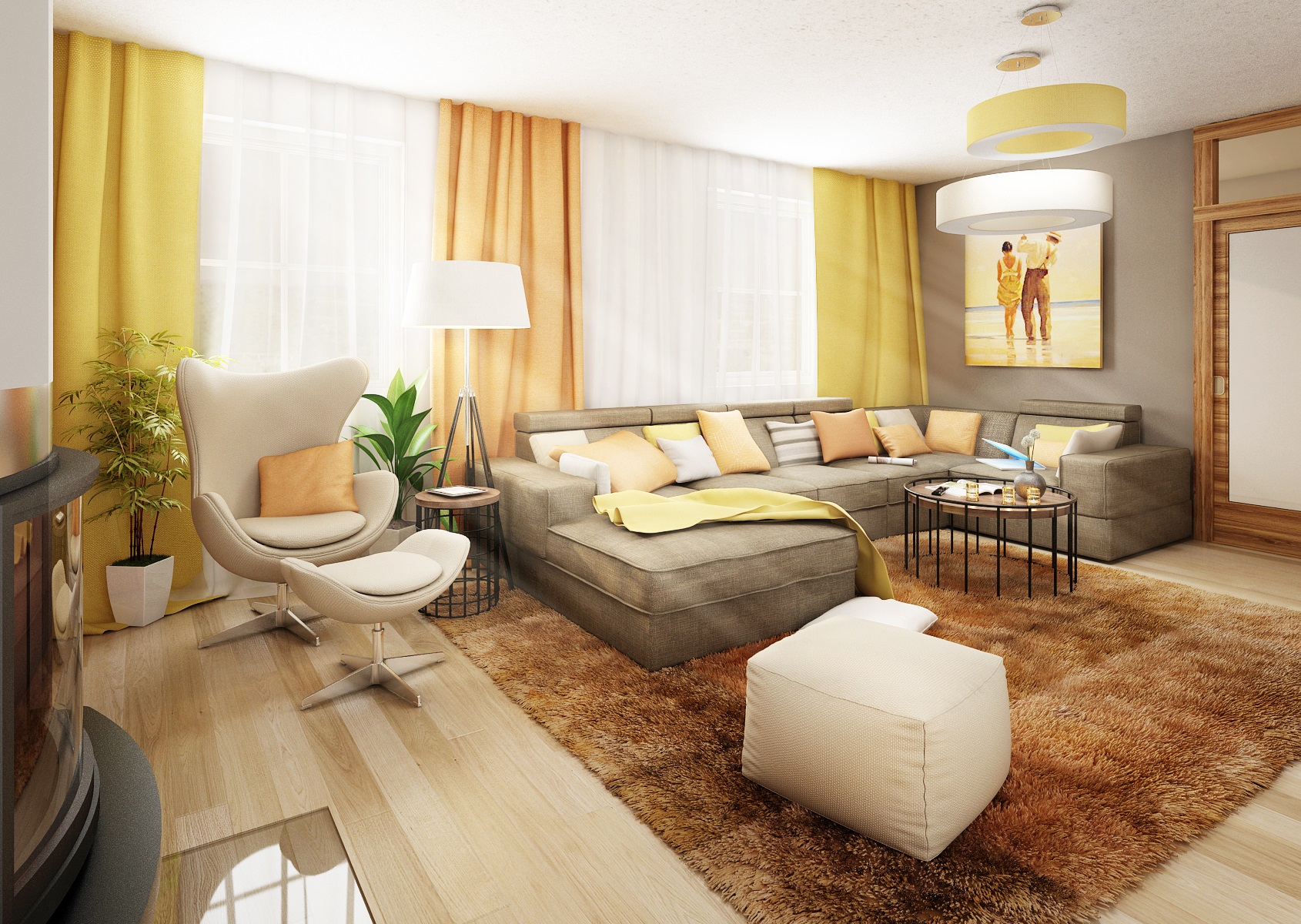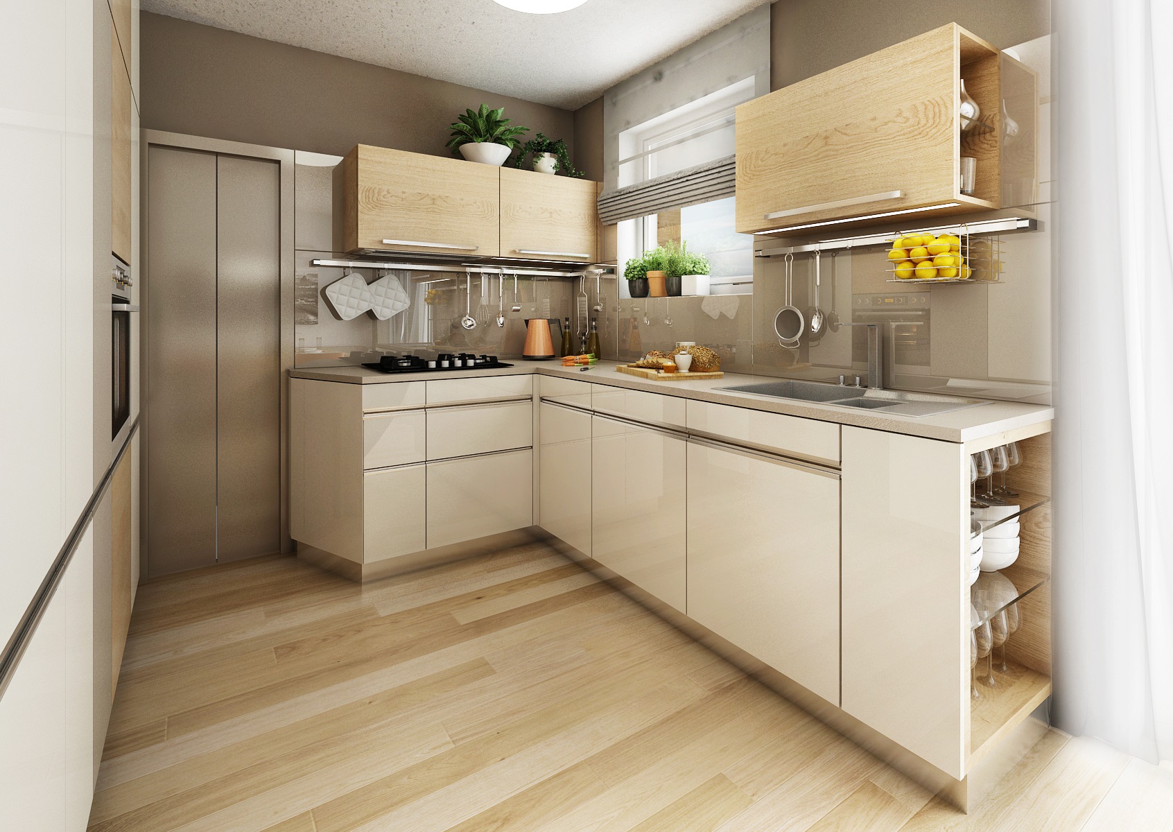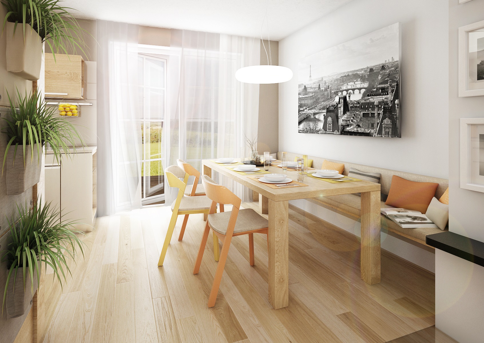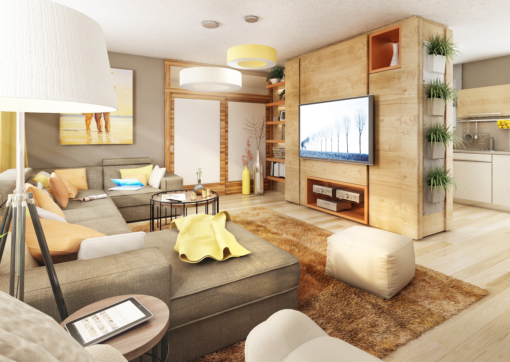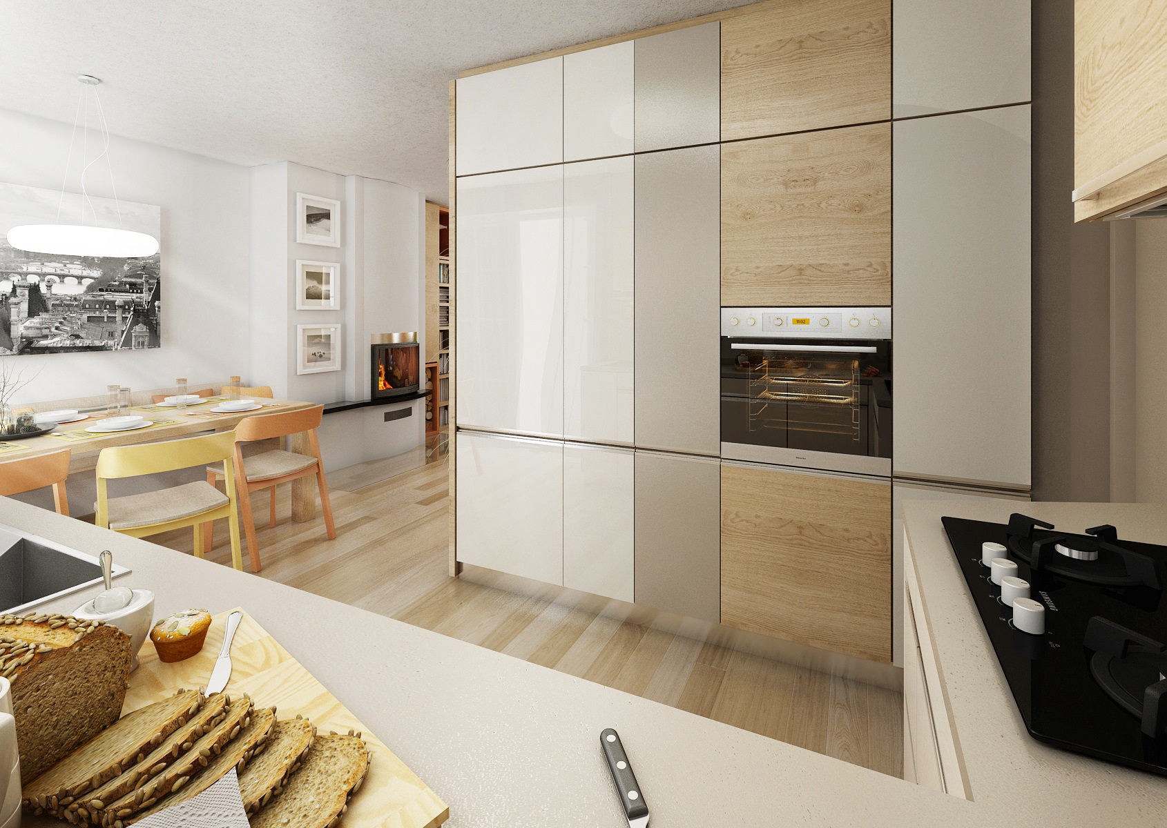 Nábytek kuchyně i v obývacím pokoji je vyroben v zemitých tónech, provedení v matu, v bílé, pískové, s dřevodekorem dubu (Hamilton přírodní příčný), doplněn detaily a dekorací v broskvové barvě.