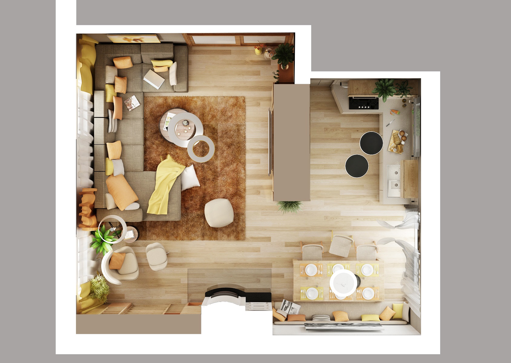 Společný prostor obývacího pokoje s kuchyní a jídelny