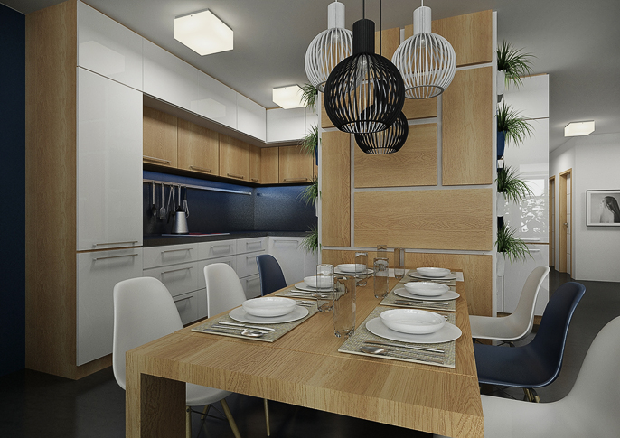 Kuchyně v kombinaci lesklého bílého lamina, světlé dubové dýhy a tmavomodrých prvků. Středový sloup, v němž jsou vedeny instalace, je opatřen dekorativním obkladem v barvě světlého dubu.