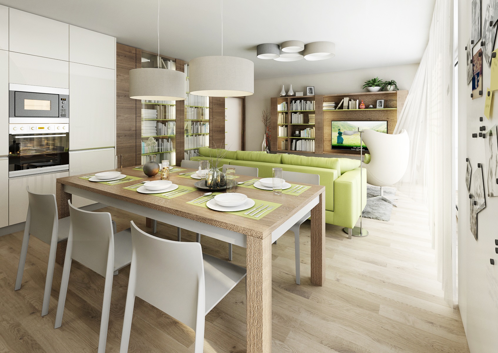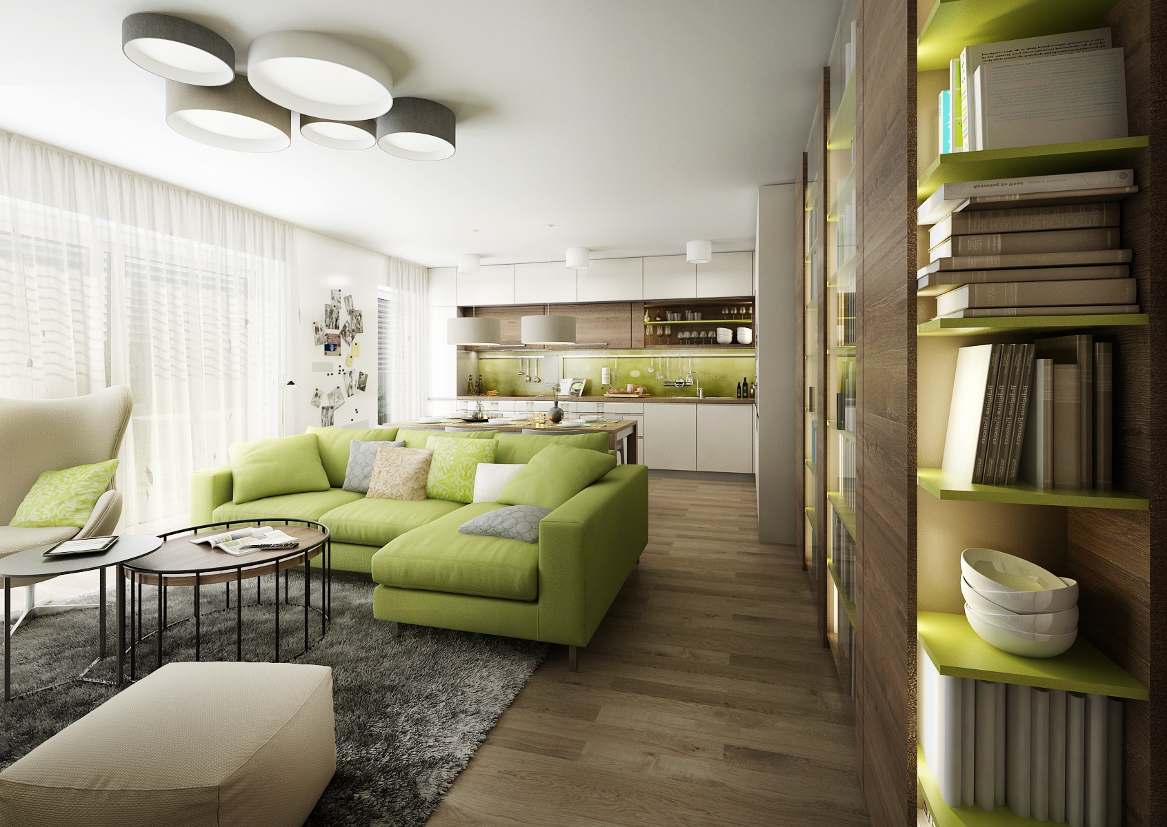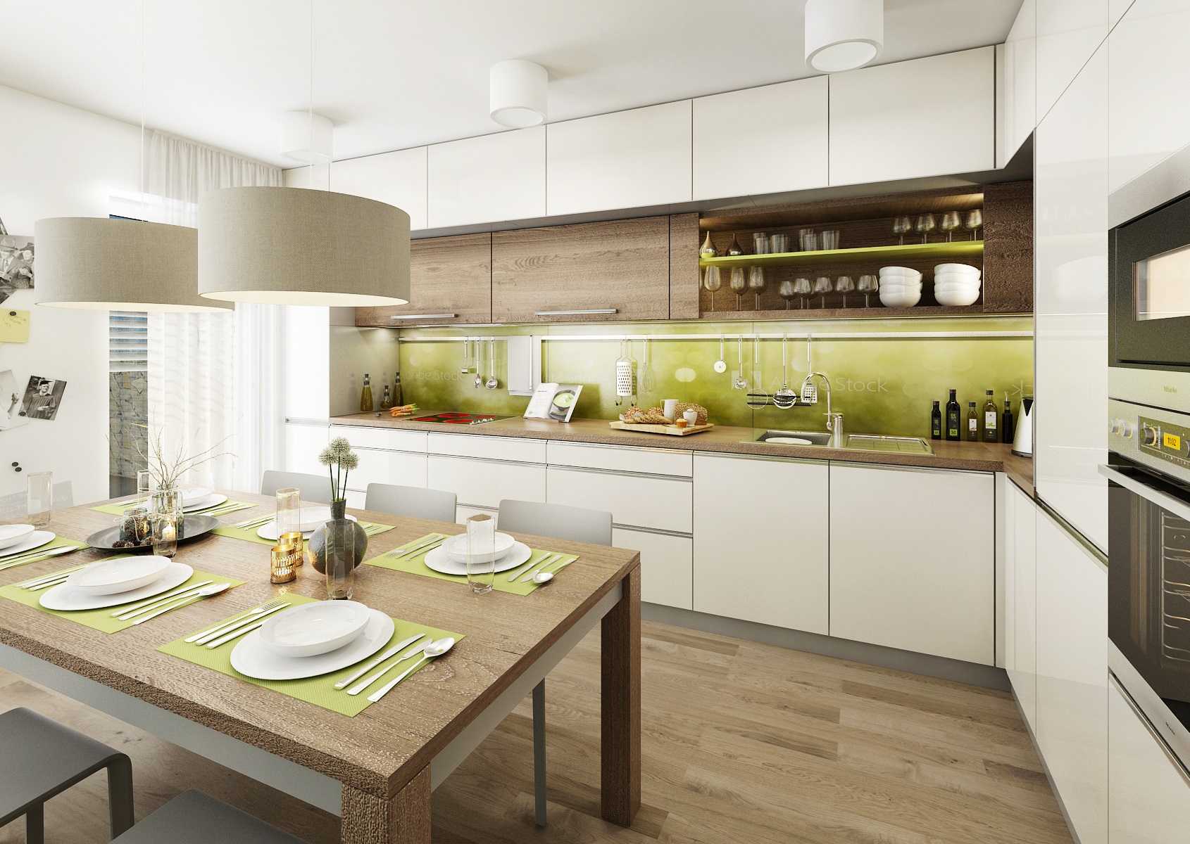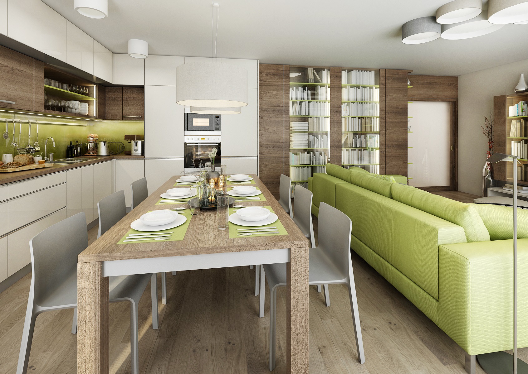 Interiér je v kombinaci bílého lesklého lamina a tmavého kouřového dubu. Pro docílení zajímavého efektu jsou otevřené police vyvedeny v zelené barvě. Zelenou vidíme i pohovce a na obkladu stěny u kuchyňské pracovní desky, kde je použito kalené sklo s polepem na míru (grafika z databanky výrobce). Jako doplňková barva je zvolena jemná šedá na textilu a plastových židlích u jídelního stolu.