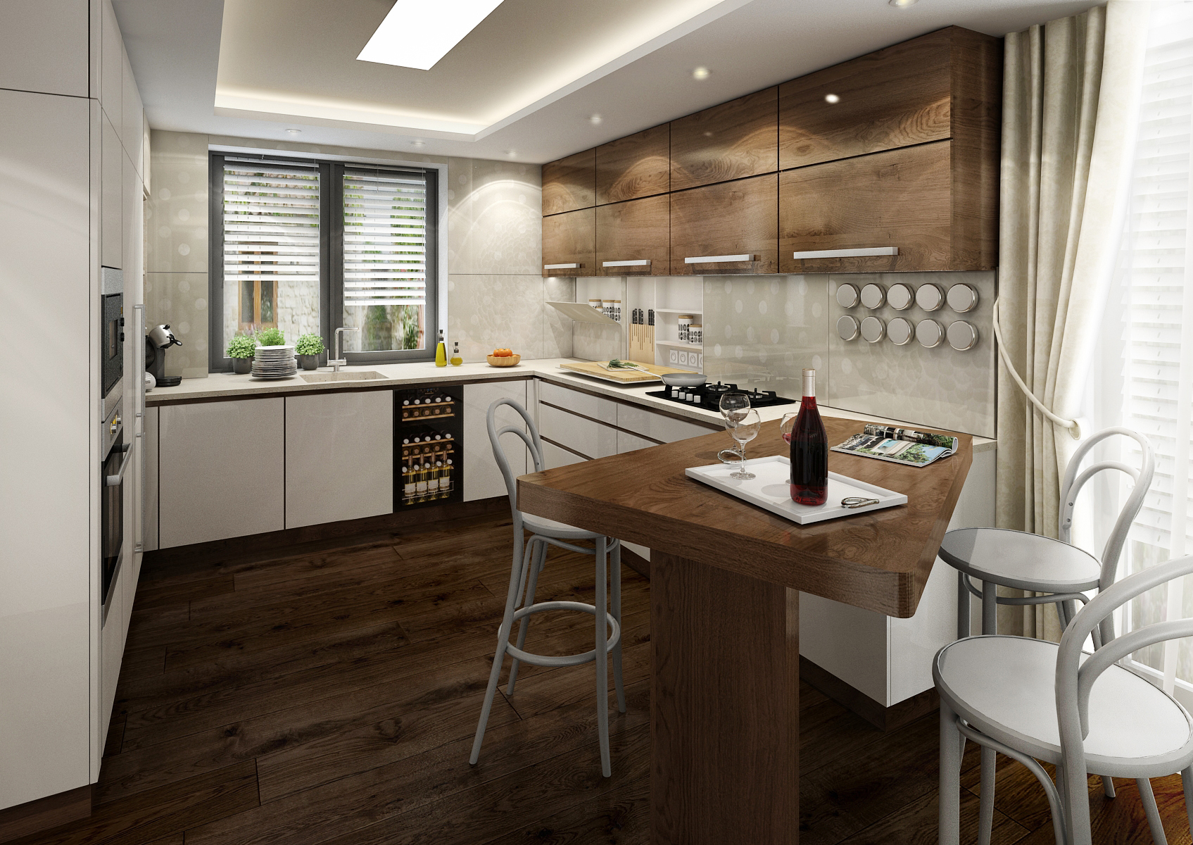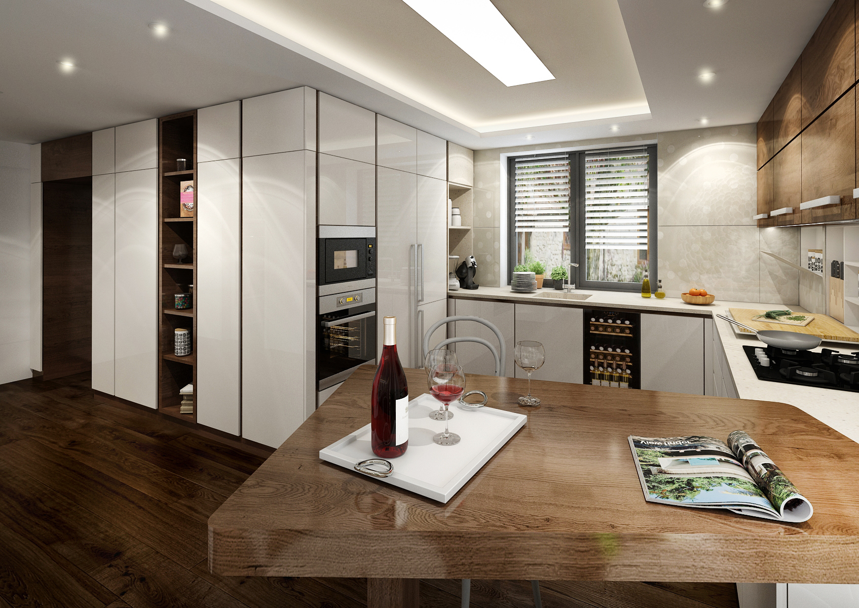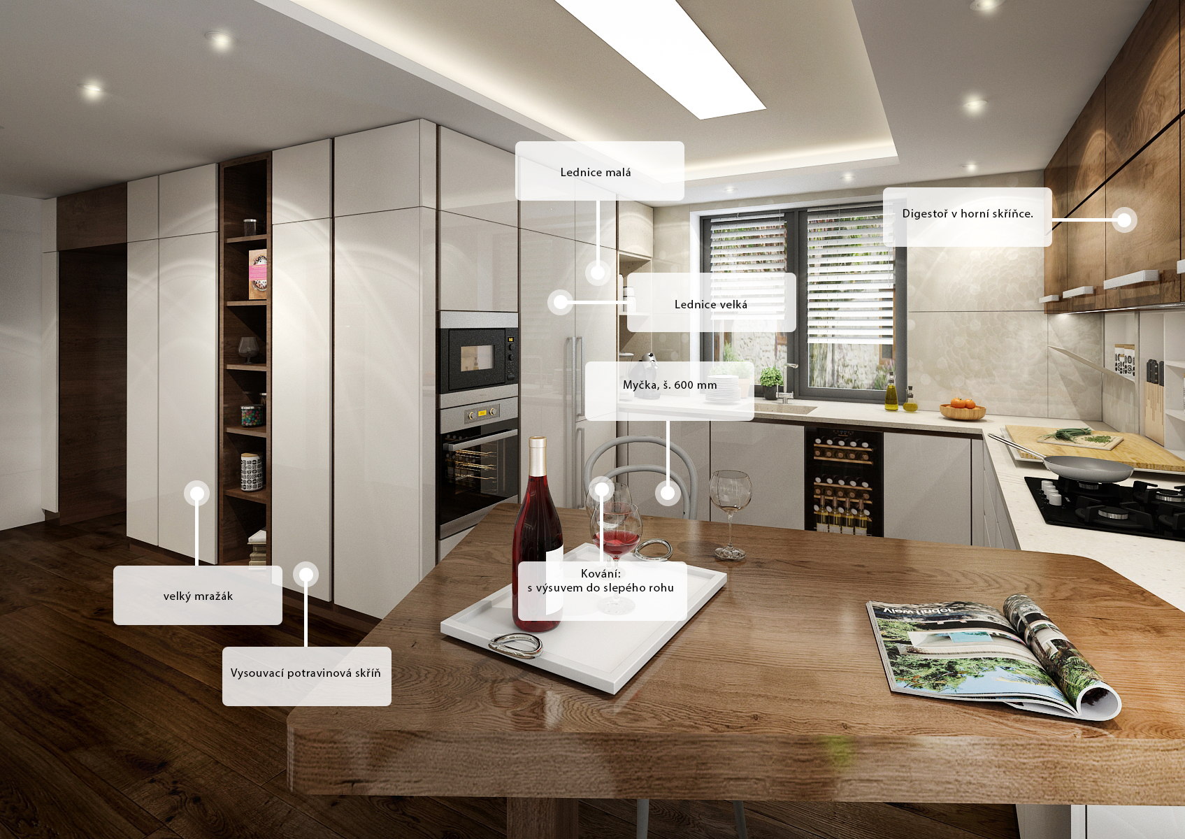 Luxusní kuchyňský prostor s masivní prkennou podlahou tmavě mořeného dubu. Pracovní deska z umělého kamene se skleněným obkladem Lacobel, který převzal grafiku tapety od jídelního stolu. Část obkladu je magnetická a ukrývá výklopný prostor na kuchyňské drobnosti. Na linku navazuje barový stůl atypického tvaru s židlemi značky TON.
