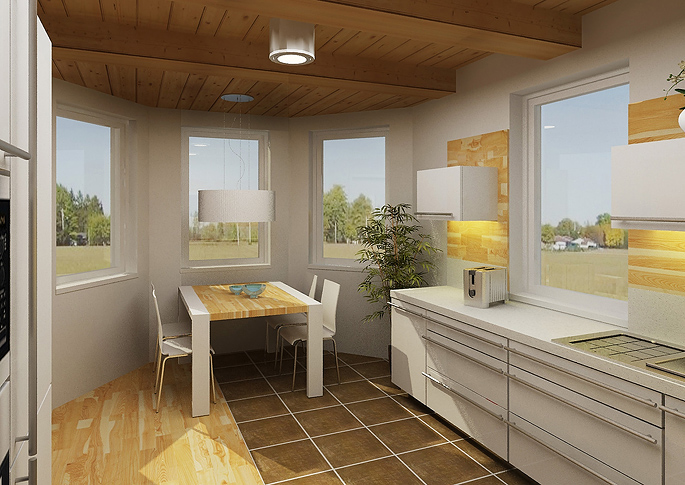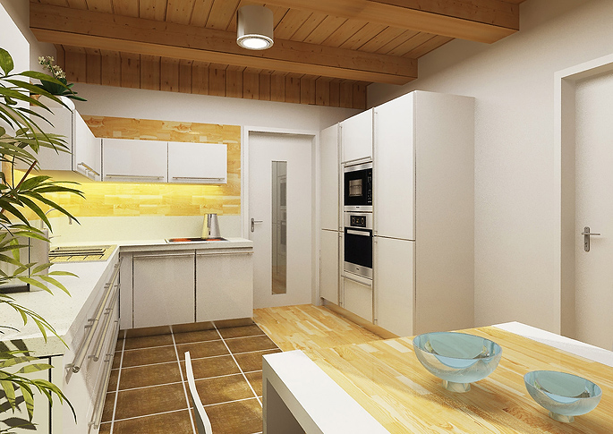 Návrh kuchyně pro dřevostavbu rodinného domku s jídelním stolem umístěným ve výklenku. Podlaha je kombinována s dlažbou a dřevem, které se opakuje ještě na obkladech za kuchyňskou linkou. Zajímavostí v prostoru je trámový strop, který místnost zútulňuje.
