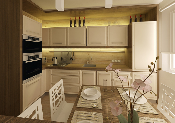 Použité přírodní materiály a zemité barvy v kombinaci s čistě bílou na dvířkách kuchyňské linky podtrhují rustikální ladění kuchyně, aniž by design ztrácel na aktuálnosti. LED podsvícení zvýrazňuje materiál a osvětluje pracovní plochu.