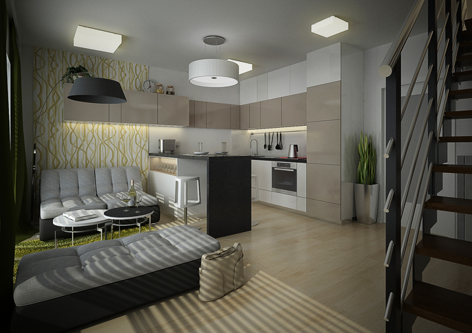 V této místnosti je spojena kuchyňská část i část společenská. Kuchyň je navržena, aby působila vzdušně a elegantně. Kuchyňská linka ve tvaru U přechází v barový pult, který je zároveň určen i ke stolování. Horní skříňky kuchyně pokračují i nad sedací soupravu, kde mohou sloužit jako úložný prostor pro věci denní potřeby. Převažuje bílá barva, tu doplňují antracitová a rudá, které se pak znovu v místnosti opakují, např. na doplňcích a tak prostor působí kompaktně.