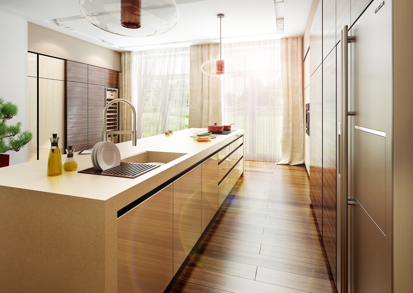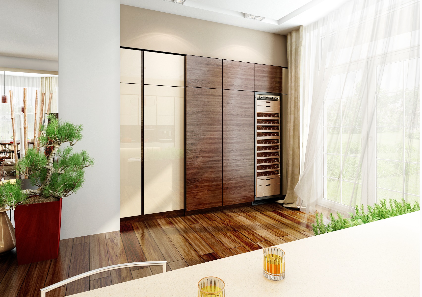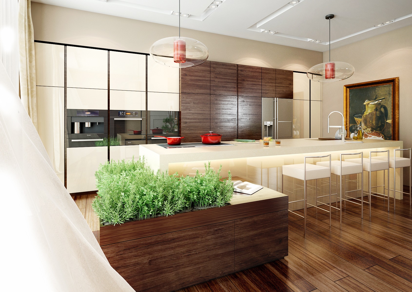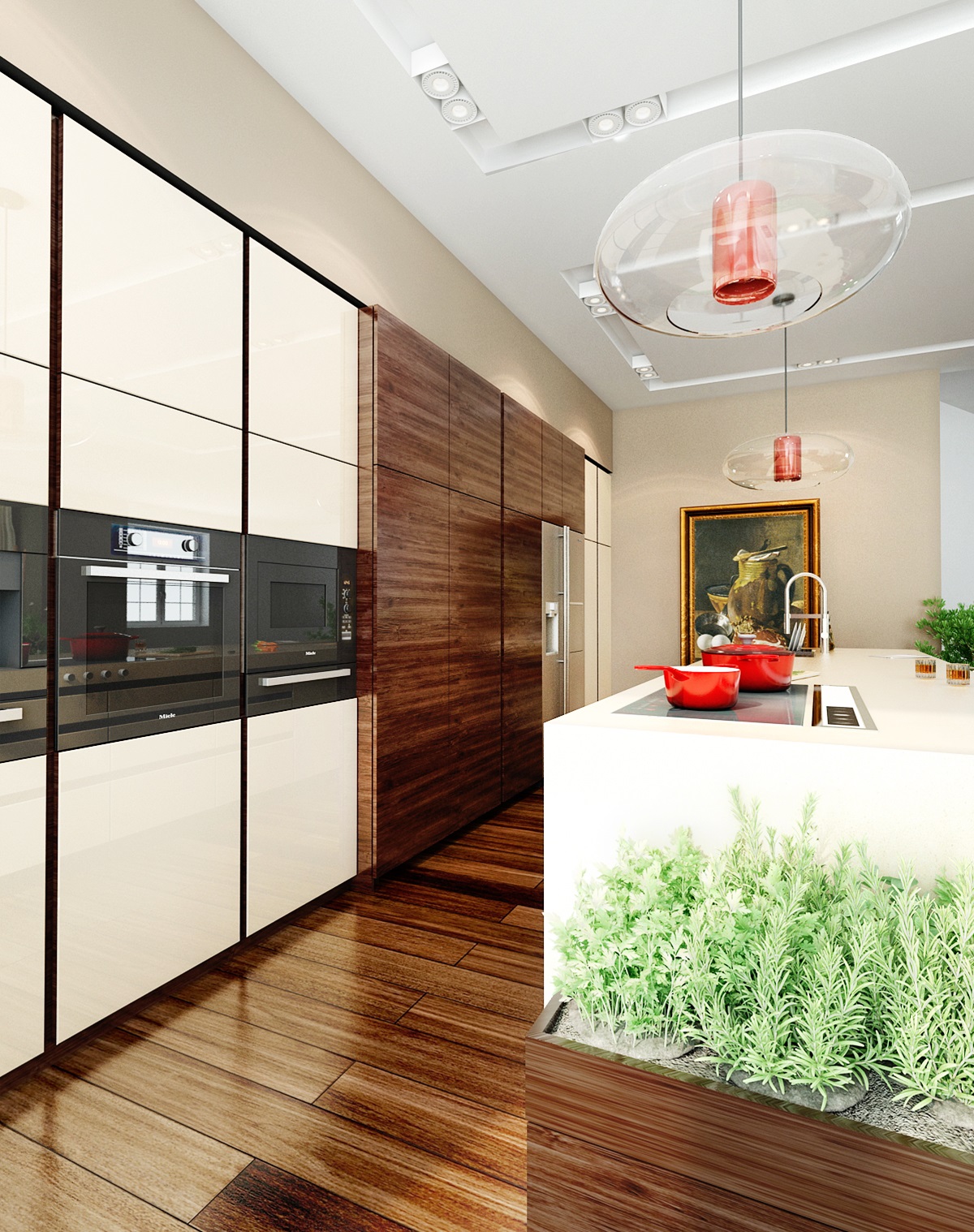 Konkrétně jde o exotickou dřevinu Ipe (Ironwood). Přezdívka Ironwood pochází z jeho extrémní tvrdosti a pevnosti. Prostorově velkorysí kuchyňský ostrůvek s povrchem z umělého kamene Technistone, je současně varnou a pracovní plochou a barovým pultem s posezením. Pomocné kuchyňské spotřebiče jsou schované za posuvnými dvířky vestavěné části kuchyně. V této kuchyni jistě nic nechybí, ani čerstvé bylinky.