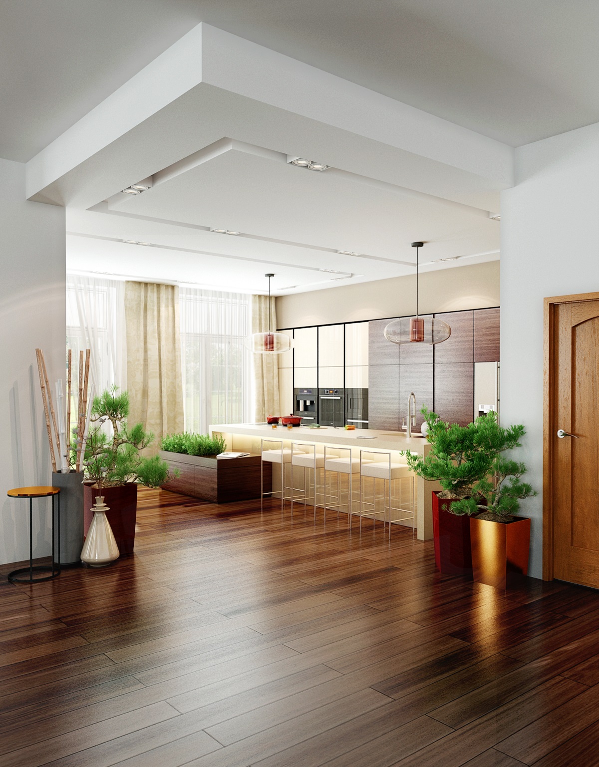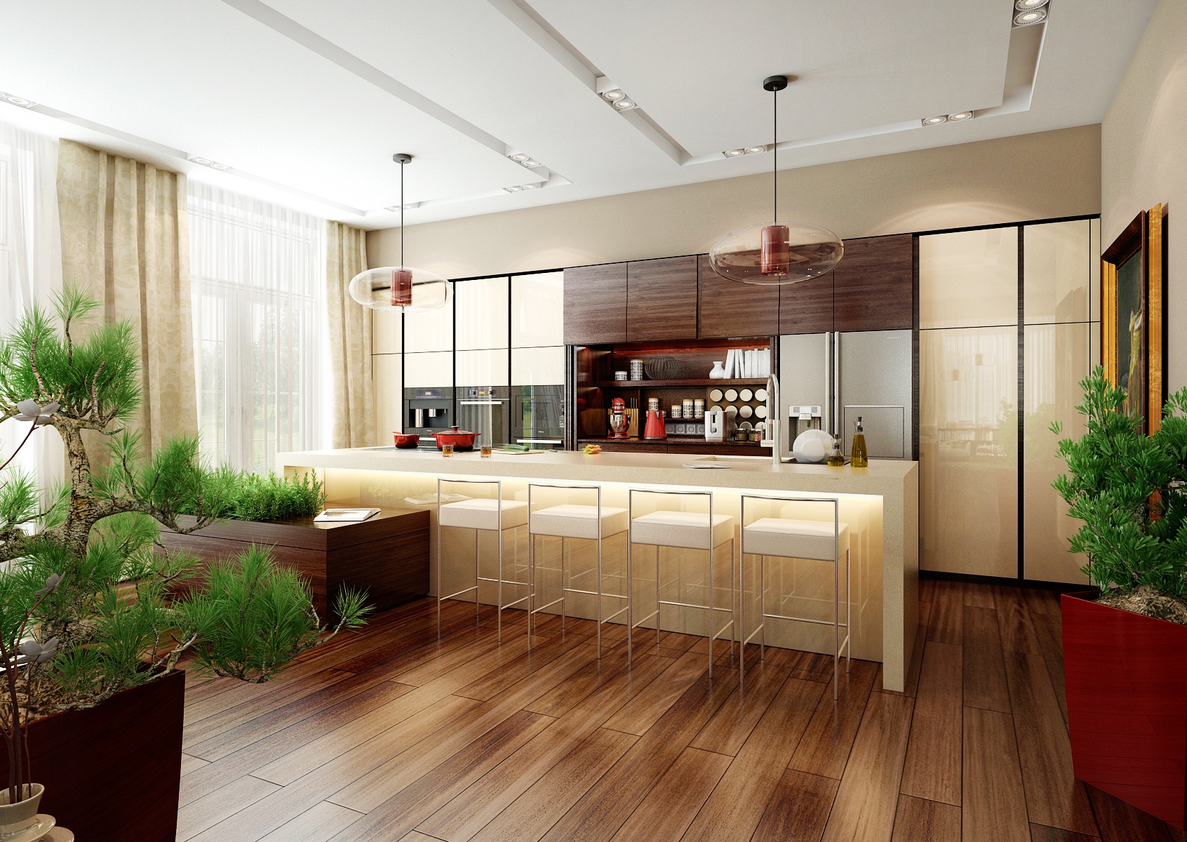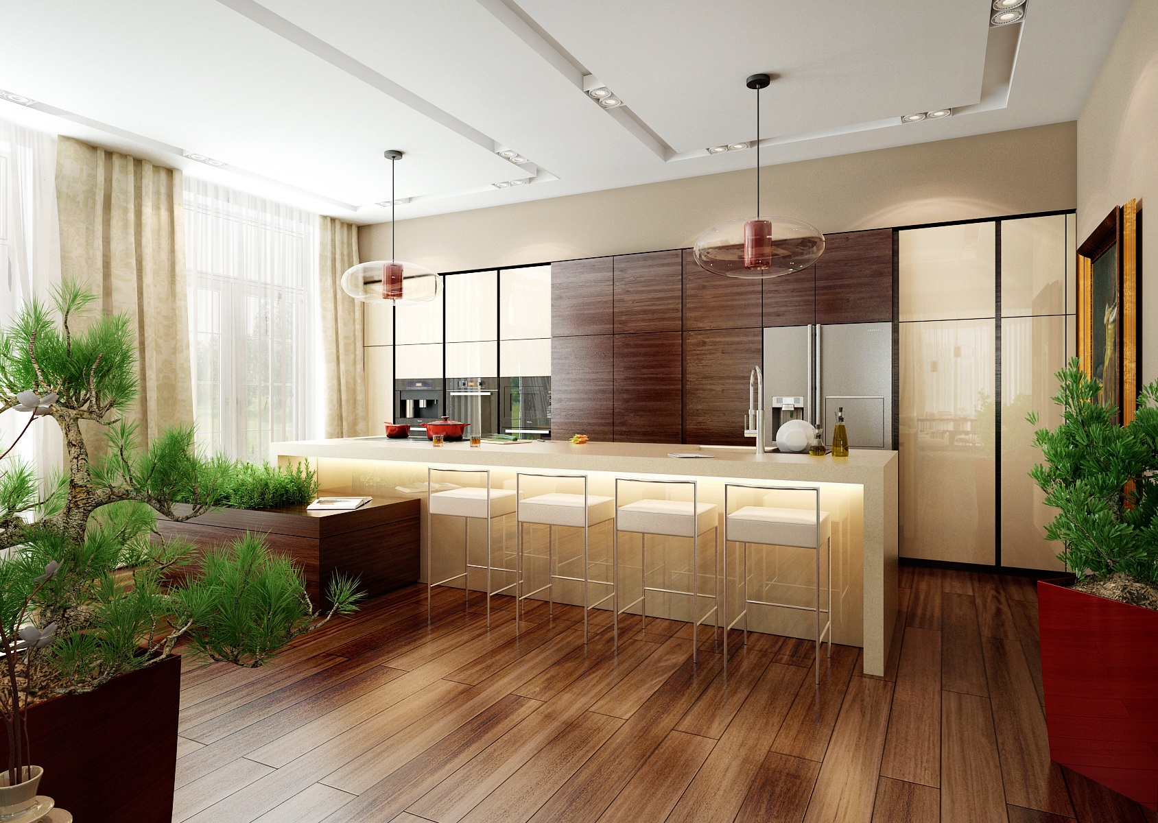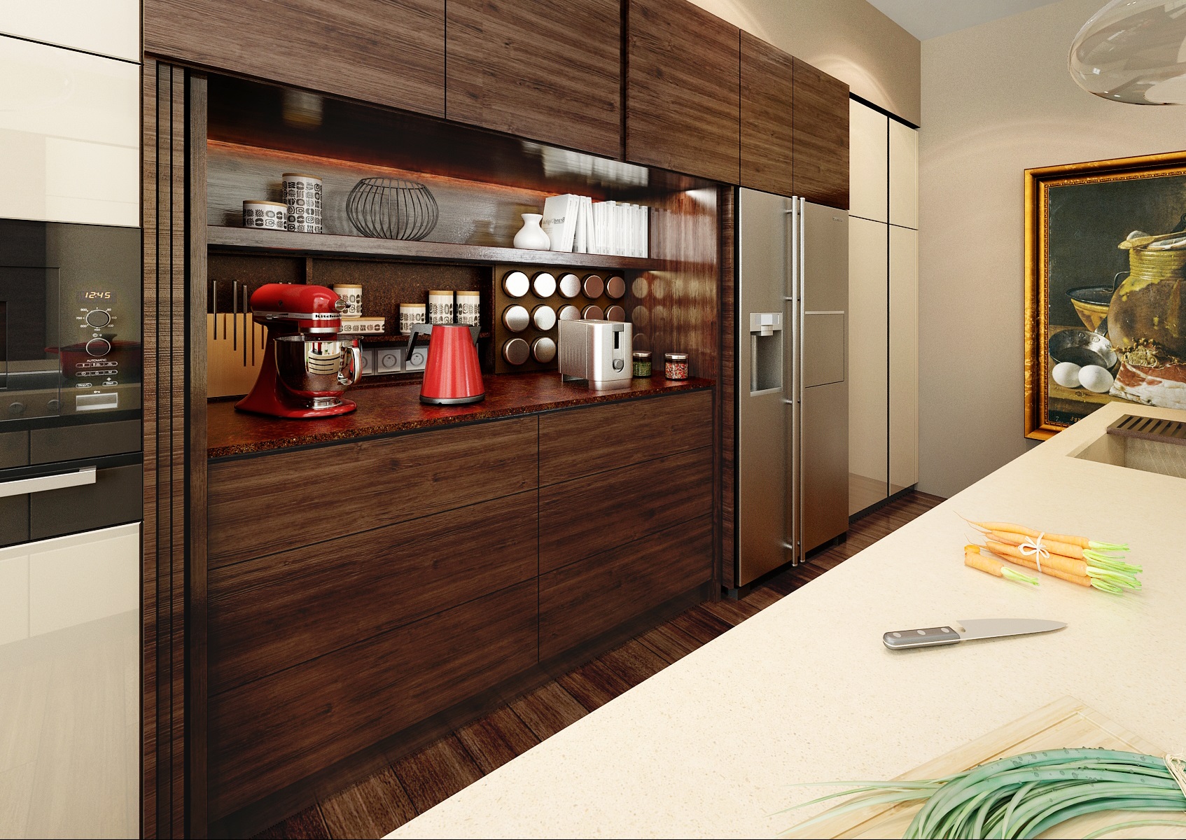 Konkrétně jde o exotickou dřevinu Ipe (Ironwood). Přezdívka Ironwood pochází z jeho extrémní tvrdosti a pevnosti. Prostorově velkorysí kuchyňský ostrůvek s povrchem z umělého kamene Technistone, je současně varnou a pracovní plochou a barovým pultem s posezením. Pomocné kuchyňské spotřebiče jsou schované za posuvnými dvířky vestavěné části kuchyně. V této kuchyni jistě nic nechybí, ani čerstvé bylinky.