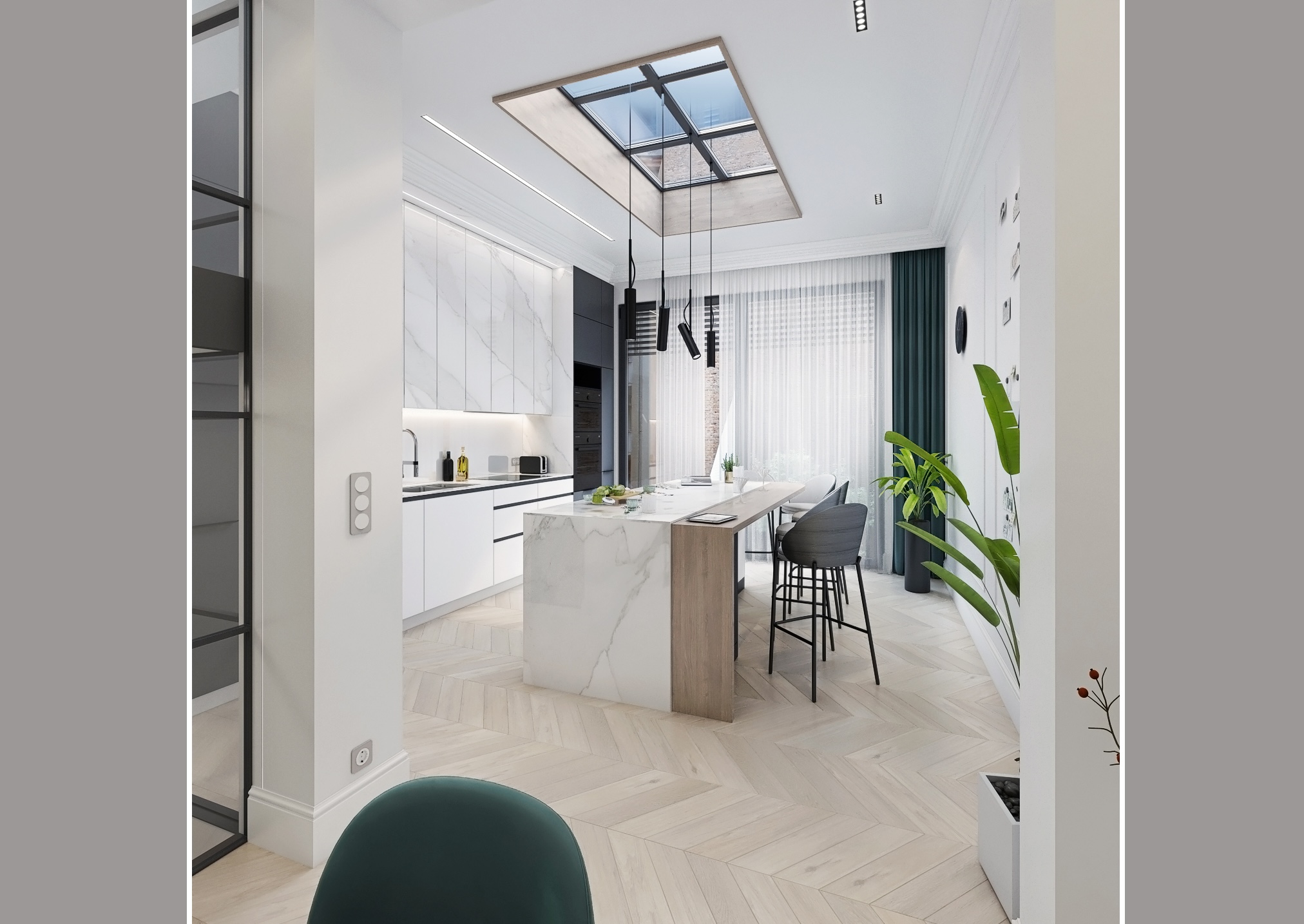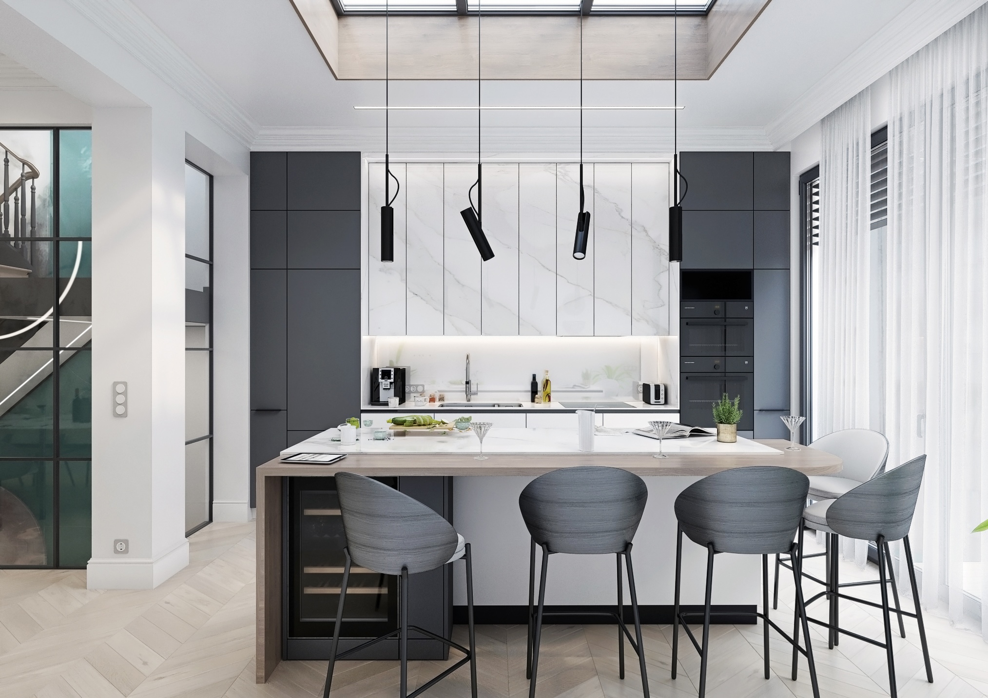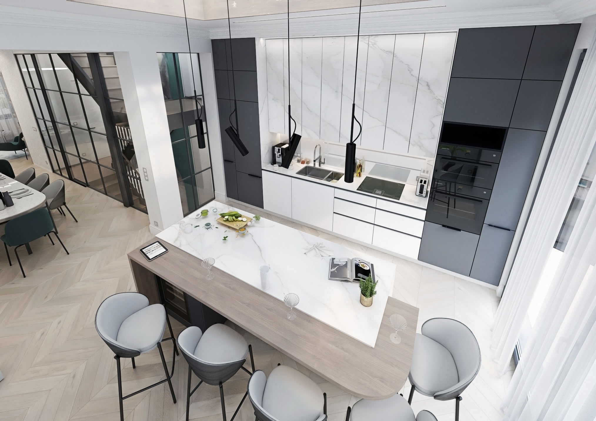 Kuchyně je charakterizována čistými liniemi a kombinací bílého a šedého nábytku, doplněnou o mramorové obklady a pracovní plochy.