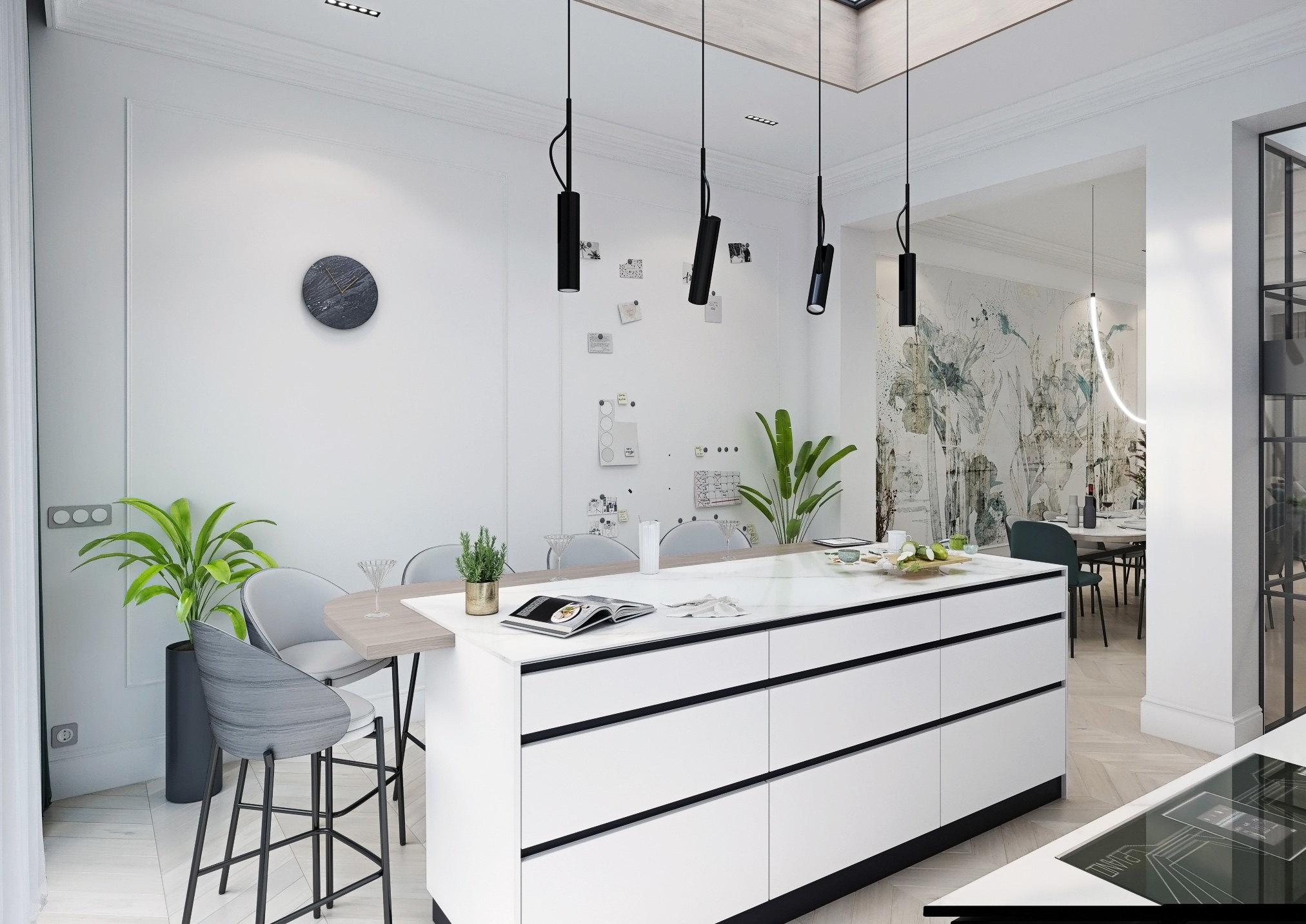 Centrální ostrůvek s přídavným dřevěným pultem slouží jako multifunkční prostor pro přípravu jídel i neformální stolování. Minimalistická závěsná svítidla a pečlivě umístěné dekorace dodávají prostoru nadčasový vzhled. Prostor propojuje otevřený design, který umožňuje přirozené světlo, a černé skleněné dveře vizuálně propojují kuchyň s ostatními částmi domu.