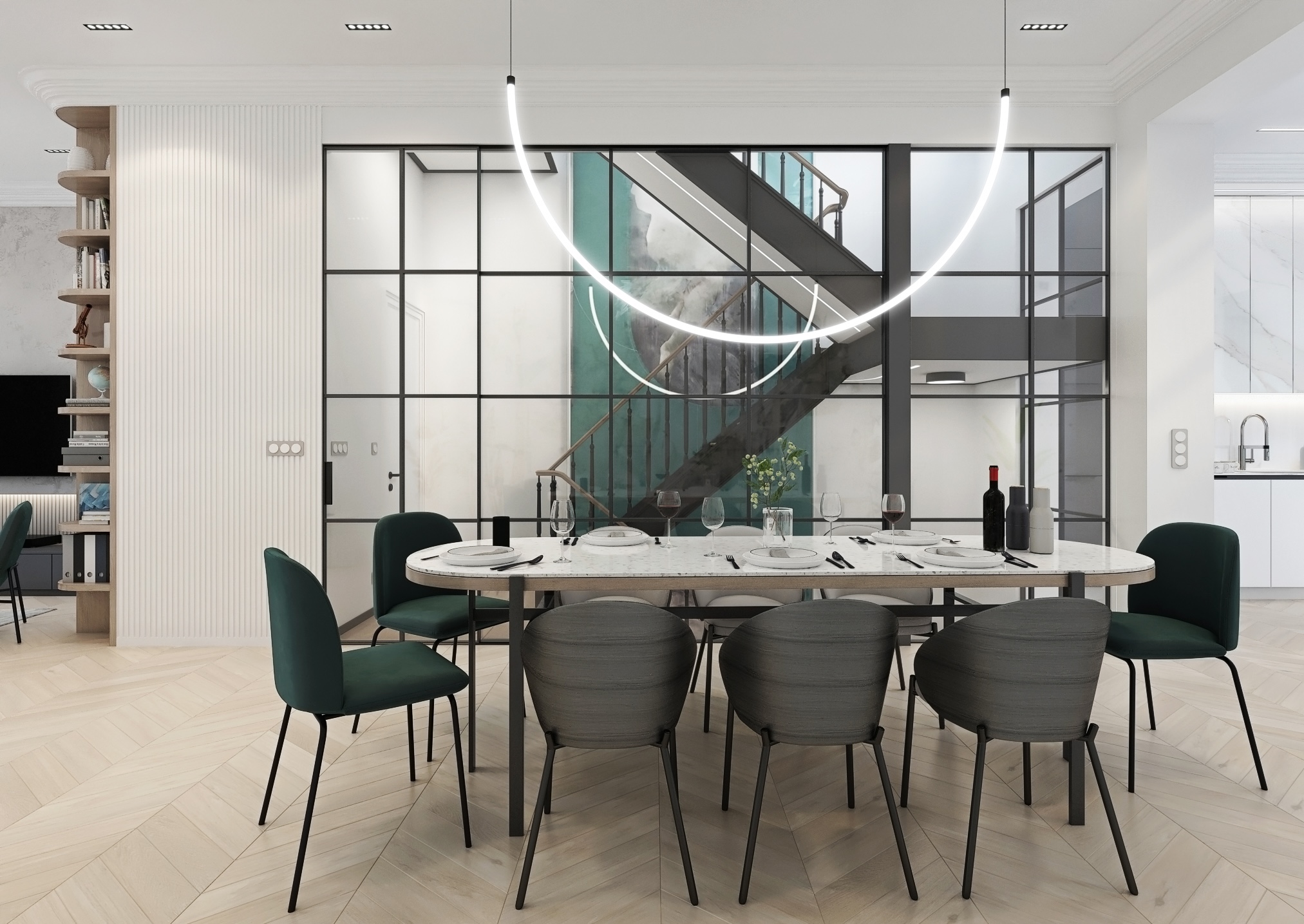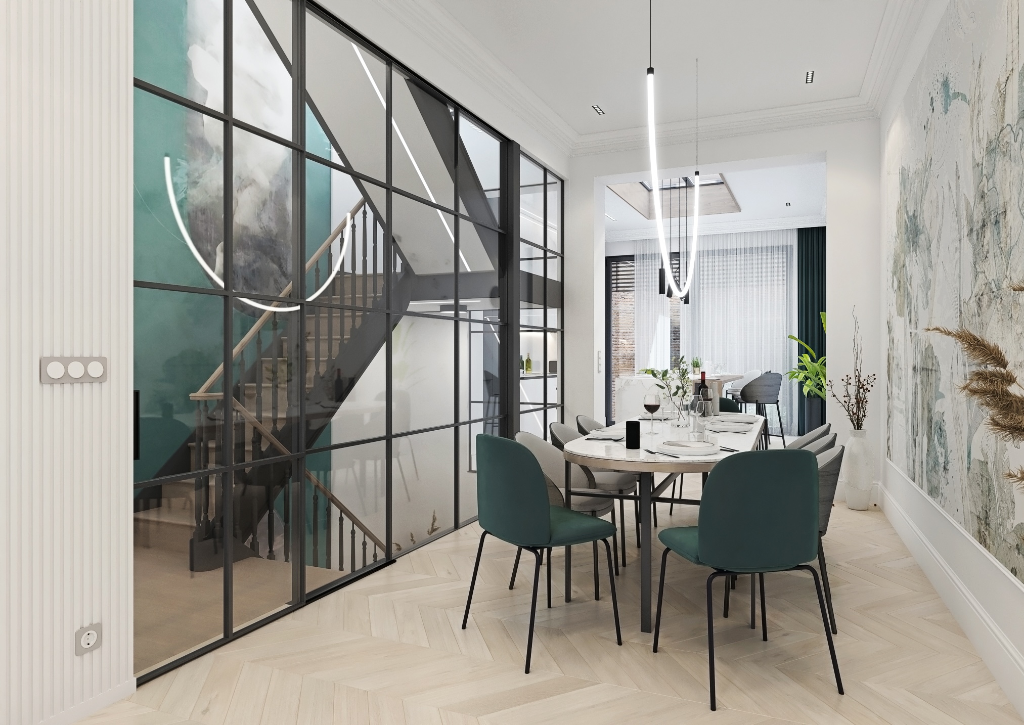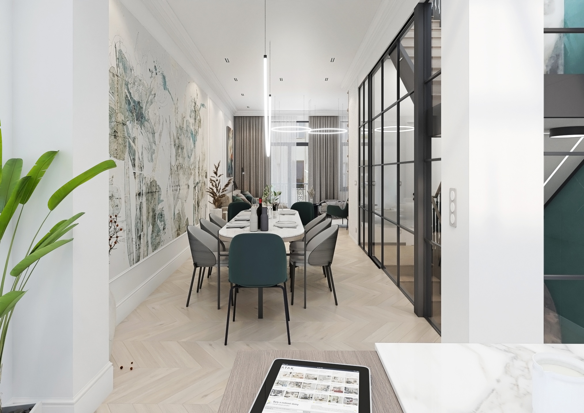 Navazující jídelna je zařízena v moderním stylu s důrazem na detail. Stůl obklopují pohodlné židle s látkovým čalouněním v zeleném odstínu, který kontrastuje s neutrálními tóny podlahy a stěn. Dominantou prostoru je abstraktní nástěnná malba, která prostoru dodává umělecký akcent. Díky vysokým stropům a elegantnímu osvětlení působí jídelna vzdušně a sofistikovaně, ideální pro rodinná setkání i společenské události.