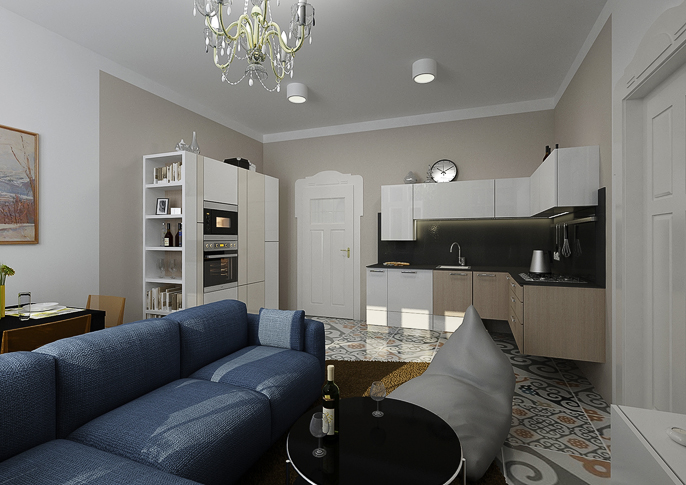 Kuchyně jednoduchých tvarů v bílém a krémovém laminu je zakomponována do stavby v secesním stylu. Její součástí je úložný díl pro knihy, podlaha je provedena z velkoformátové dlažby historizujícího vzoru.