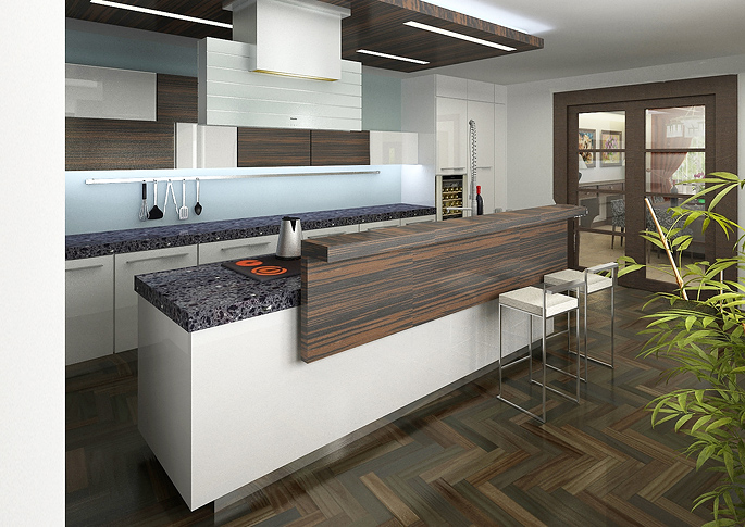 Moderní interiér kuchyně, kde je kombinována bílá barva s kamennou deskou a tmavým dřevodekorem je sladěn s rustikálním designem jídelny.