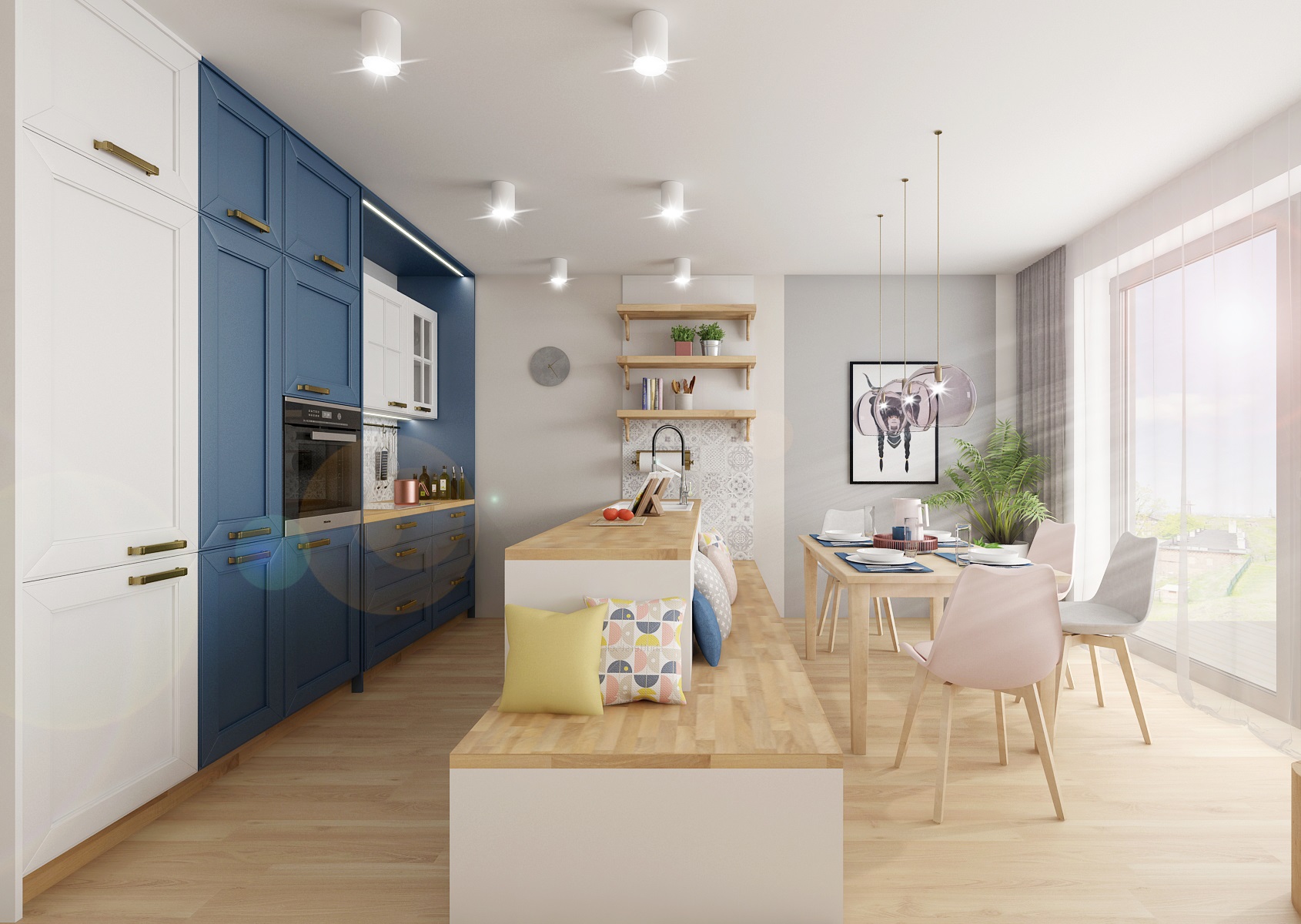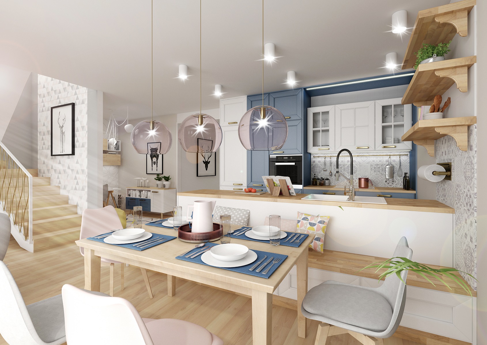 Dvě varianty návrhu kuchyně v retro stylu s kazetovými dvířky ve svěžím provedení modré a bílé. Pracovní deska je z dubové spárovky, tj. masivní deska vyrobená z k sobě na tupo napojovaných (cinkovaných) dubových hranolů, broušená a ošetřená roztokem lněného oleje nebo lakem. Stylovost podtrhuje i použití nástěnného obkladu ze série Majolika.