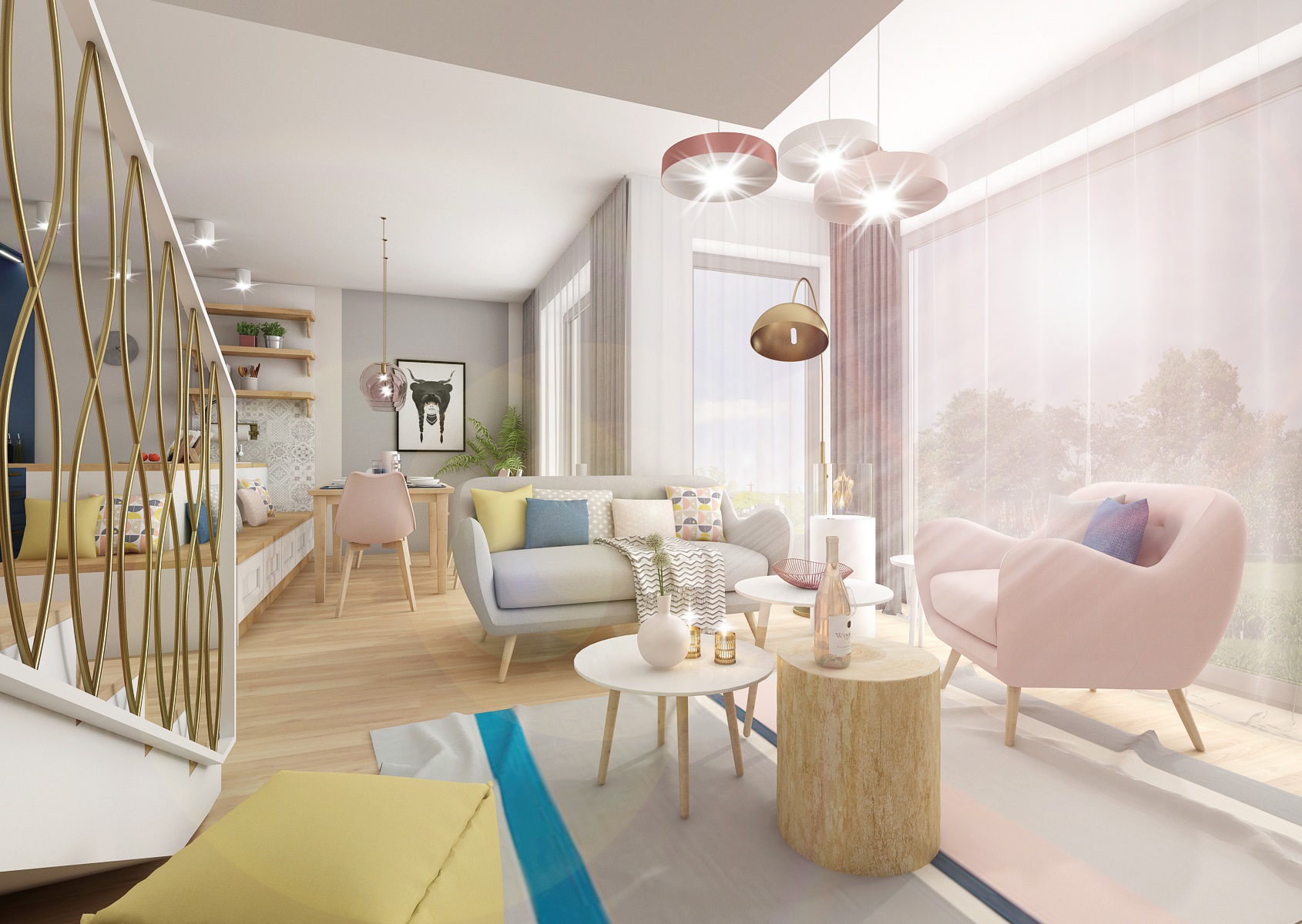 Barevné židle u jídelního stolu doplňuje i lavice, která přiléhá ke kuchyňskému ostrůvku. Nabízí místo pro sezení a úložný prostor pod výklopným sedákem.