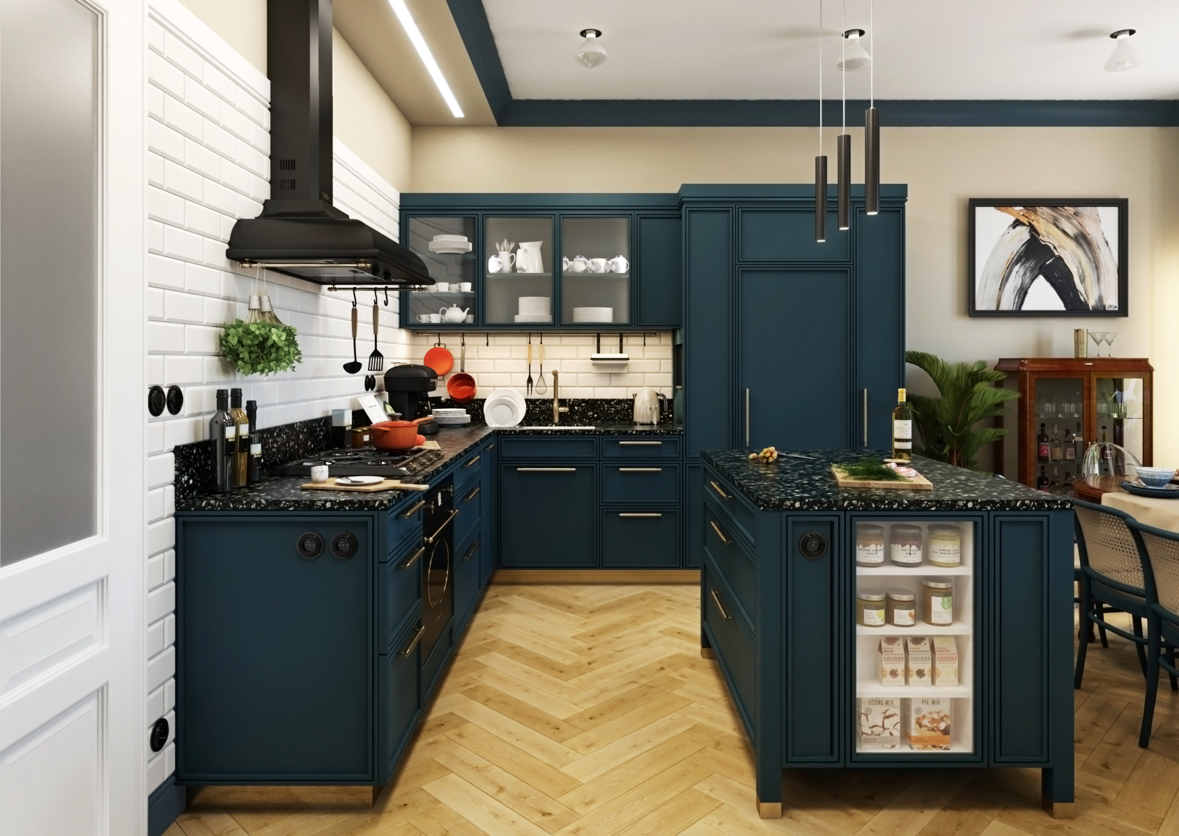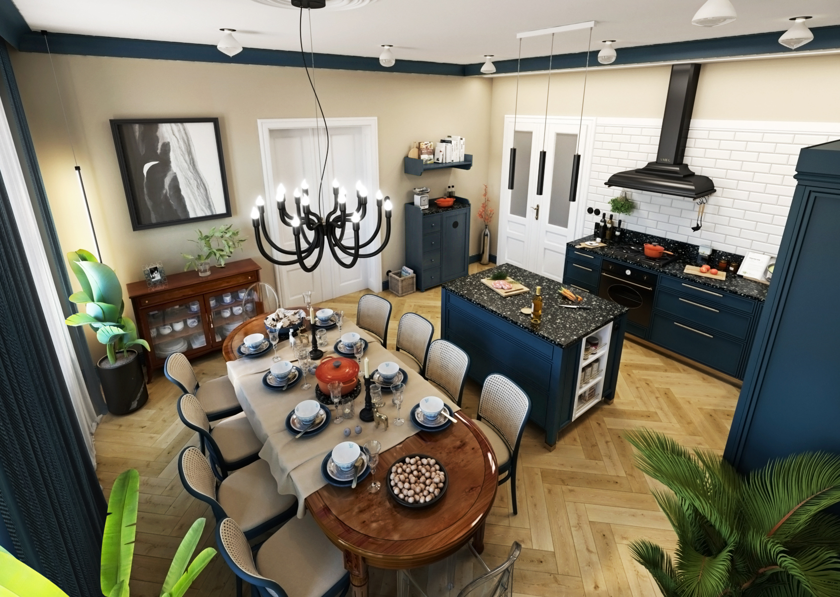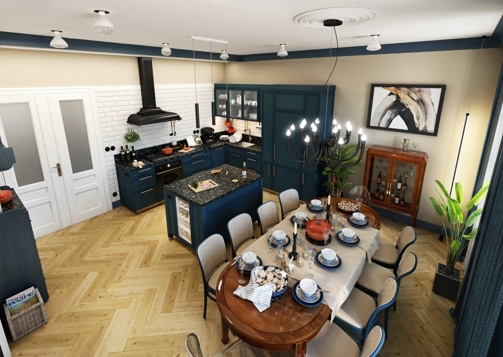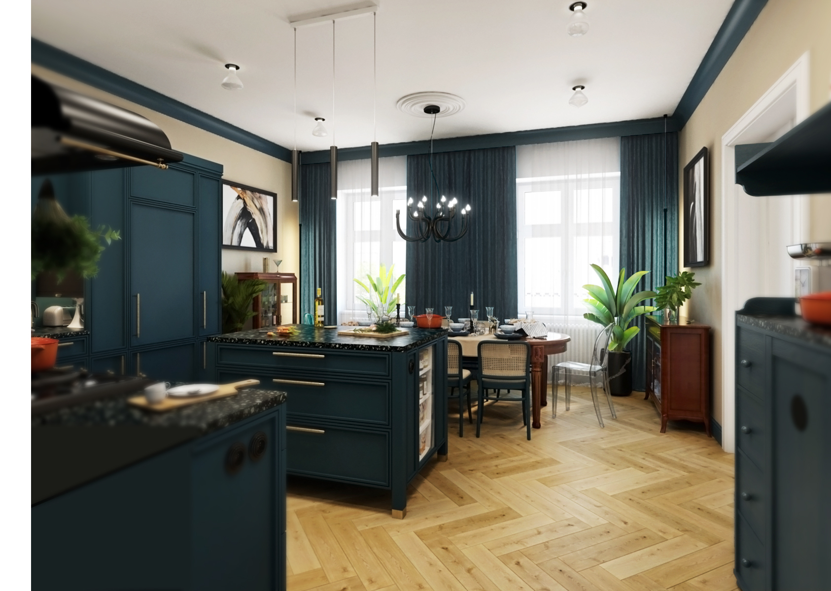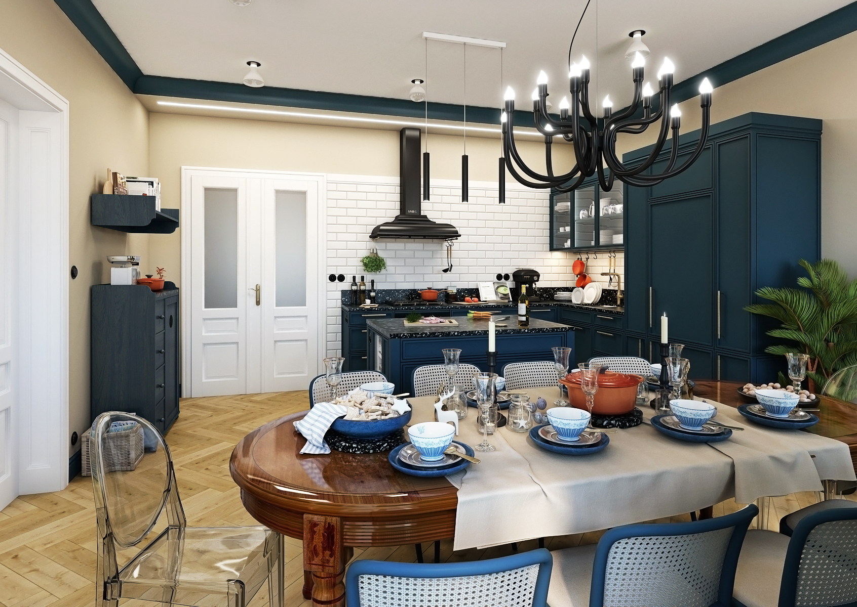V designu se odráží inspirace klasickými anglickými kuchyněmi s kamennou deskou jak ve vybavení kuchyně, tak i v jídelní části. Sytá modrá je využita i na stropních lištách kolem celé místnosti, která je osvětlována jak pomocí závěsných lustrů, tak stropními reflektory či stropními světelnými lištami.