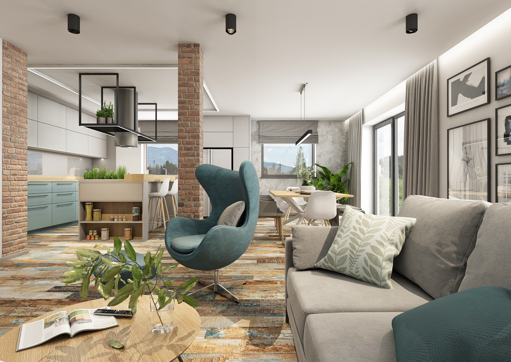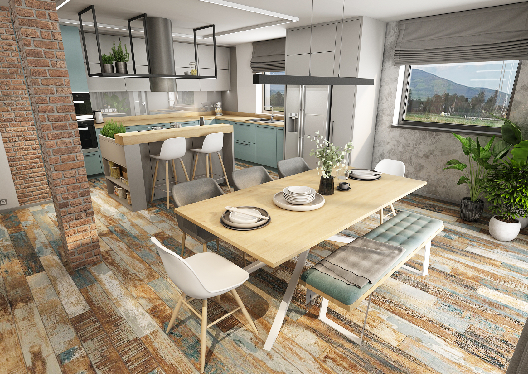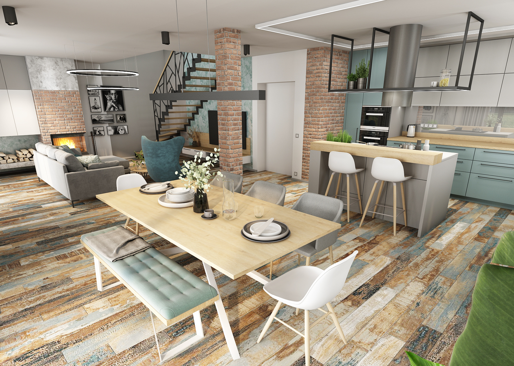 Obytnému prostoru mimo odstíny modré a šedé barvy dominuje také rustikální podlaha, která na sobě nese tóny použitých barev v interiéru.