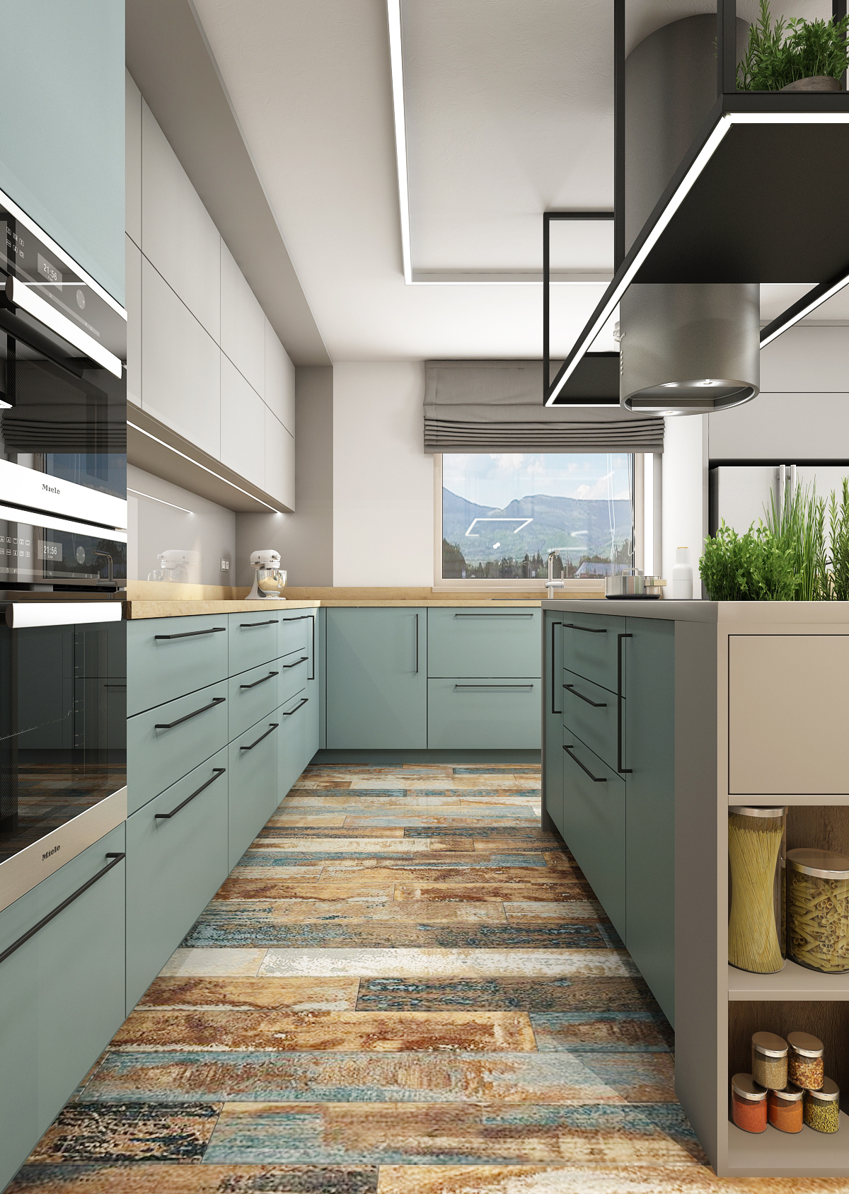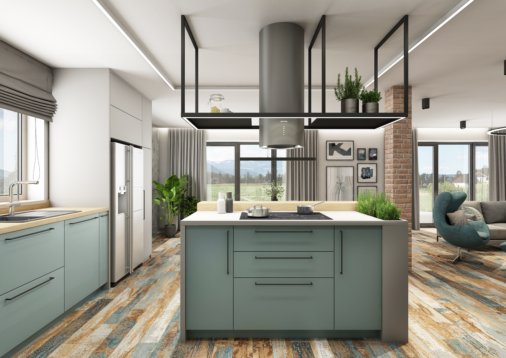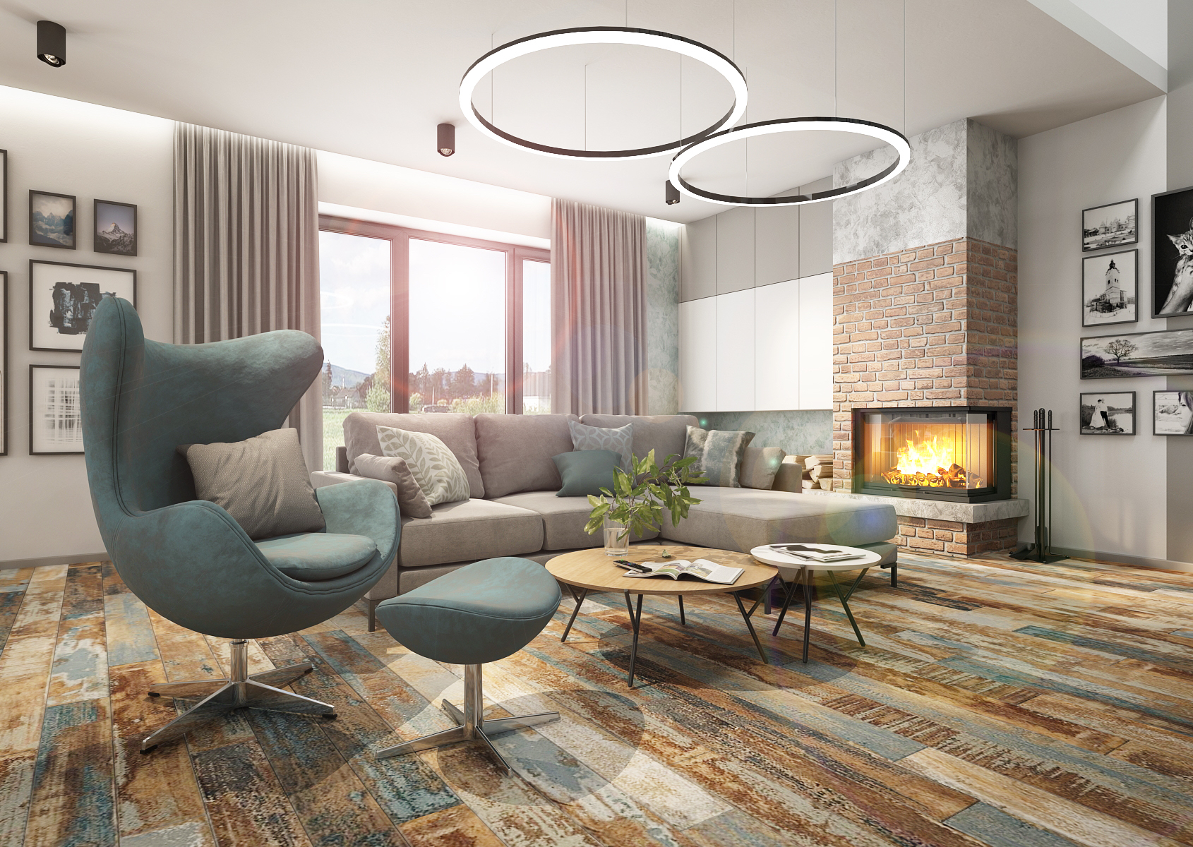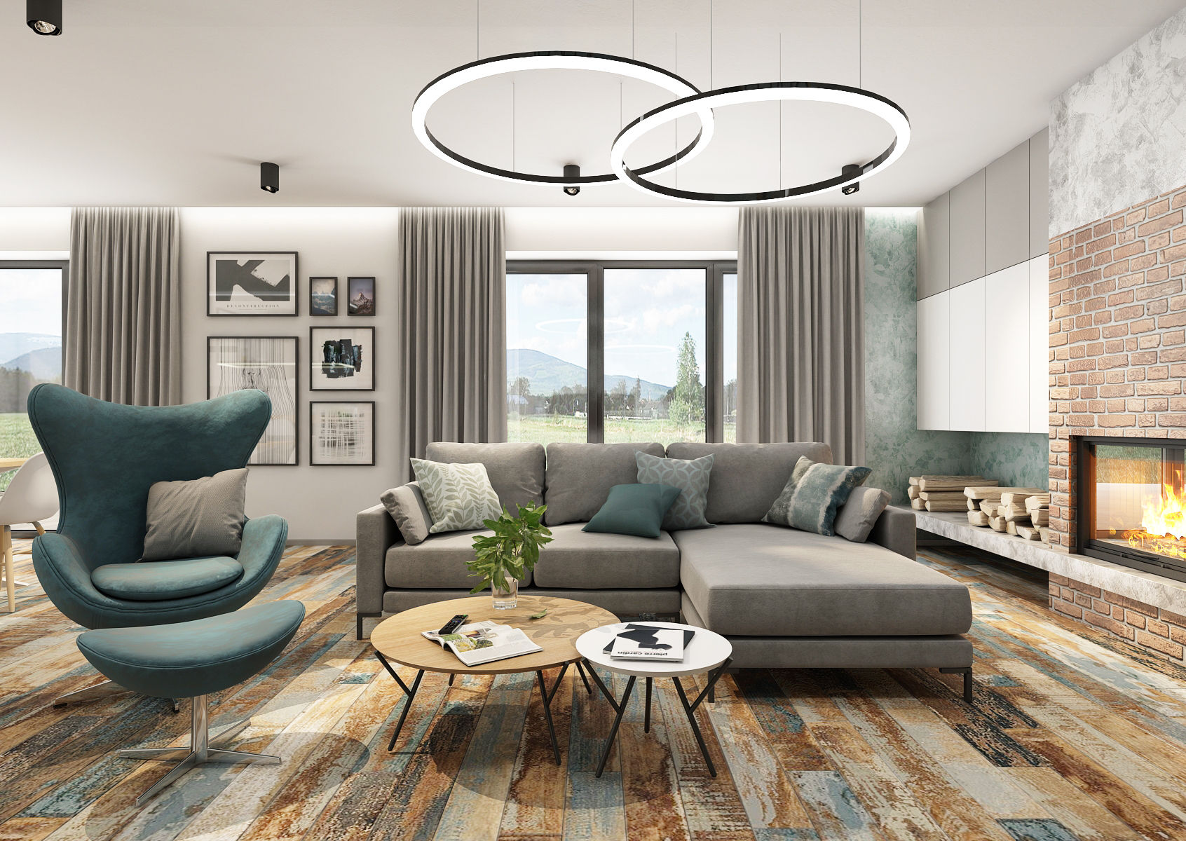 Obytnému prostoru mimo odstíny modré a šedé barvy dominuje také rustikální podlaha, která na sobě nese tóny použitých barev v interiéru.