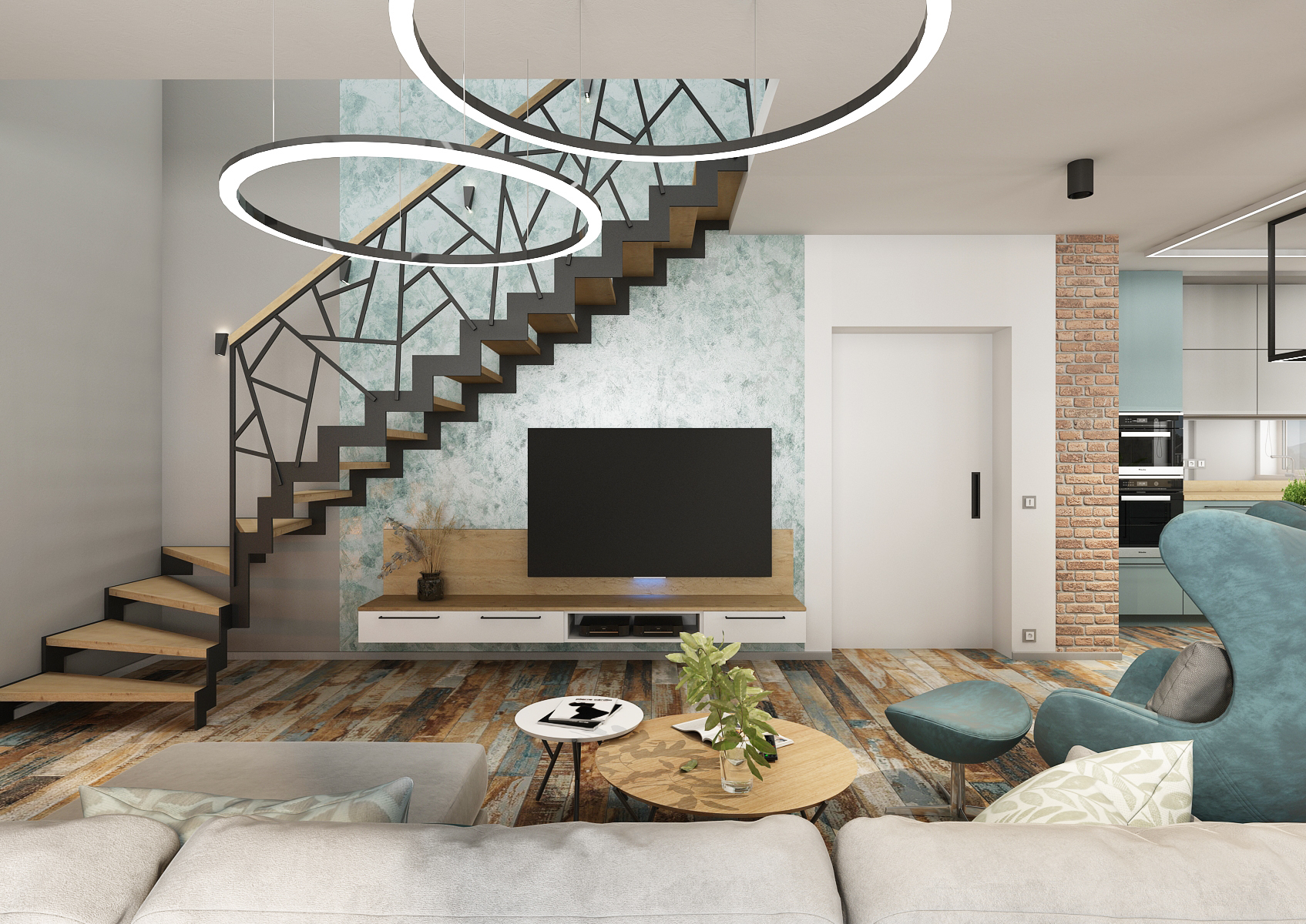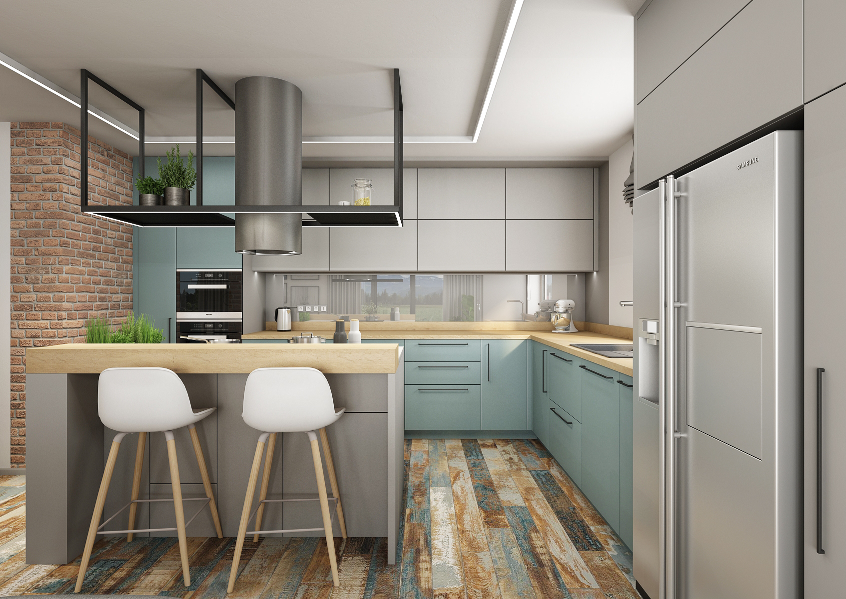 Kromě cihlového obkladu, který se nachází i na středovém sloupu či částech stěn, jsou zdi zpestřeny i šedou a modrou betonovou stěrkou.