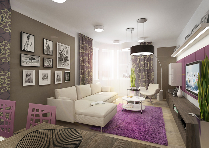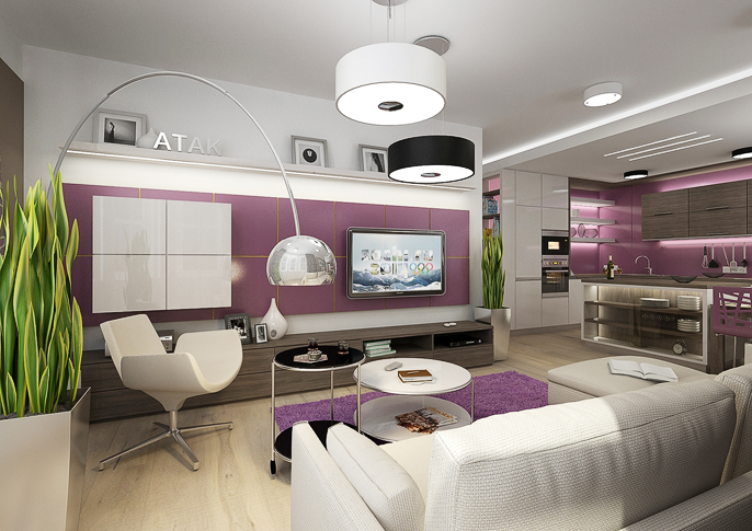 Obývací pokoj s kuchyní v zemitých barvách a fialovou barvou. U kuchyňské linky je fialový obklad lacobel a dvířka v kombinaci bílá s wenge. Lacobel se pak opakuje ještě v obkladě za TV.