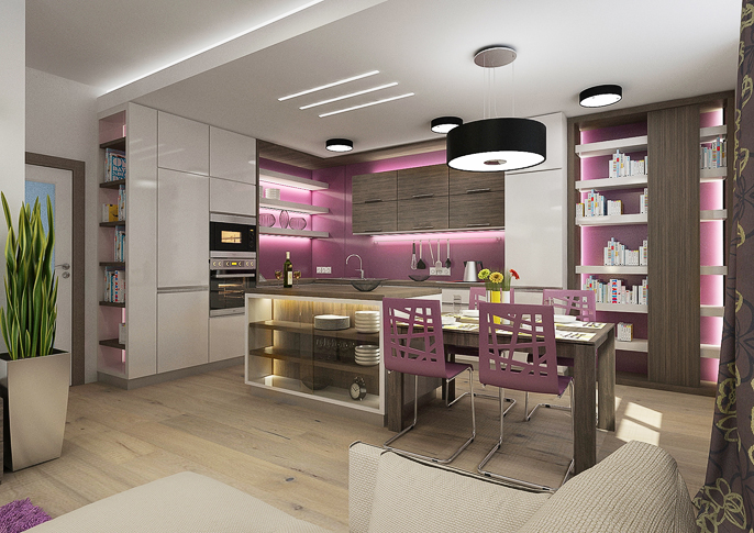 Design interiéru kuchyně v zemitých barvách s fialovou